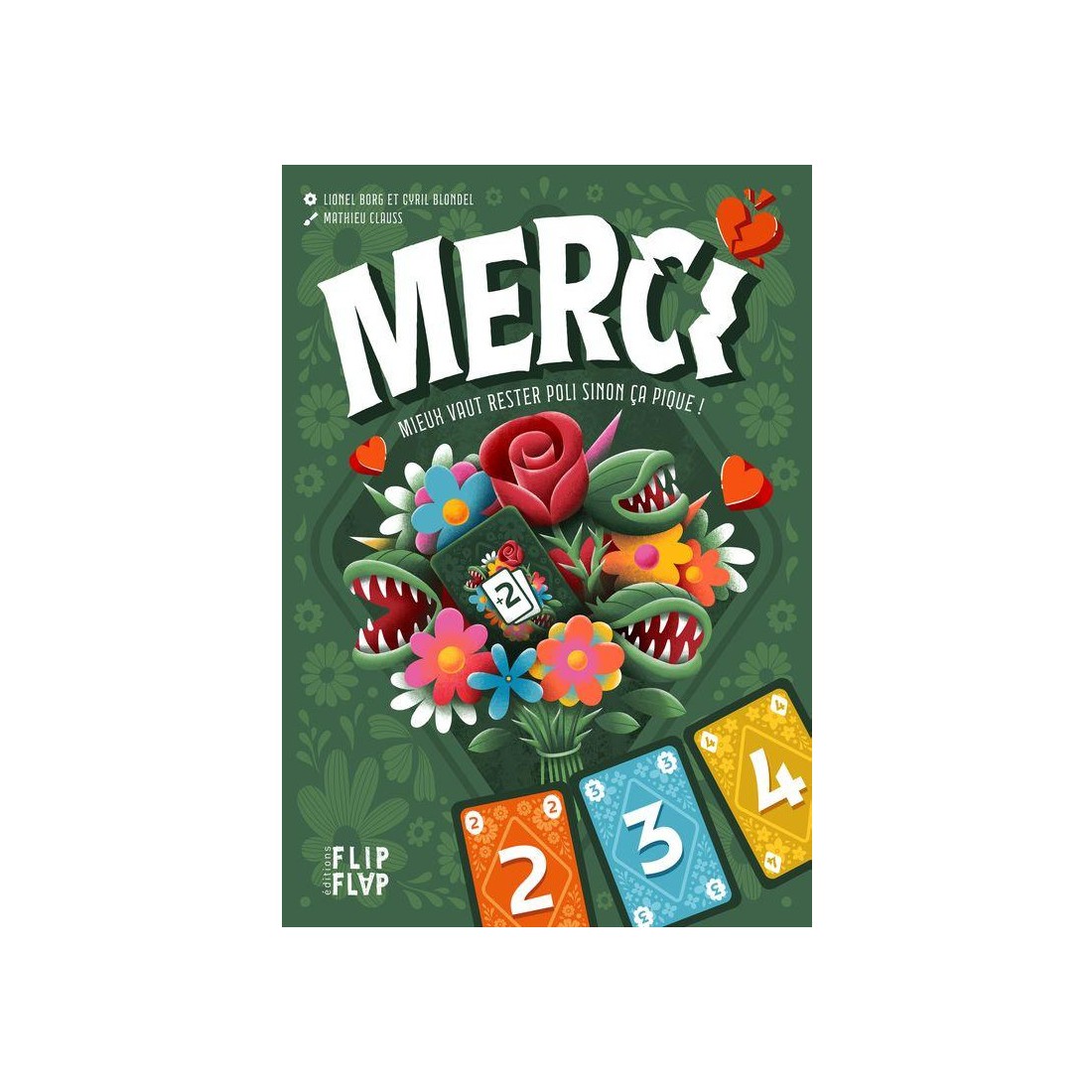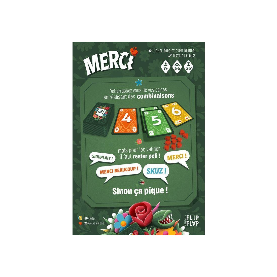 Merci est un jeu de politesse qui pique ! Débarrassez-vous de vos cartes en déclenchant des effets qui imposent à vos adversaires de reprendre des cartes... et qui en plus doivent vous dire Merci. Et gare à ceux qui oublient ! Mieux vaut rester poli !