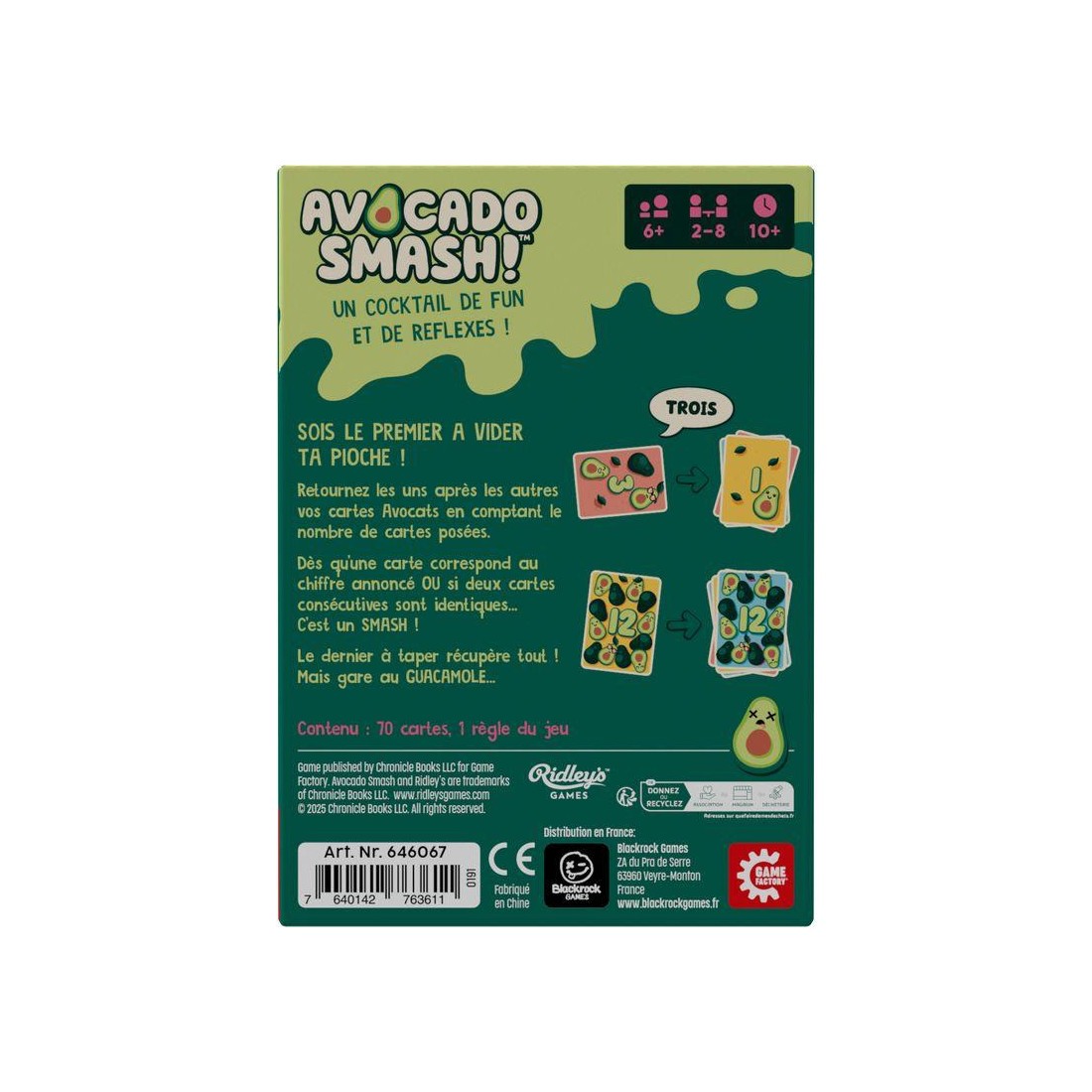 Dans ce jeu de rapidité, vous devez compter les avocats de haut en bas taper au bon moment. Le plus lent prend toutes les cartes du milieu. Mais personne ne veut de Guacamole sur les mains, alors méfiez-vous des cartes spéciales qui ne cessent de gâcher le jeu.