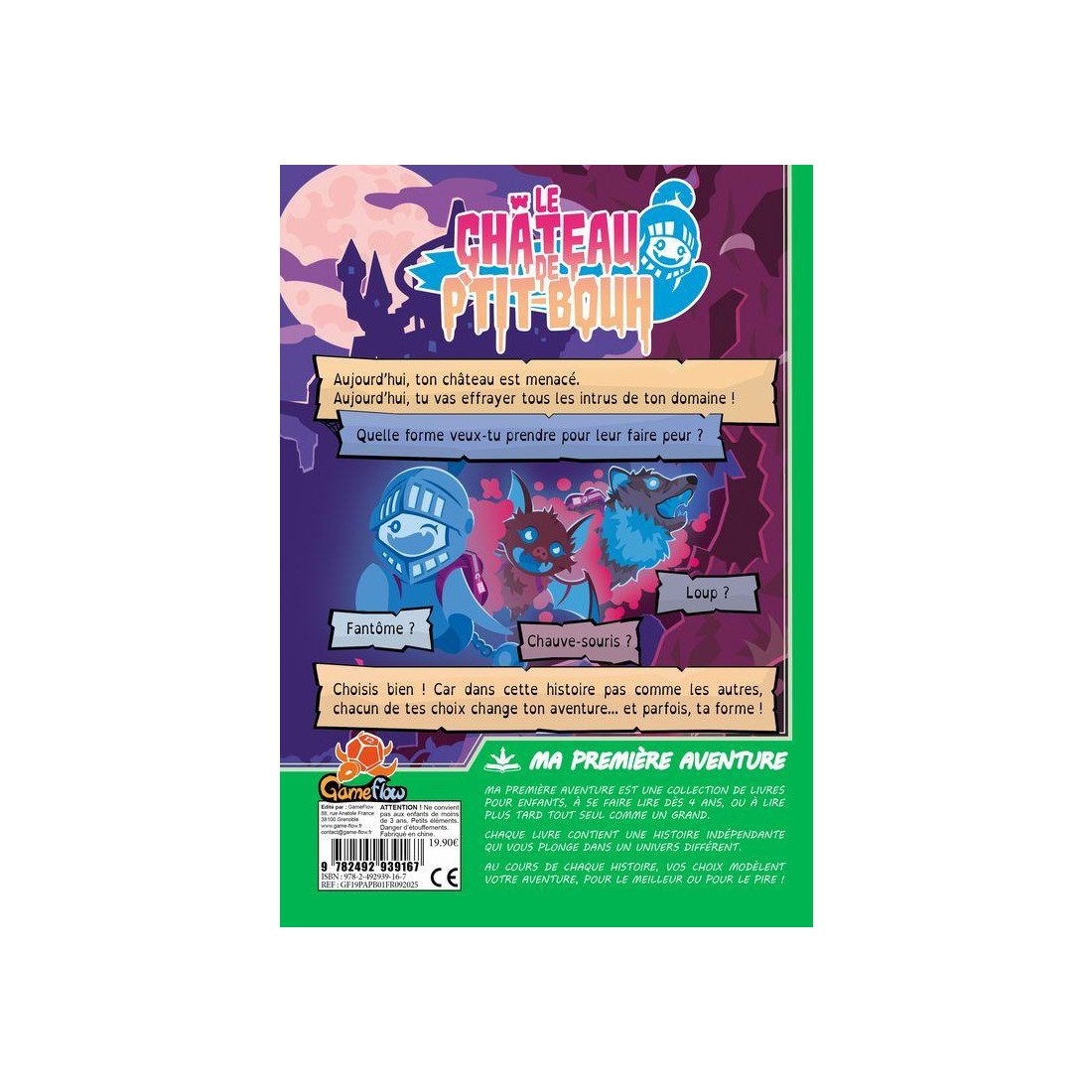 Dans Ma Première Aventure – Le Château de P’tit Bouh, tu rentres chez toi après de longues vacances... mais horreur ! Des humains sont en train de transformer ton vieux château en parc d’attractions ! Il est temps d’agir. Apprends la magie de transformation et choisis la forme qui t’aidera à faire fuir les intrus et stopper les travaux.
