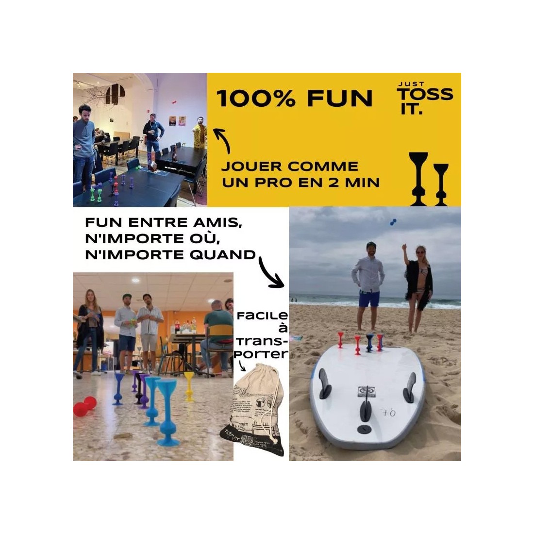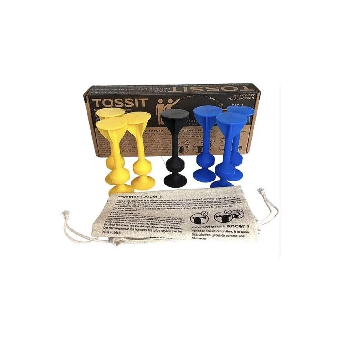 Tossit est un jeu d'adresse qui propose un mix entre pétanque et fléchette, se joue à l'intérieur ou à l'extérieur, au sol ou à la verticale. Jouez sur toutes les surfaces lisses autour de vous en intérieur comme en extérieur ! Table, sol, plafond, fenêtre, voiture… Le set Tossit original qu'il vous faut pour débuter et vous amuser entre potes, en famille, en soirée, ou même au bureau entre deux pauses !