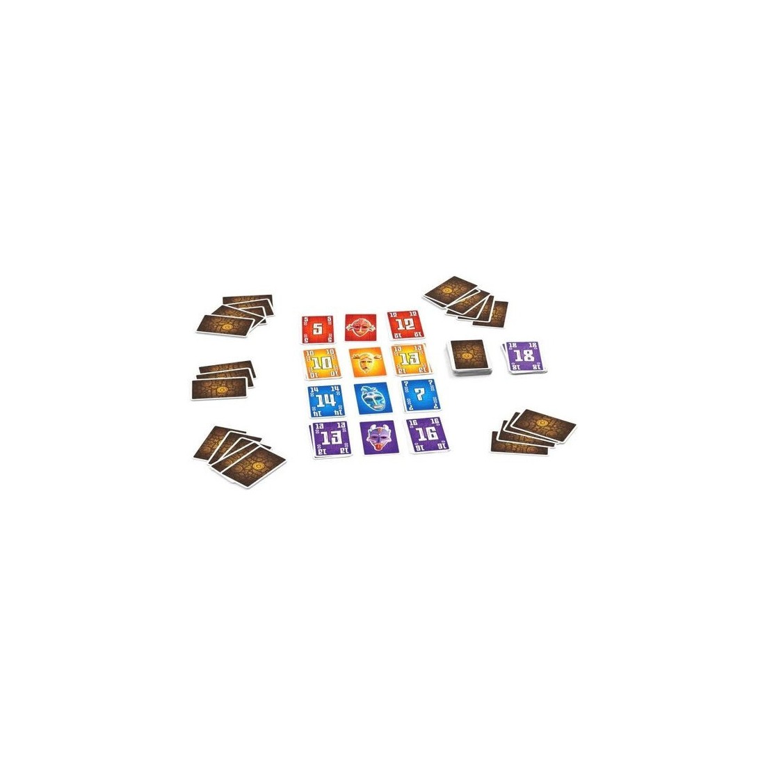 Au début de la partie, une carte totem de chaque couleur est placée au centre de la table, encadrée par deux cartes indiquant une valeur.À votre tour, choisissez une rangée et posez l'une de vos cartes de couleur correspondante sur la grille ainsi créée, en recouvrant l'une des cartes chiffre déjà présentes.