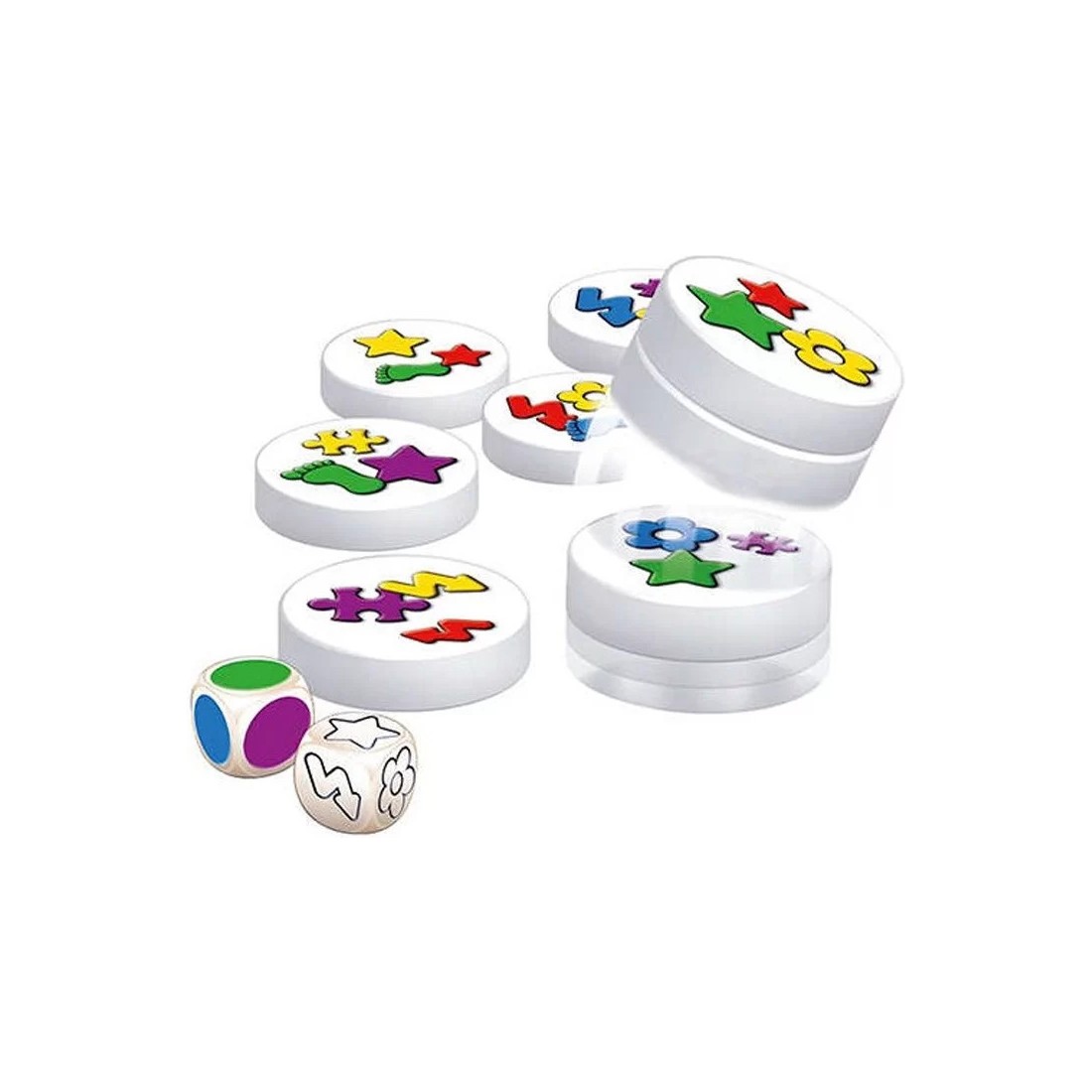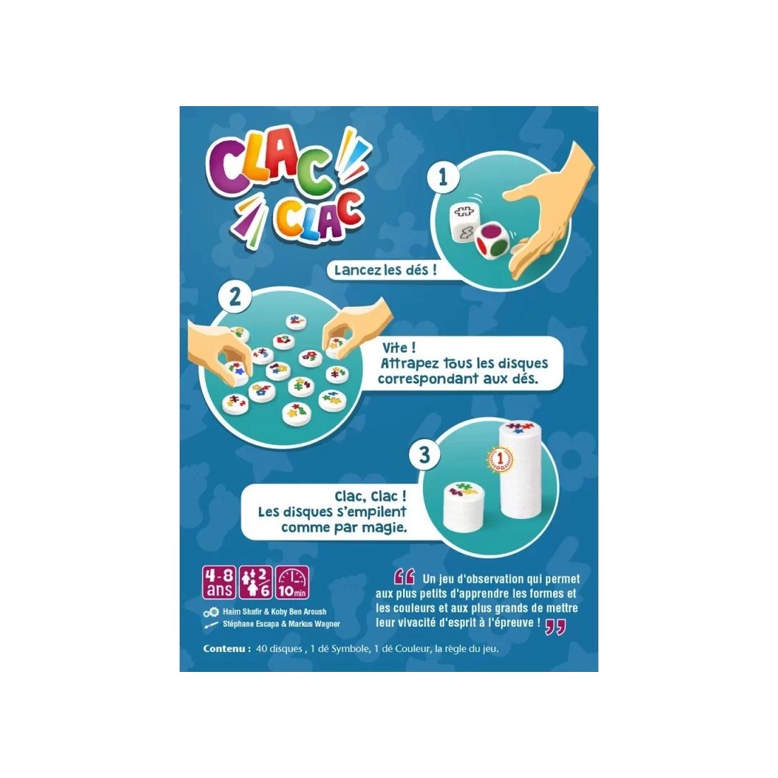 Dans le jeu Clac Clac, chaque disque comporte une combinaison unique de symboles et de couleurs. À chaque manche, deux dés désignent une couleur et une forme que les joueurs doivent retrouver. Tous en même temps, ils scrutent les disques étalés sur la table pour attraper ceux correspondant exactement à la combinaison.