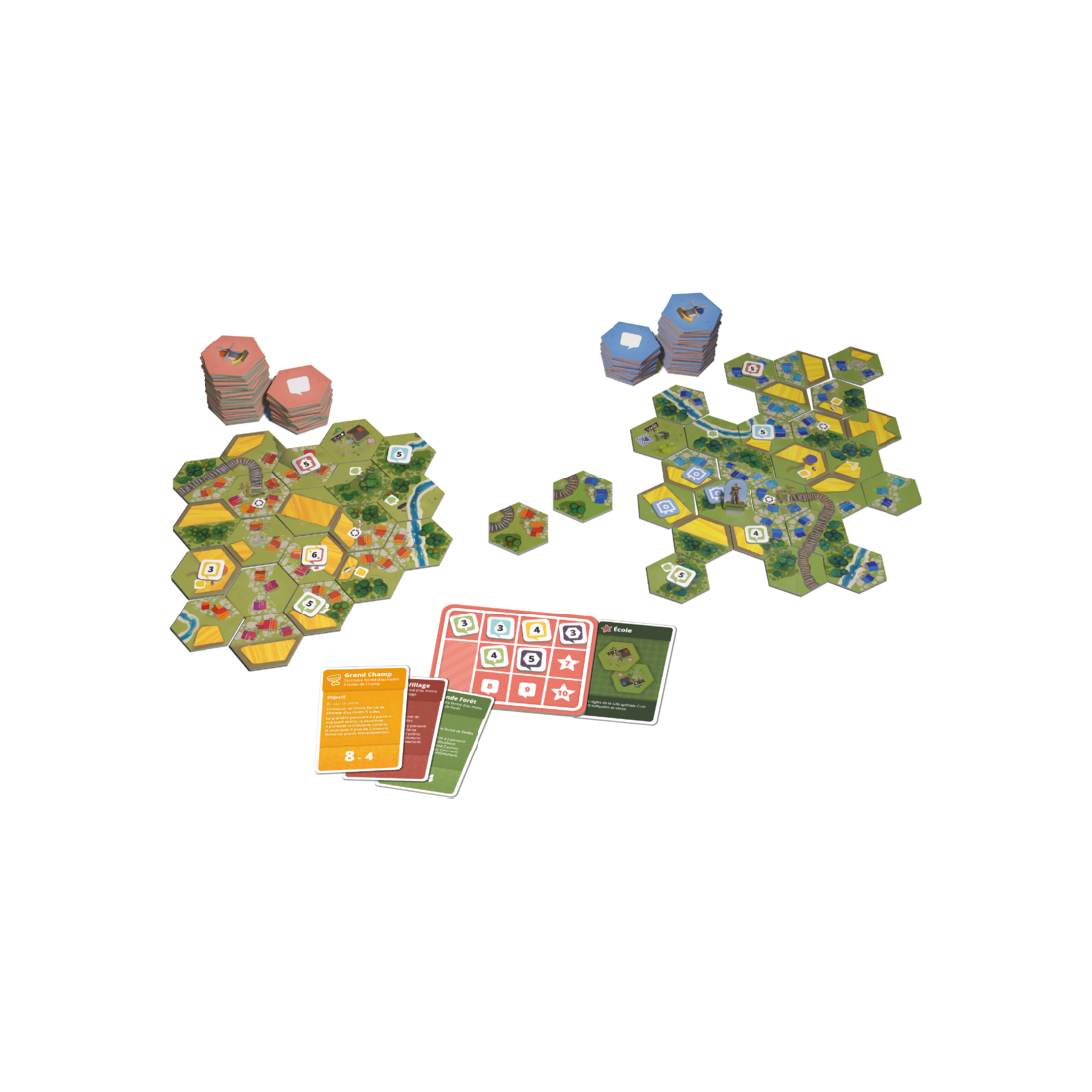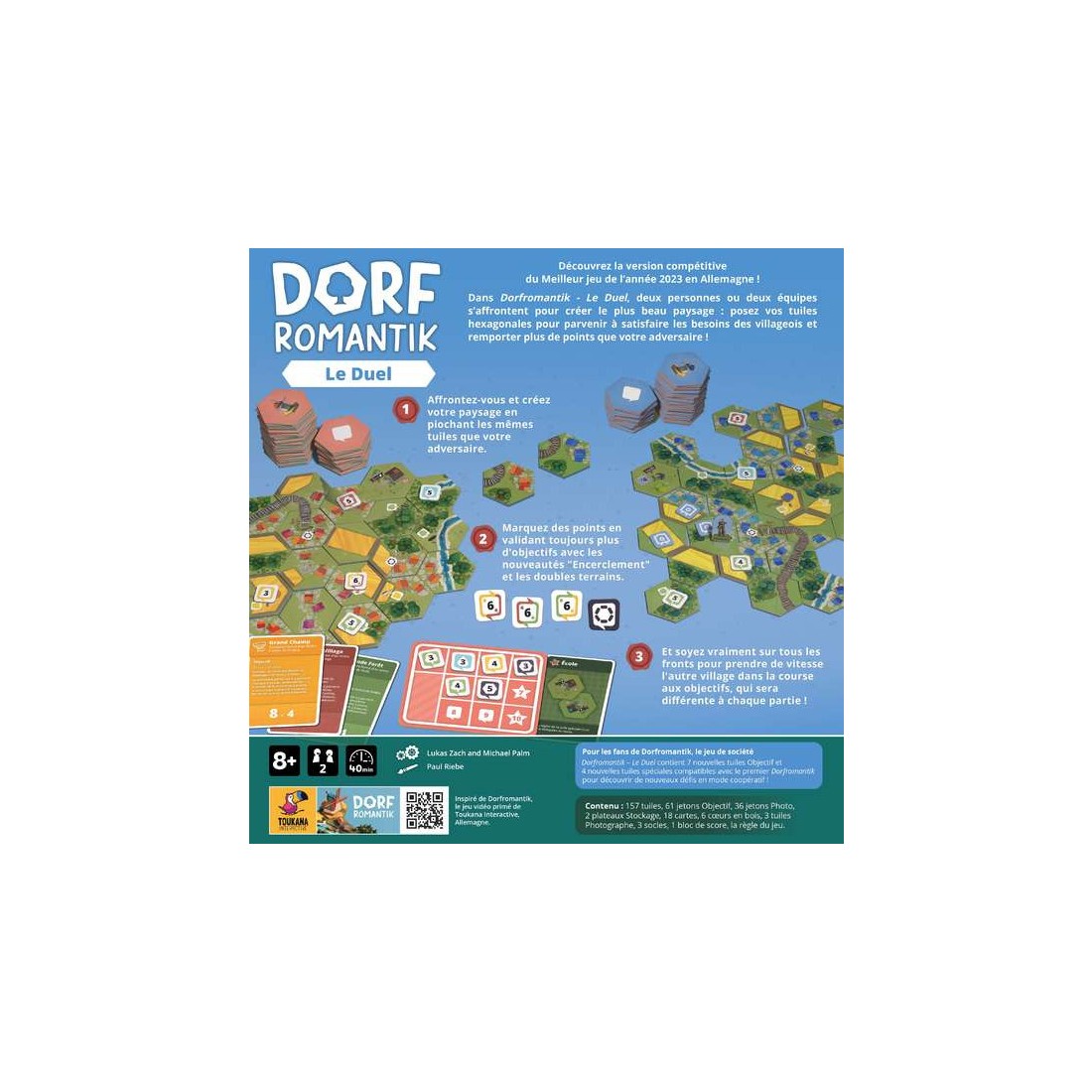 Dorfromantik - Le Duel conserve les mécanismes de base du vainqueur du Spiel des Jahres 2023, mais divise la zone de jeu en deux. Au cours de la partie, les joueurs construisent deux paysages distincts en utilisant deux copies identiques de chaque tuile au fur et à mesure qu'elle est révélée. À la fin de la partie, deux magnifiques paysages auront été créés, qui différeront selon la façon dont chaque joueur (ou équipe) aura abordé le défi stratégique. Deux nouveaux types de tâches sont introduits : Les tâches doubles et les tâches enveloppantes, chacune d'entre elles apportant de nouveaux éléments passionnants à la construction et à la notation de votre paysage. De plus, deux nouveaux modules élargissent encore les options des joueurs avec les cartes de tâches et les points d'intérêt. Ces modules peuvent être joués indépendamment l'un de l'autre ou combinés pour plus de défis, plus de variété et plus d'interaction. Les amateurs de Dorfromantik - Le jeu de plateau trouveront des éléments d'extension pour ce jeu sous la forme de 7 tuiles Tâche et de marqueurs correspondants, de 4 cartes Réalisation et de tuiles Spéciales, ainsi que d'un Photographe et de marqueurs d'appareil photo. Dorfromantik - Le Duel est conçu pour que deux joueurs ou deux équipes s'affrontent, et peut facilement accueillir jusqu'à quatre joueurs avec deux exemplaires.- Age : 8