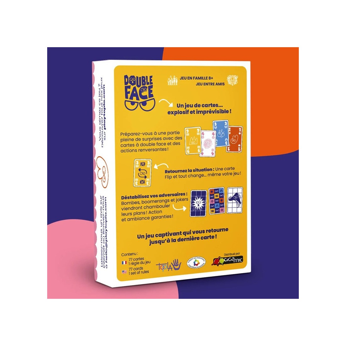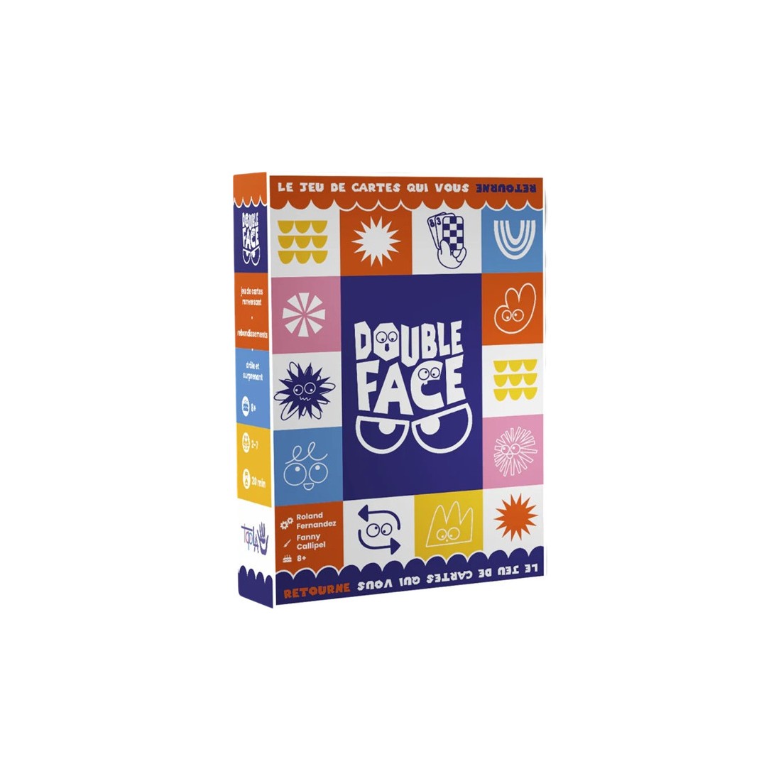 Au moment de compter les points, si votre contrat est rempli, les pénalités s’évaporent ! Double Face est un jeu drôle où la stratégie, l’audace et un soupçon de chance se combinent et créent une formidable ambiance !