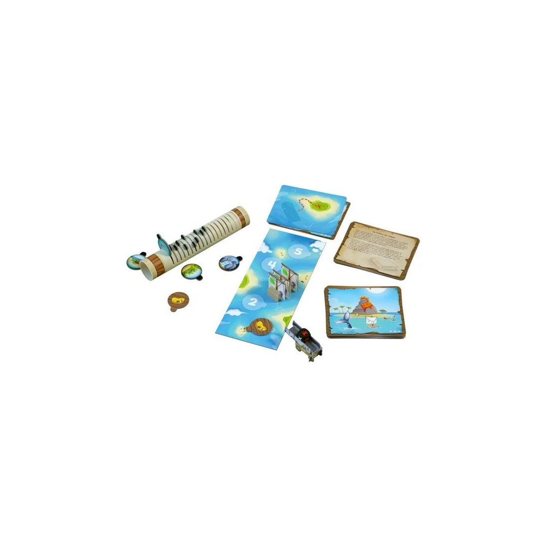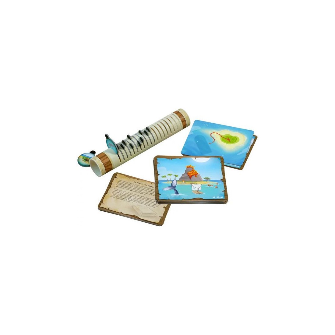 Lisez l'une des 15 cartes Histoire recto-verso pour vous immerger dans un décor et un sentiment d'aventure, puis observez ensemble l'île pendant 5 secondes et retenez le plus de détails possible.Quand c'est votre tour d'avoir la longue-vue (où des jetons avec des images sont insérés dans des fentes), décrivez l'élément que vous voyez et décidez ensemble s'il se trouve sur votre île. Dans ce cas, avancez votre bateau d'une case et placez sur la case quittée le jeton observé. Sinon, retirez simplement le jeton de la longue-vue et passez-la à la personne suivante.