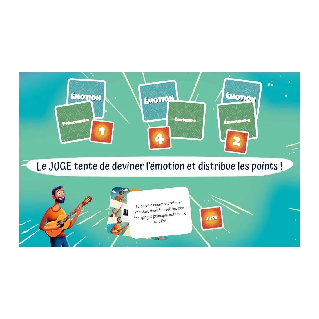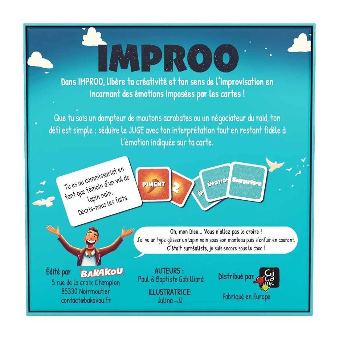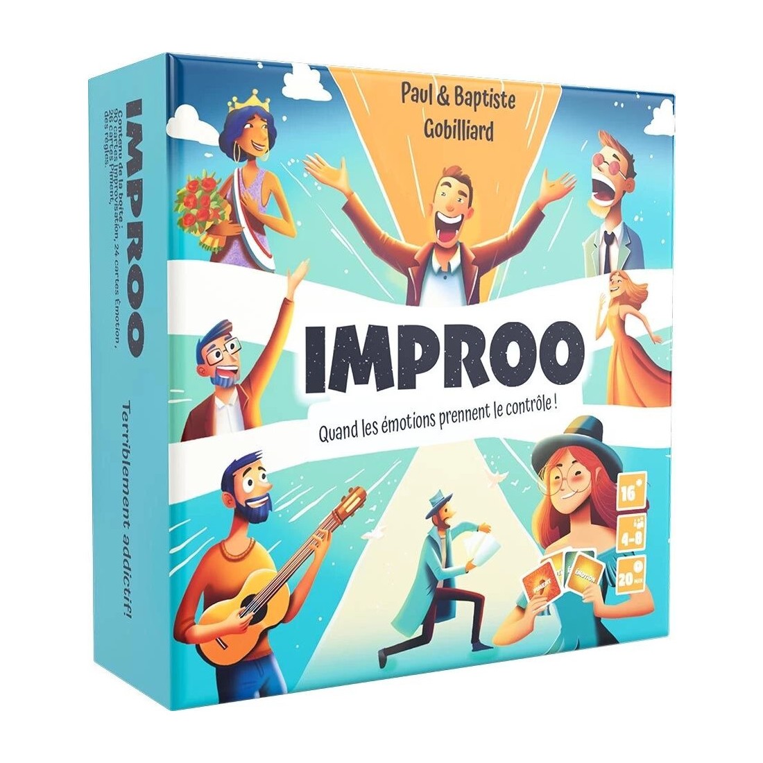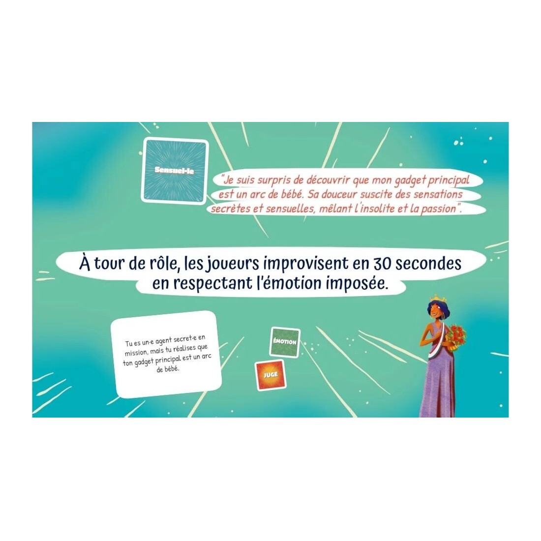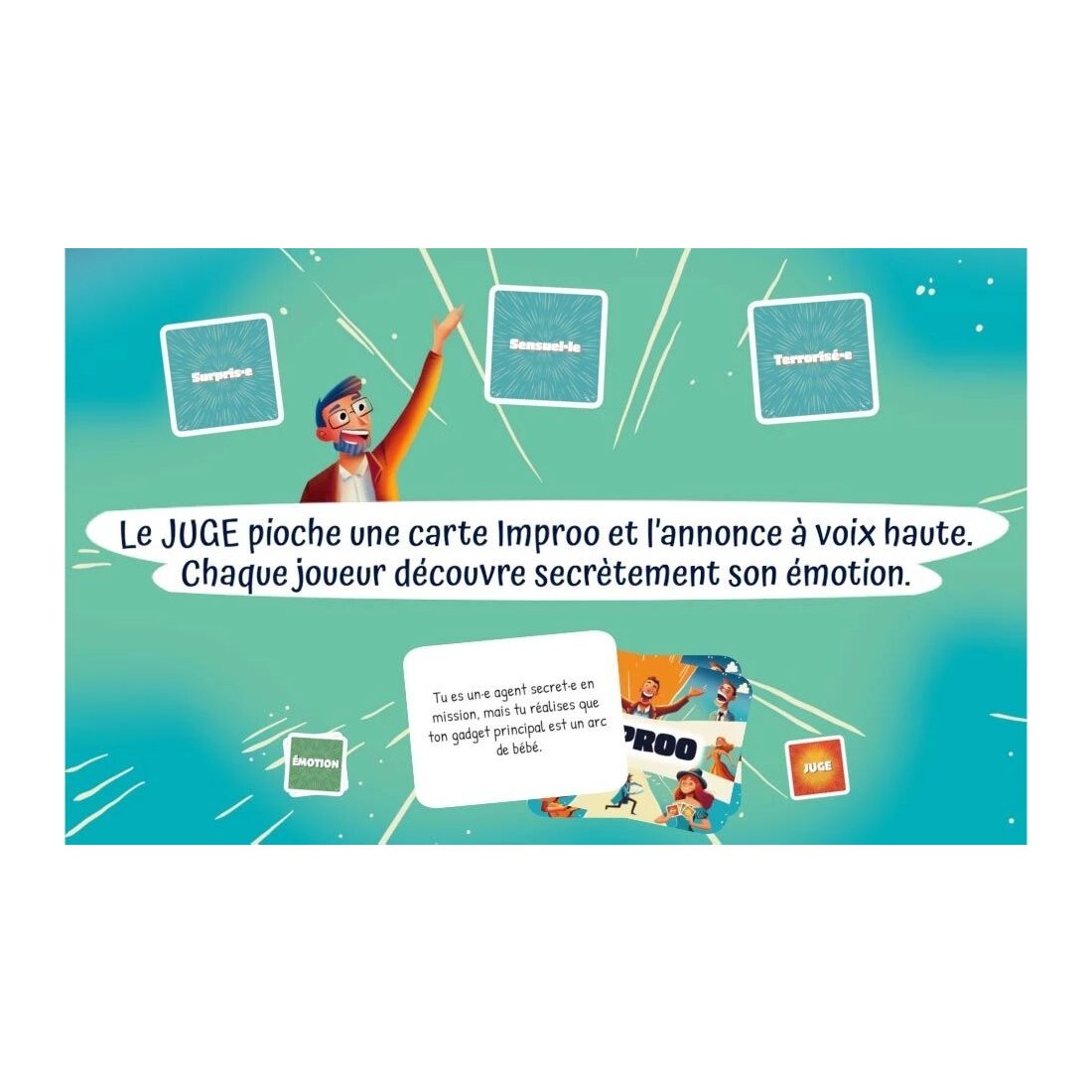 Dans Improo, libère ta créativité et ton sens de l’improvisation en incarnant des émotions imposées par les cartes ! Que tu sois un dompteur de moutons acrobate ou un négociateur du raid, ton défi est simple : Séduire le Juge avec ton interprétation tout en restant fidèle à l‘émotion indiqué sur ta carte.