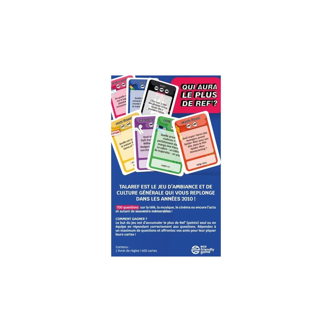 Le but du jeu est d’accumuler le plus de Ref’ (points) seul ou en équipe, en répondant correctement aux questions. Répondez à un maximum de questions et affrontez vos amis pour leur piquer leurs cartes ! Qui aura le plus de Ref’ ?