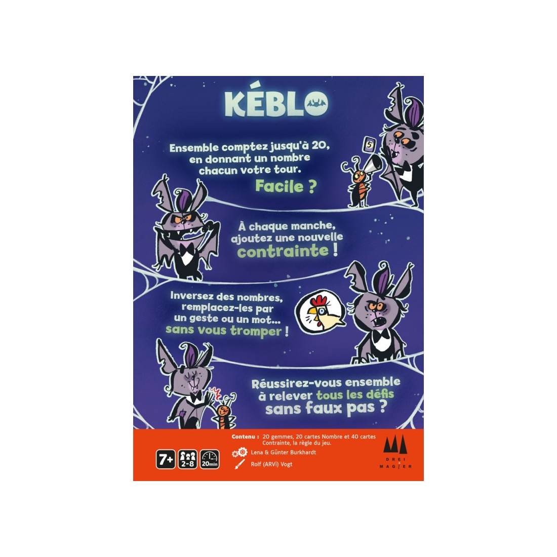 Toutes les cartes de Contrainte sont retournées. Les joueurs ont remporté la partie ! Ils peuvent poursuivre en plaçant 4 nouvelles cartes Contrainte sur la table et entamer un nouveau tour de comptage.Il n'y a plus de gemmes sur la table. Le jeu se termine au moment même où la dernière gemme est remise dans la boîte. Il faut réessayer !- Age : A partir de 7 ans