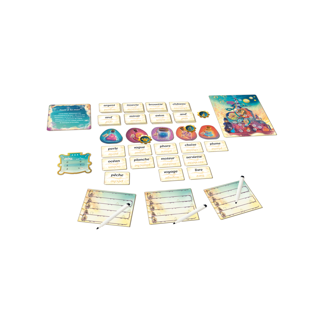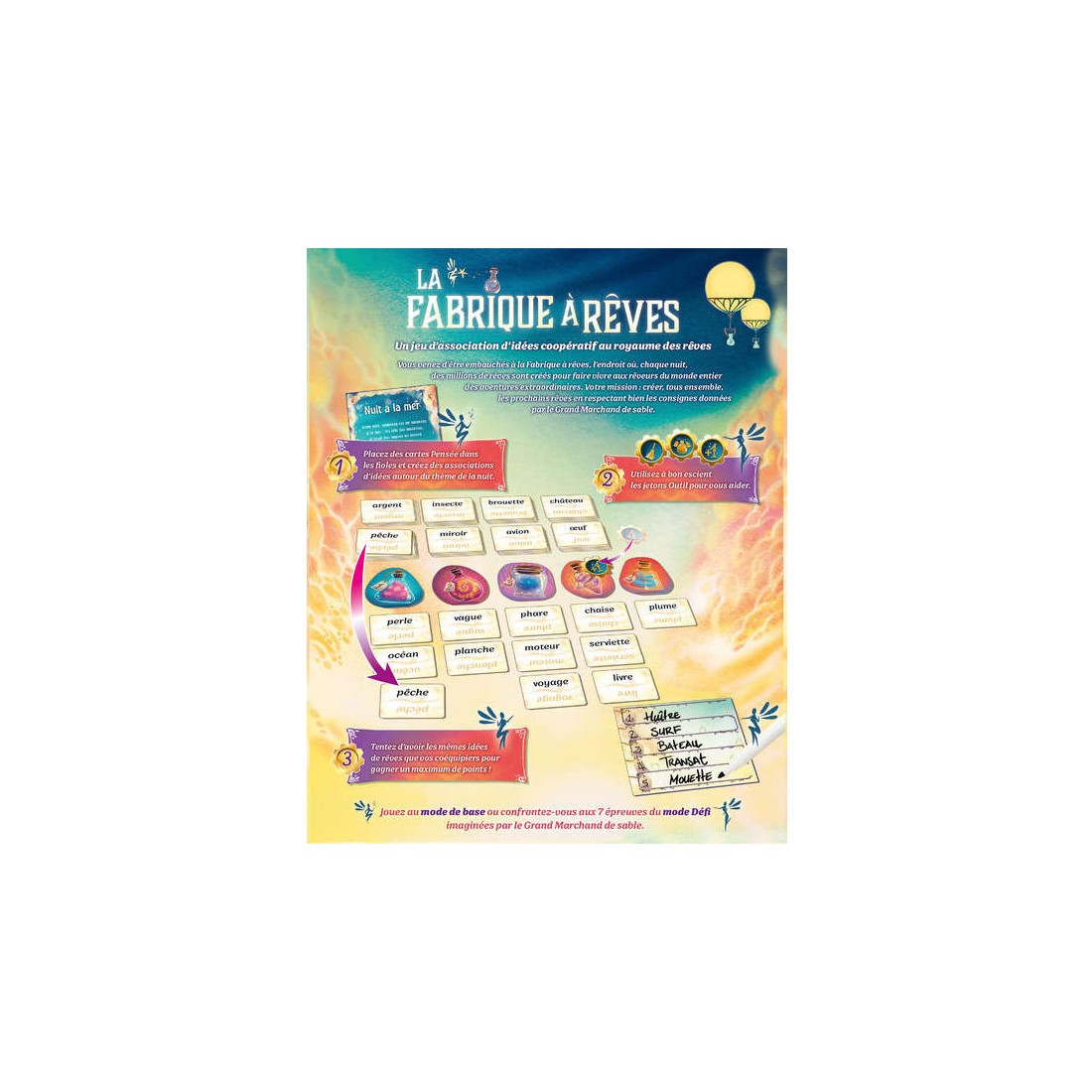 La Fabrique à Rêves est un jeu coopératif. À chaque partie, les joueurs devront créer ensemble 5 rêves en respectant le thème de la nuit. Pour cela, ils devront, dans un premier temps, ajouter des cartes Pensée – prenant la forme de mots – dans les 5 tuiles Fiole en créant des associations d’idées en rapport avec le thème. Ils pourront également s’aider des précieux jetons Outil à leur disposition. Dans un deuxième temps, ils devront inscrire secrètement sur leur tablette, pour chaque fiole, un rêve (matérialisé par un mot ou un groupe de mots) en associant les mots dans chaque fiole. Les joueurs marqueront des points en fonction du nombre de rêves similaires mais aussi en fonction du nombre de cartes Pensée dans chaque fiole.
