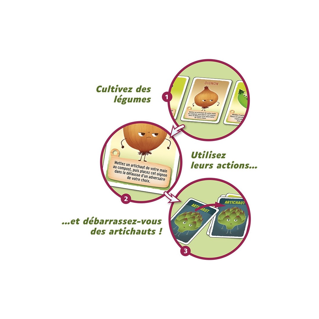 Votre objectif est de vous débarrasser de vos artichauts ! Pour cela, vous devez aller chercher de nouveaux légumes à chaque tour, les intégrer à votre pioche, et utiliser leurs effets pour mettre vos artichauts au compost ! Vous gagnez la partie dès que vous parvenez à tirer une main de cartes dépourvue d’artichauts.
