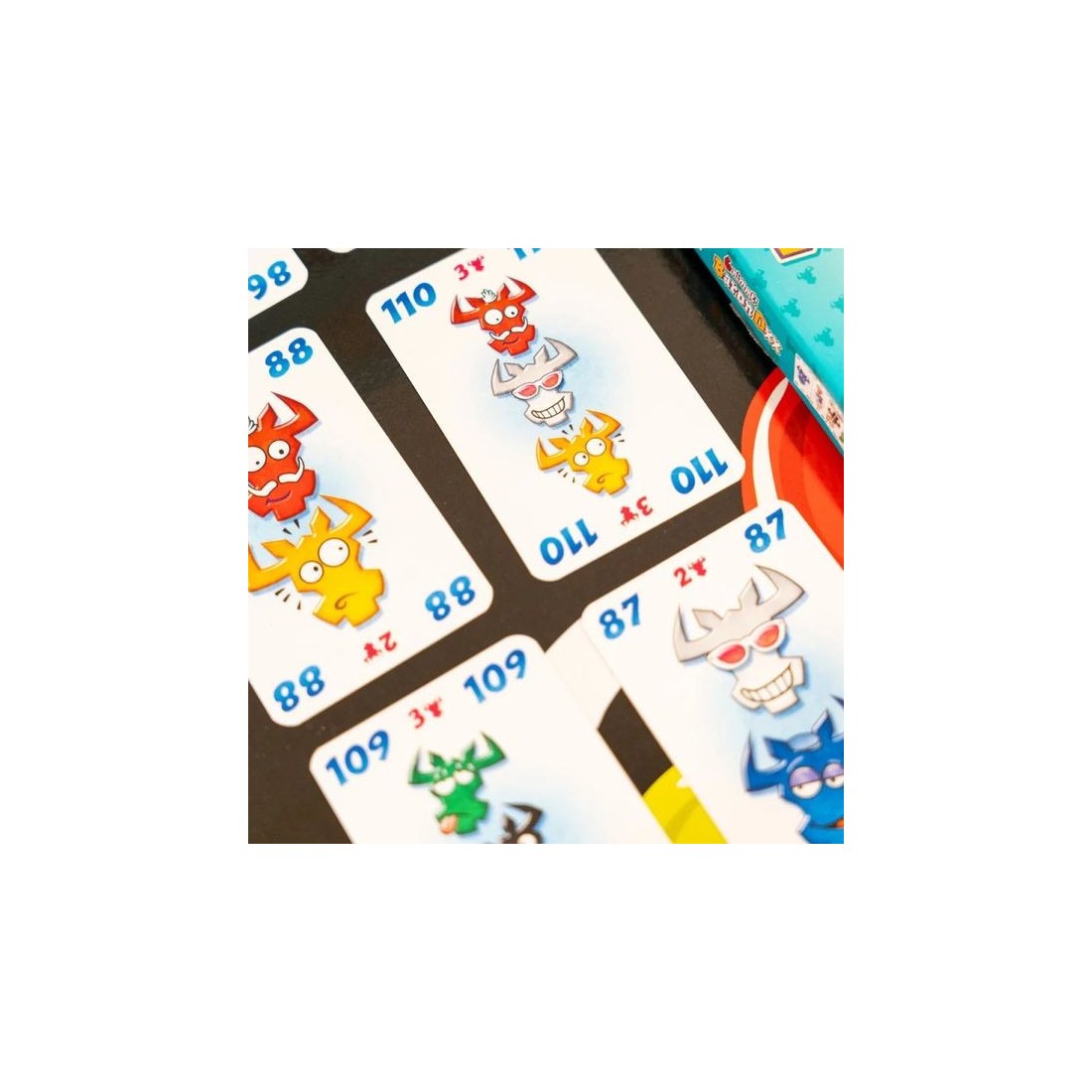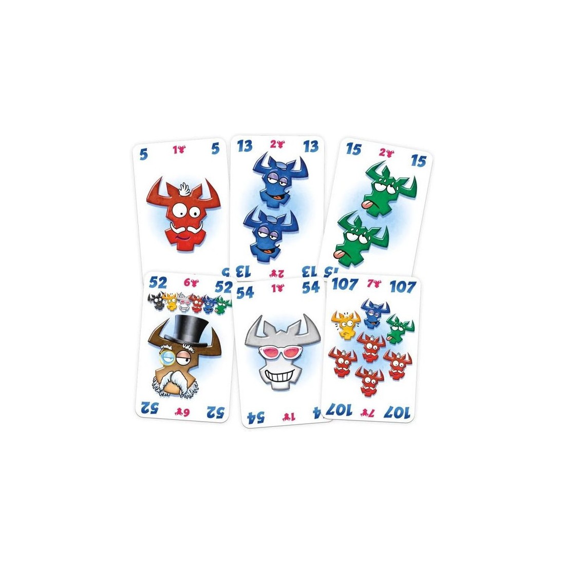 Chaque joueur dispose d'une main de cartes, et cinq rangées de cartes commencent sur la table avec une seule carte aléatoire du paquet. Chaque carte est numérotée et représente une ou plusieurs têtes de taureau colorées.