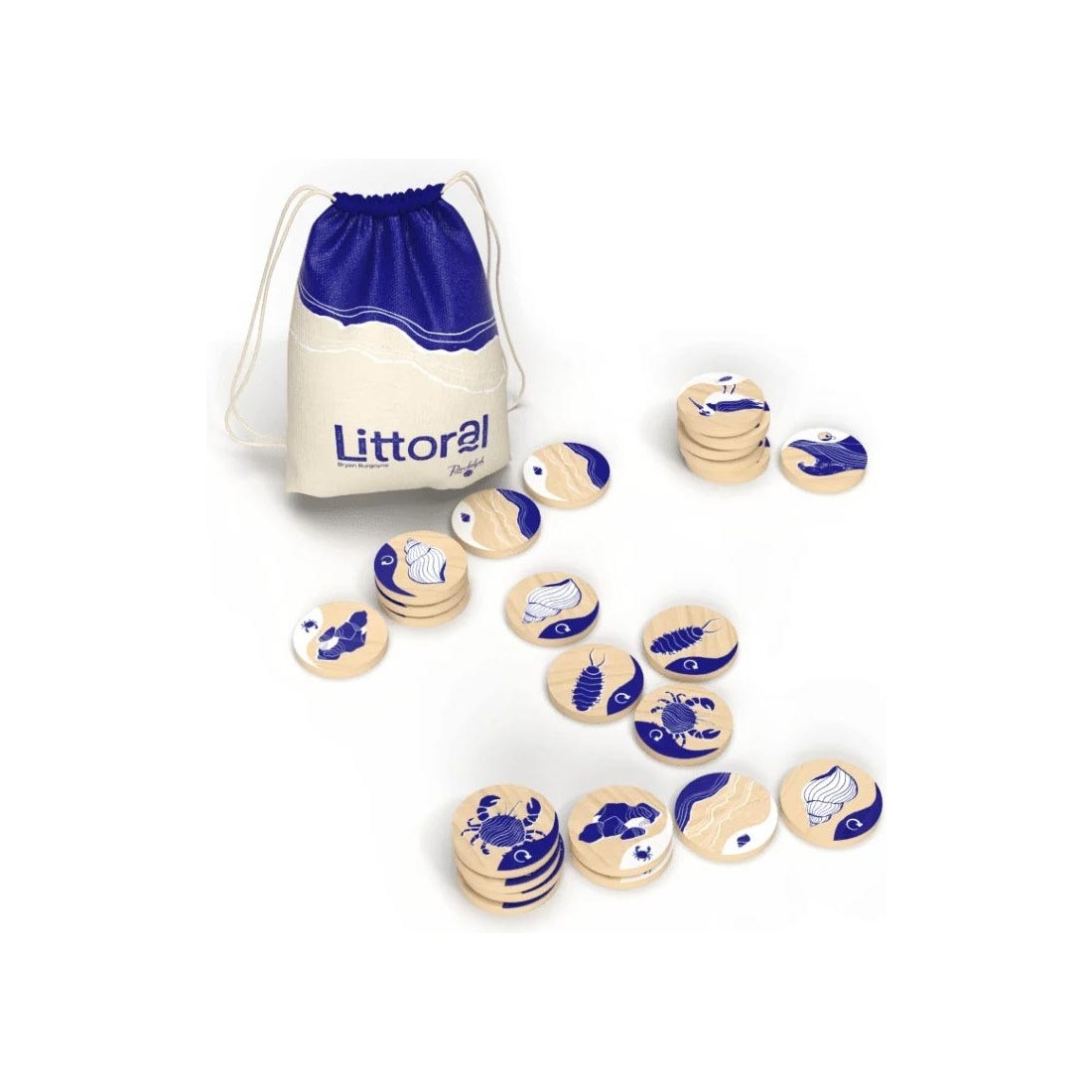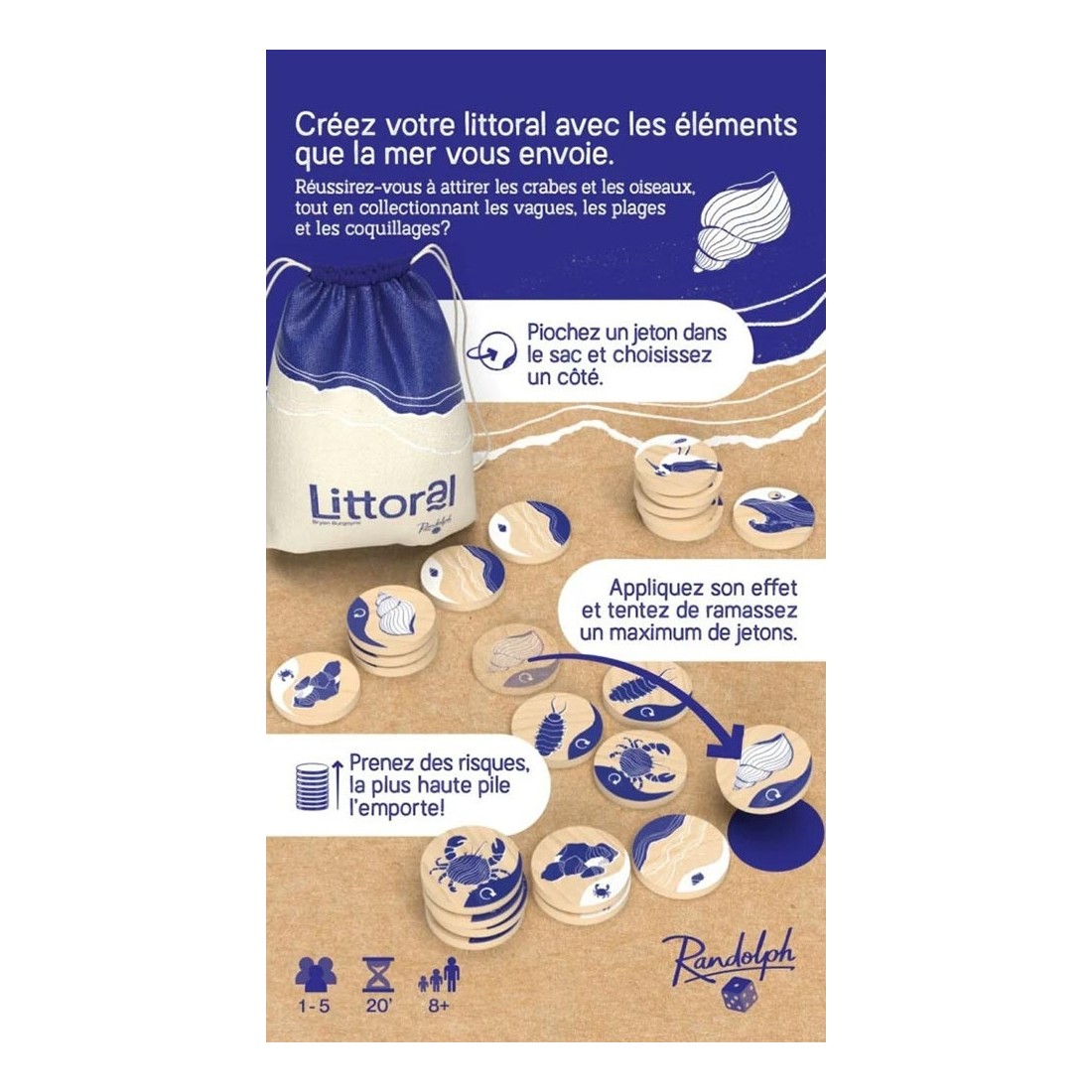 Dans le jeu Littoral, avec des règles simples, vous allez vivre des parties rapides mais intenses. Piochez un jeton dans le sac et choisissez un côté. Appliquez son effet et tentez de ramasser un maximum de jetons. Prenez des risques, car la plus haute pile de jetons l'emporte !
