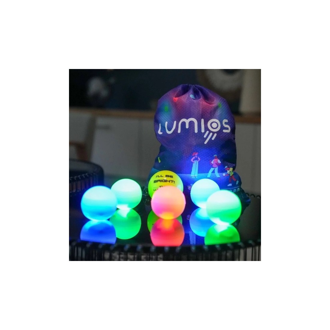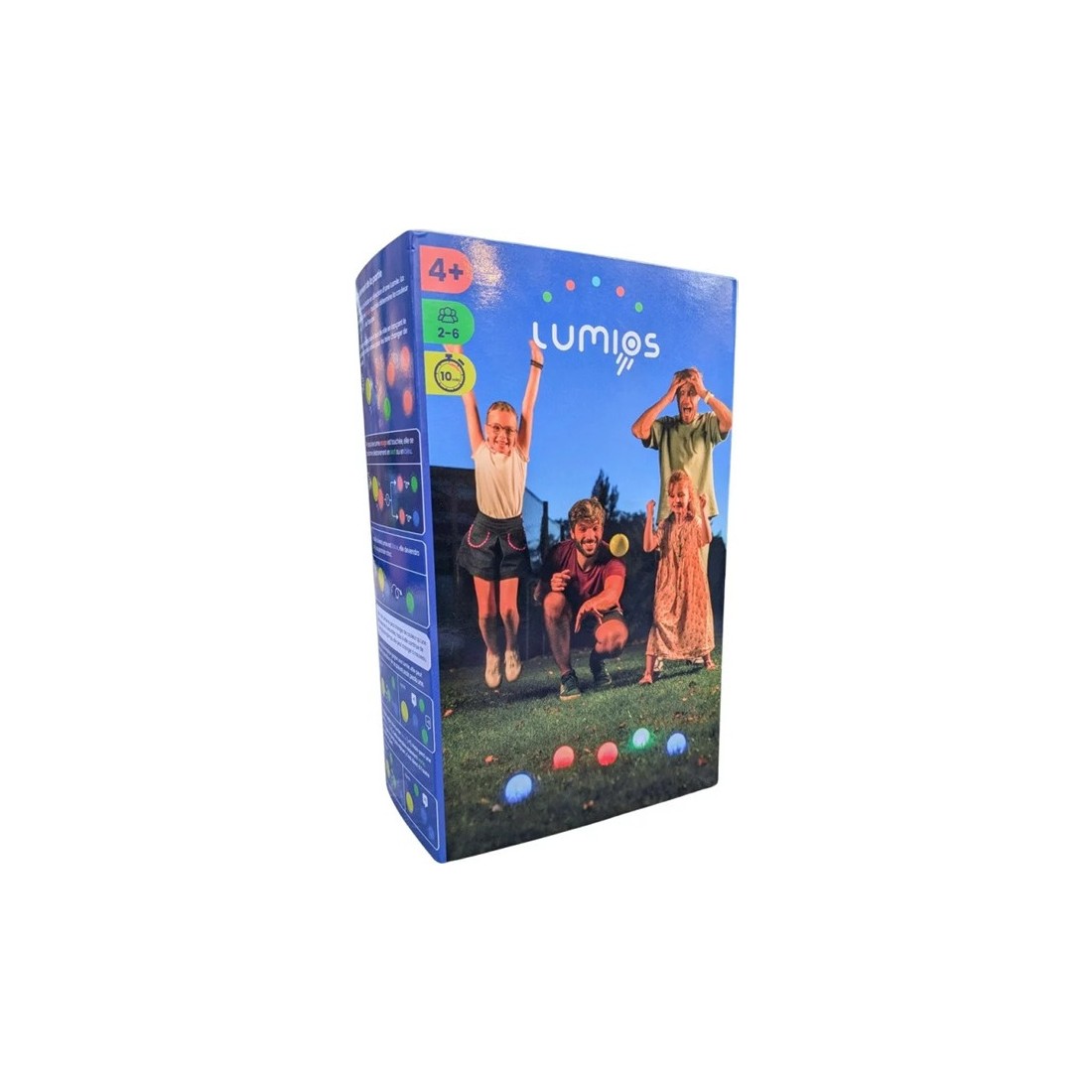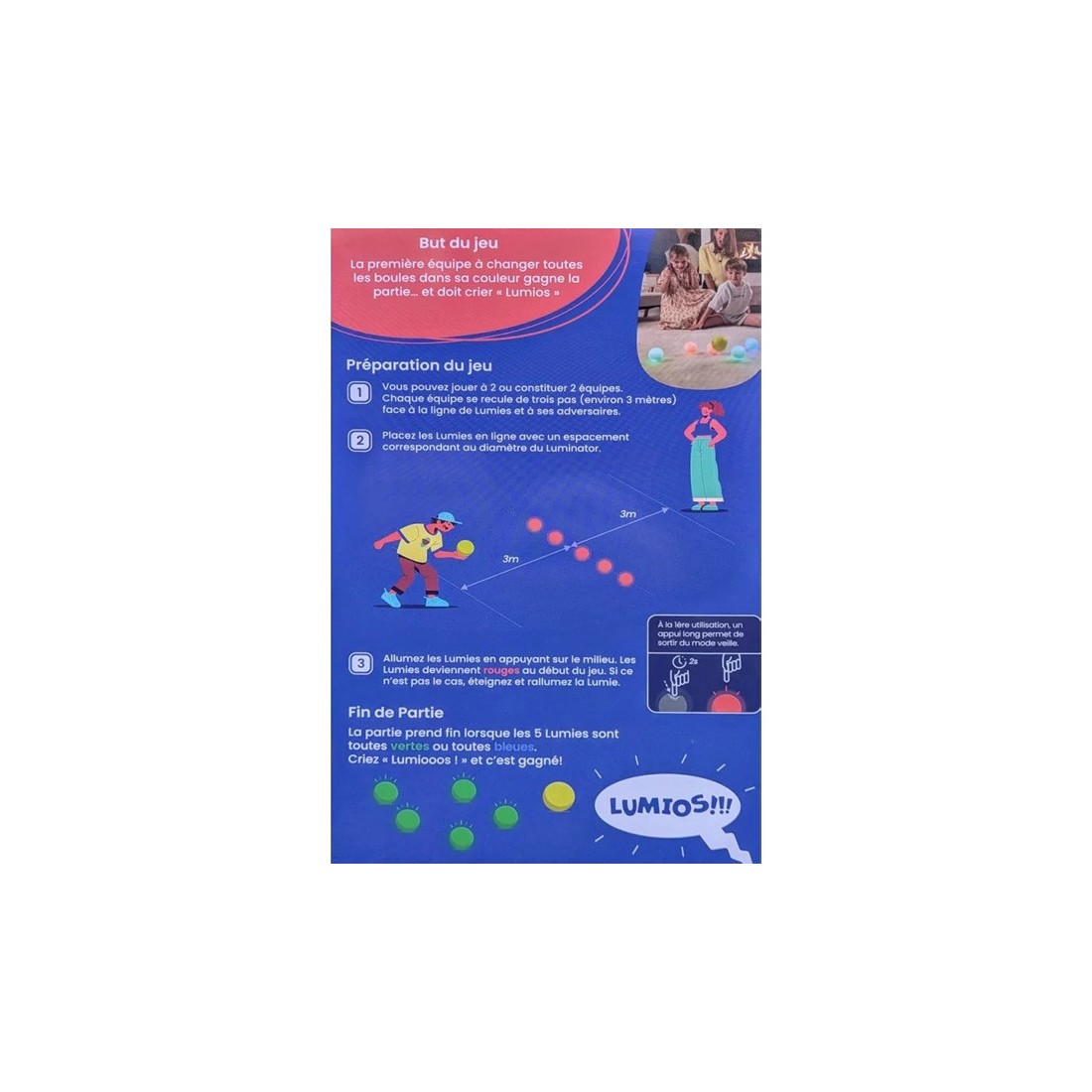 Lumios, le jeu de boules lumineuses pour les enfants… et les parents. 5 boules de votre couleur, et c'est gagné Au départ, il y a 5 boules rouges alignées au milieu. Deux équipes jouent l’une face à l’autre. Celui qui commence doit toucher une boule rouge. Elle devient aléatoirement soit verte soit bleue et ça définit la couleur de son équipe.
