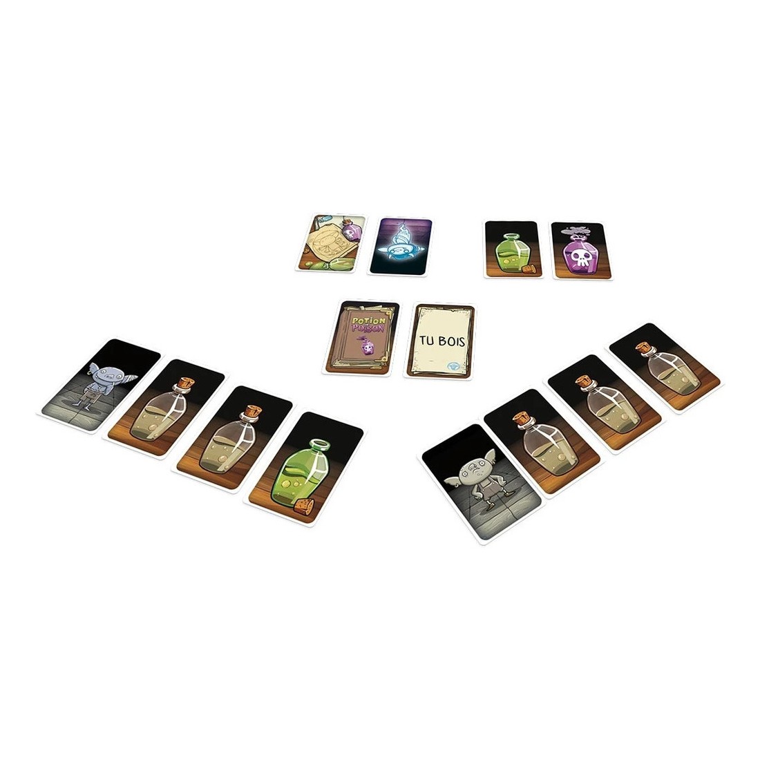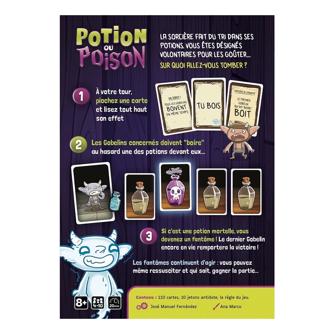 La sorcière fait du tri dans ses potions et vous êtes désignés volontaires pour les goûter. À votre tour vous devrez choisir quelle potion « boire » parmi toutes celles qui sont devant vous. Attention au poison mortel, vous risquez à tout moment d’être changé en fantôme ! Mais vous pourrez continuer à jouer, en poussant les autres à la faute, et qui sait, revenir à la vie et remporter la victoire !