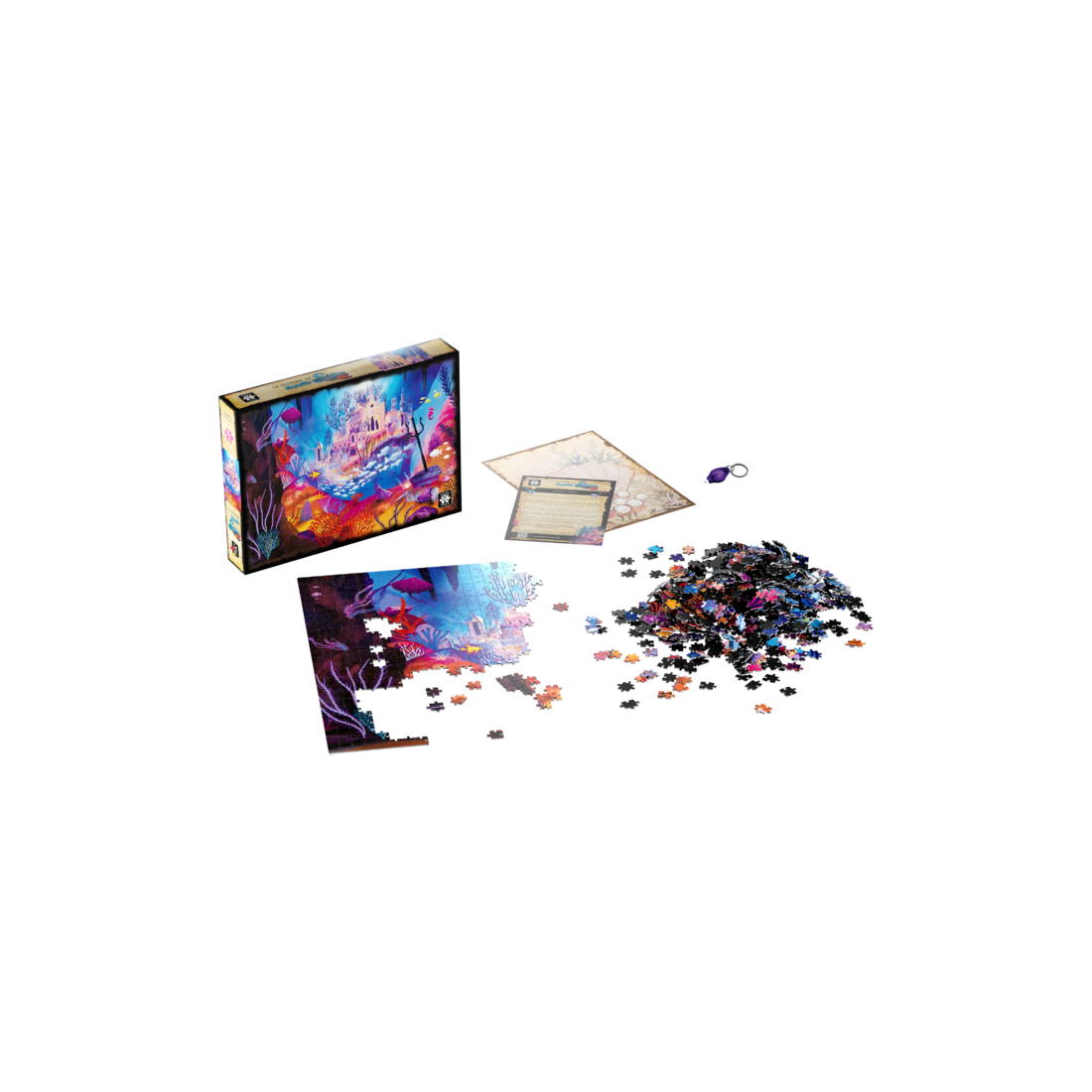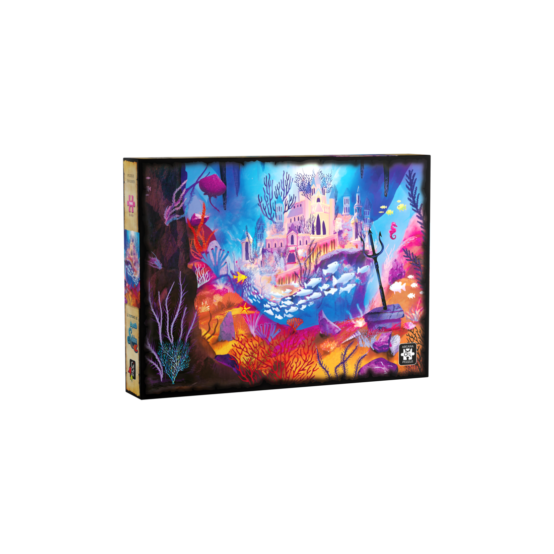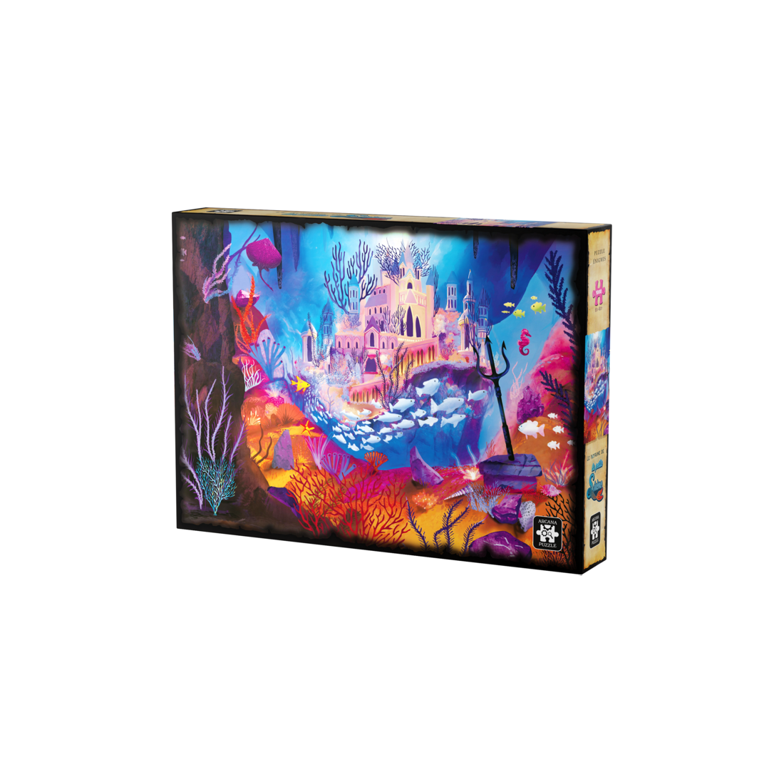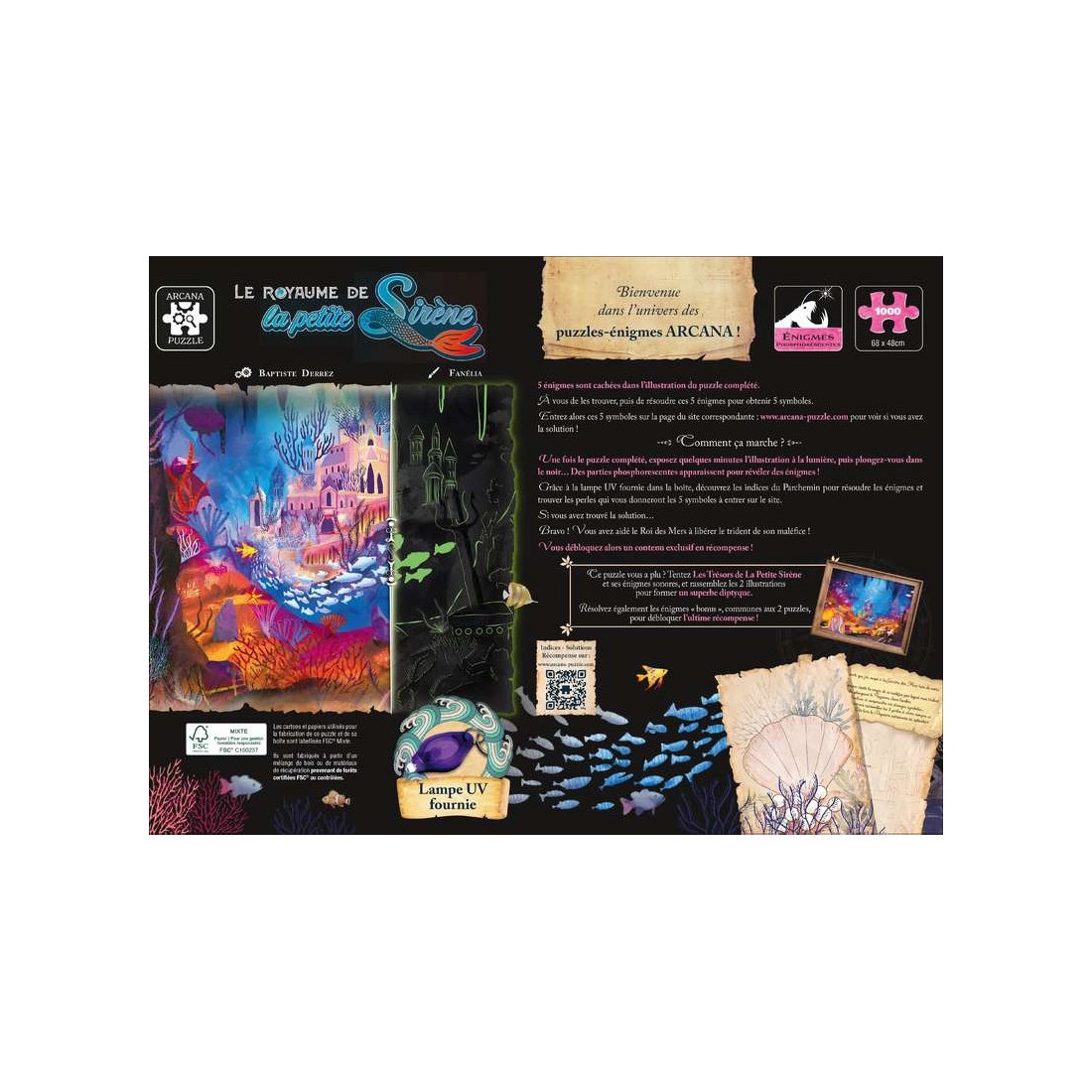 Pour ce faire, exposez l’illustration du puzzle complété à la lumière d’une lampe ou du soleil pendants environ 5 minutes ou passez votre lampe Uv sur toute la surface, puis, plongez-vous dans le noir… Le puzzle s’illumine, vous révélant la magie de la Sorcière de mers ! Si vous avez trouvé la solution… Bravo ! Vous avez aidé le Roi des mers à rendre au Royaume sa gloire d’antan, vous débloquez l’illustration du Royaume restauré en récompense !- Age : 12