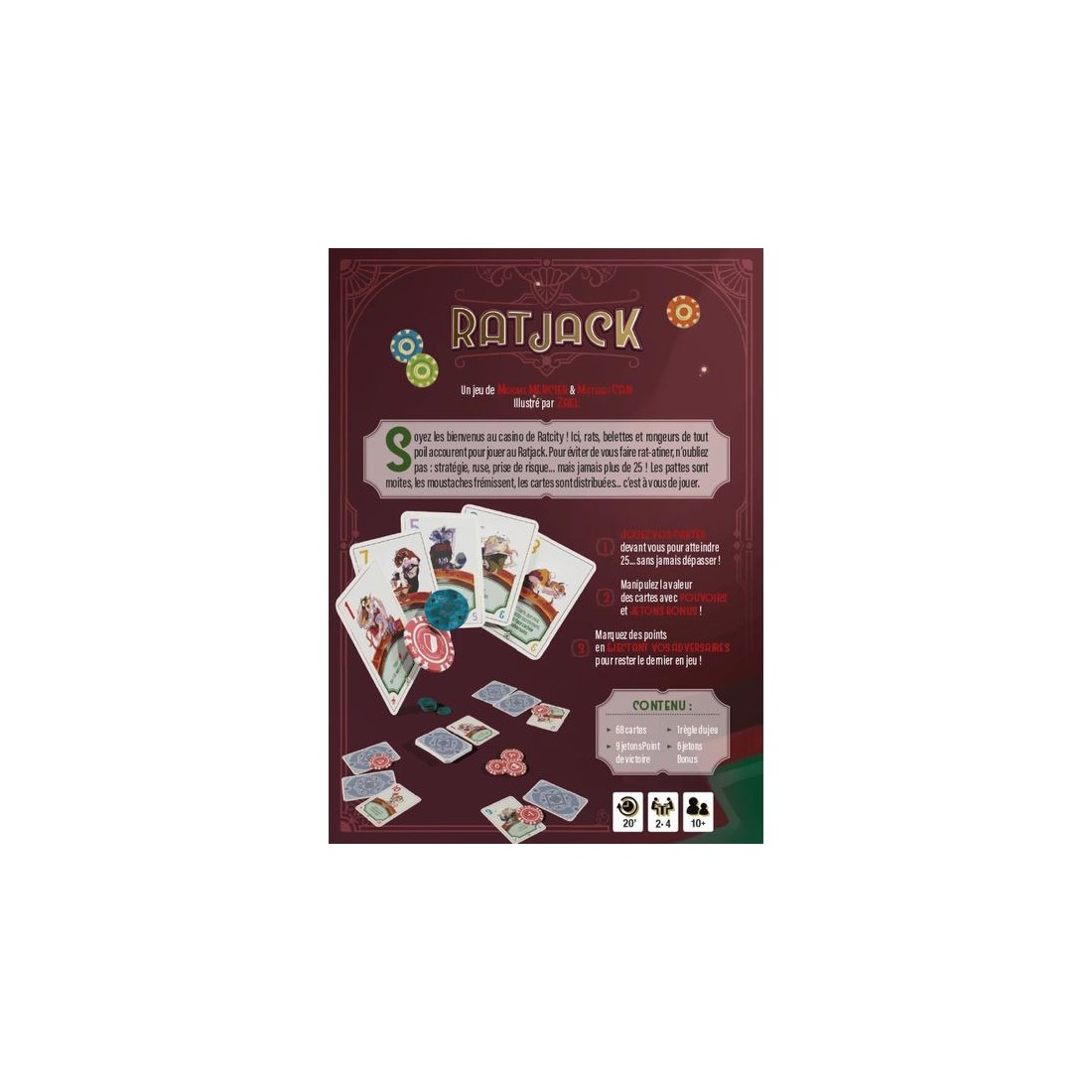 Dans le jeu Ratjack, vous allez tenter d'accumuler 25 points devant vous en posant des cartes, sans jamais dépasser ce total. Cela paraît simple mais c'est sans compter les cartes à pouvoir qui bouleverse les scores à tout moment. Car chaque paquet comporte 12 cartes avec des valeurs de 1 à 12 avec chacune une capacité spéciale.