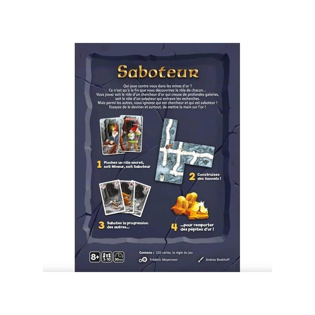 Dans Saboteur, les joueurs jouent soit le rôle d'un chercheur d'or qui creuse de profondes galeries dans la montagne en quête d’un trésor, soit le rôle d’un saboteur qui entrave la recherche d'or. Les deux groupes doivent travailler tout en tentant de trouver le rôle de chacun. Pour progresser dans le jeu, les joueurs devront d’utiliser le bluff et la malice pour atteindre ses objectifs sans dévoiler son rôle.Saboteur, un jeu en plusieurs manches