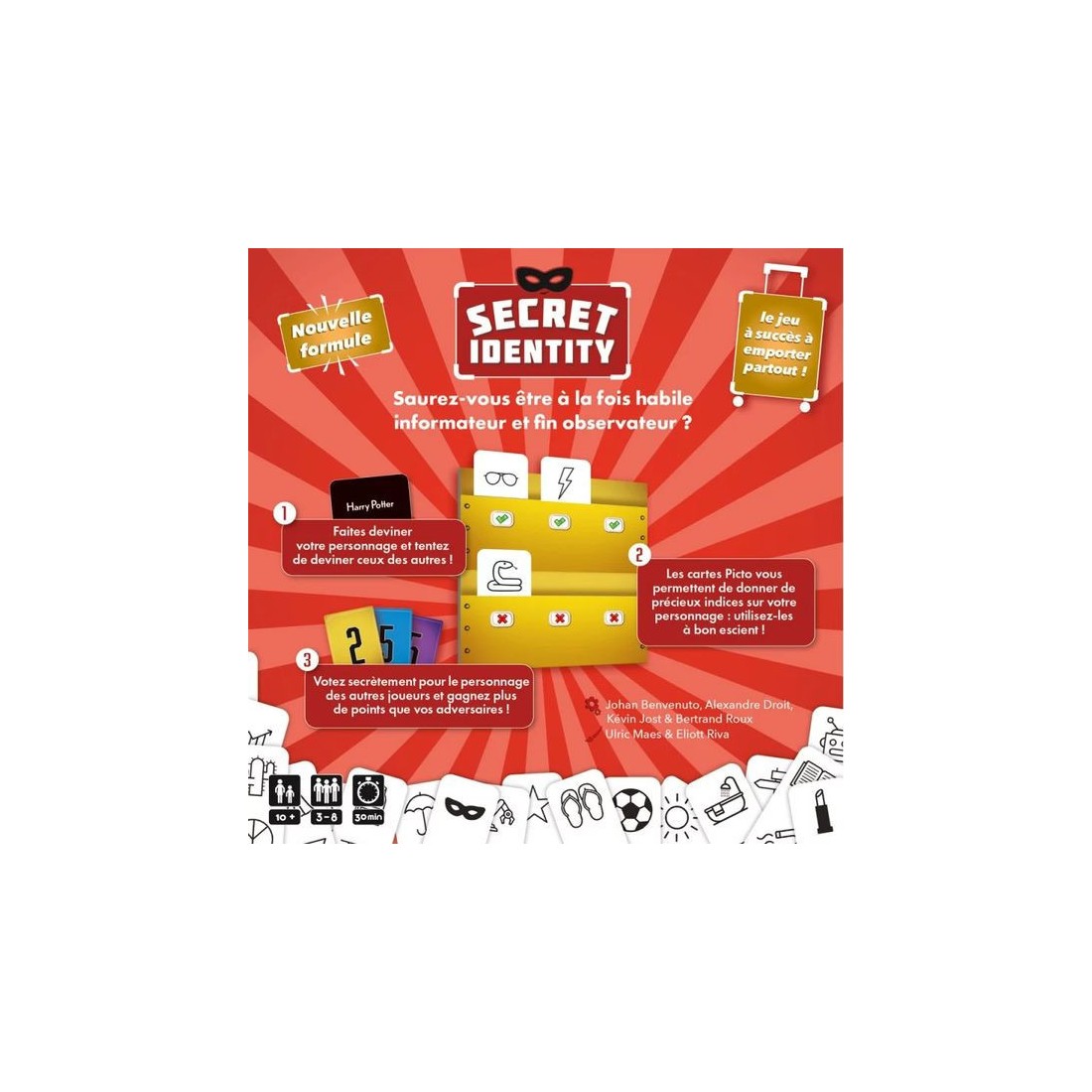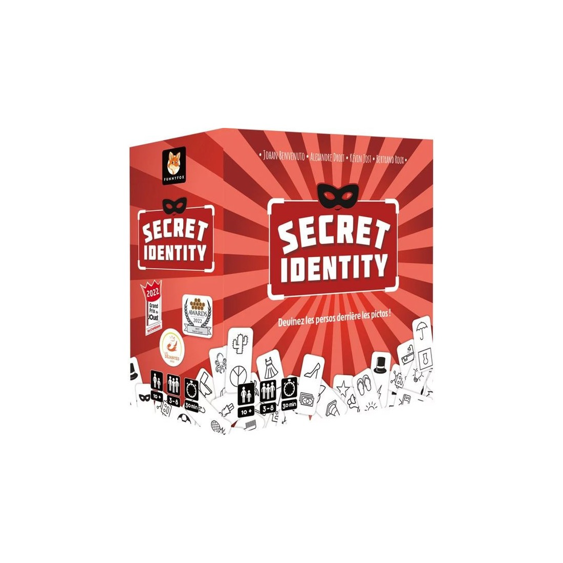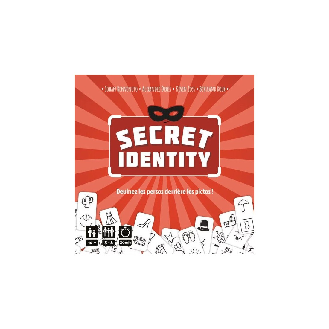 Dans Secret Identity, vous vous verrez attribuer une clé Mystère désignant une carte Personnage parmi les 8 disposées au centre de la table. À l’aide de vos cartes Picto, vous devrez faire deviner votre carte Personnage aux autres joueurs, tout en essayant de deviner la leur, pour gagner un maximum de points de victoire. À chaque manche, de nouveaux personnages seront tirées, mais vos cartes Picto ne seront pas remplacées ! À vous de faire les bons choix et de mesurer les risques… À la fin de la 4e manche, le joueur avec le plus de points de victoire remporte la partie !
