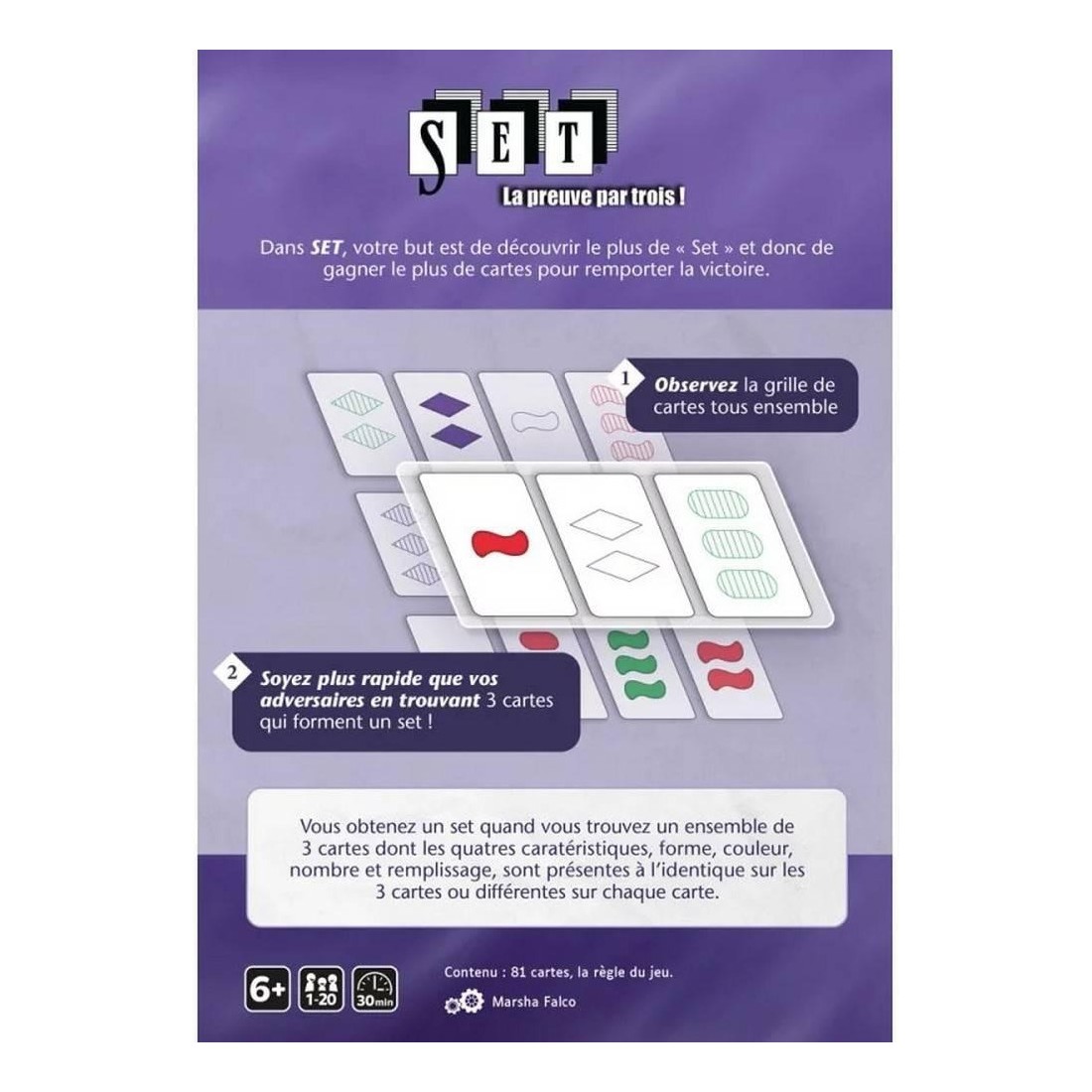 Un "Set" est un ensemble de trois cartes pour lesquelles chacune des quatre caractéristiques est soit complètement identique, soit totalement différente des autres cartes. Le joueur doit donc repérer ces combinaisons en un coup d'œil, ce qui ajoute à la dynamique et au défi du jeu.