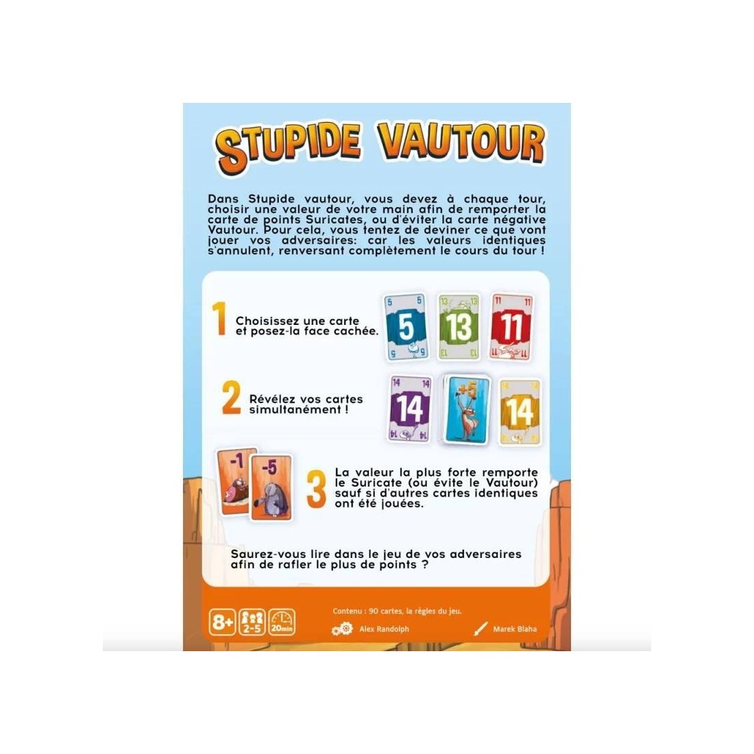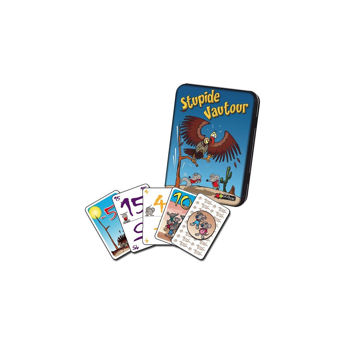 Pour éviter les rapaces, il faut un peu de mémoire, un soupçon de clairvoyance et un brin de stratégie. Stupide Vautour, un jeu simplissime et délirant qui vaut le détour ! Contenu : 90 cartes, règles du jeu, boîte en métal. Nombre de joueurs : 2 à 5. Durée moyenne d'une partie : 20 minutes. .