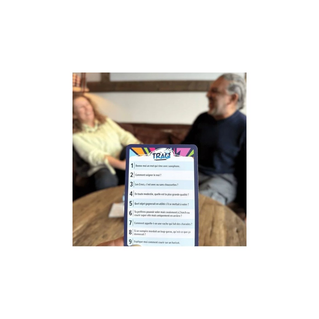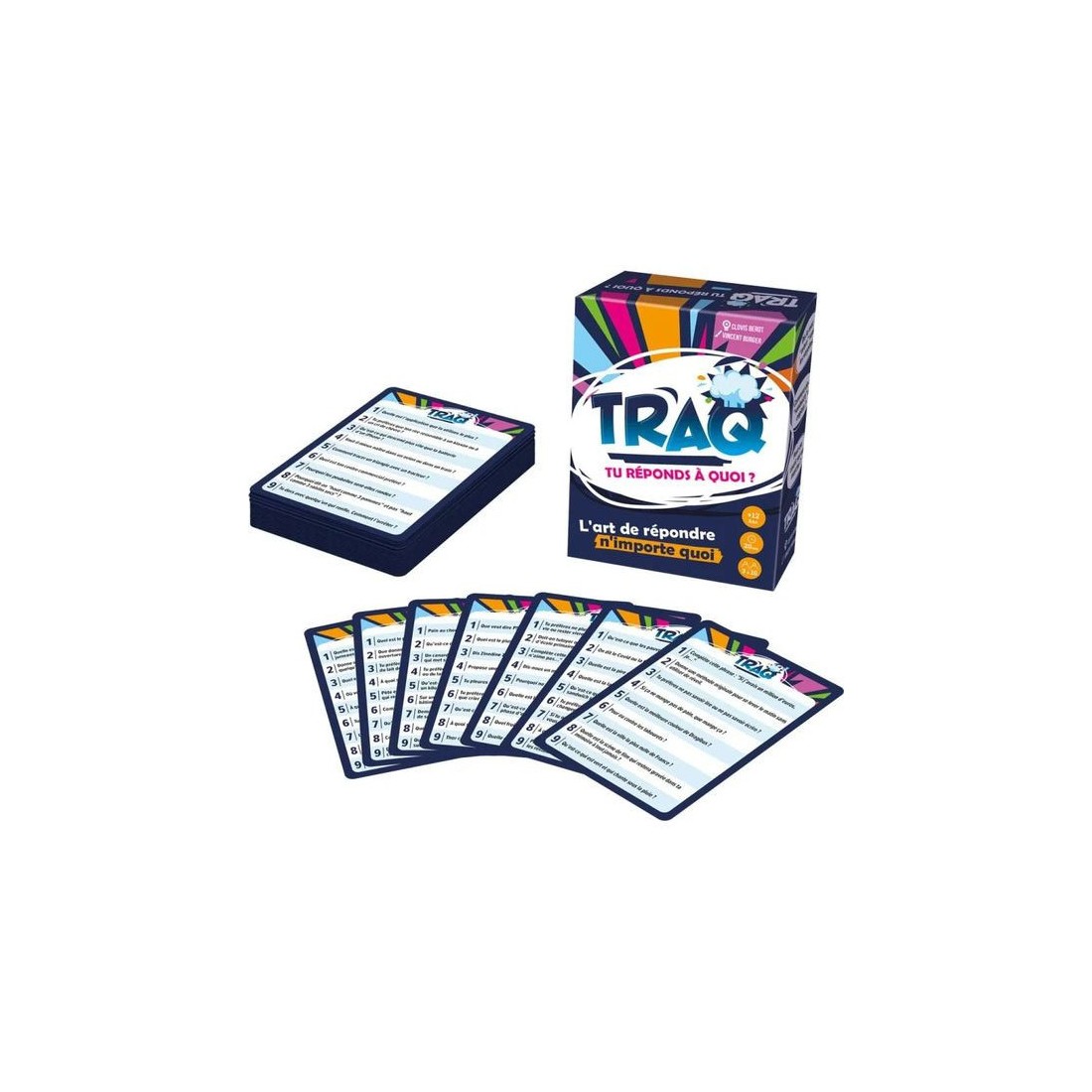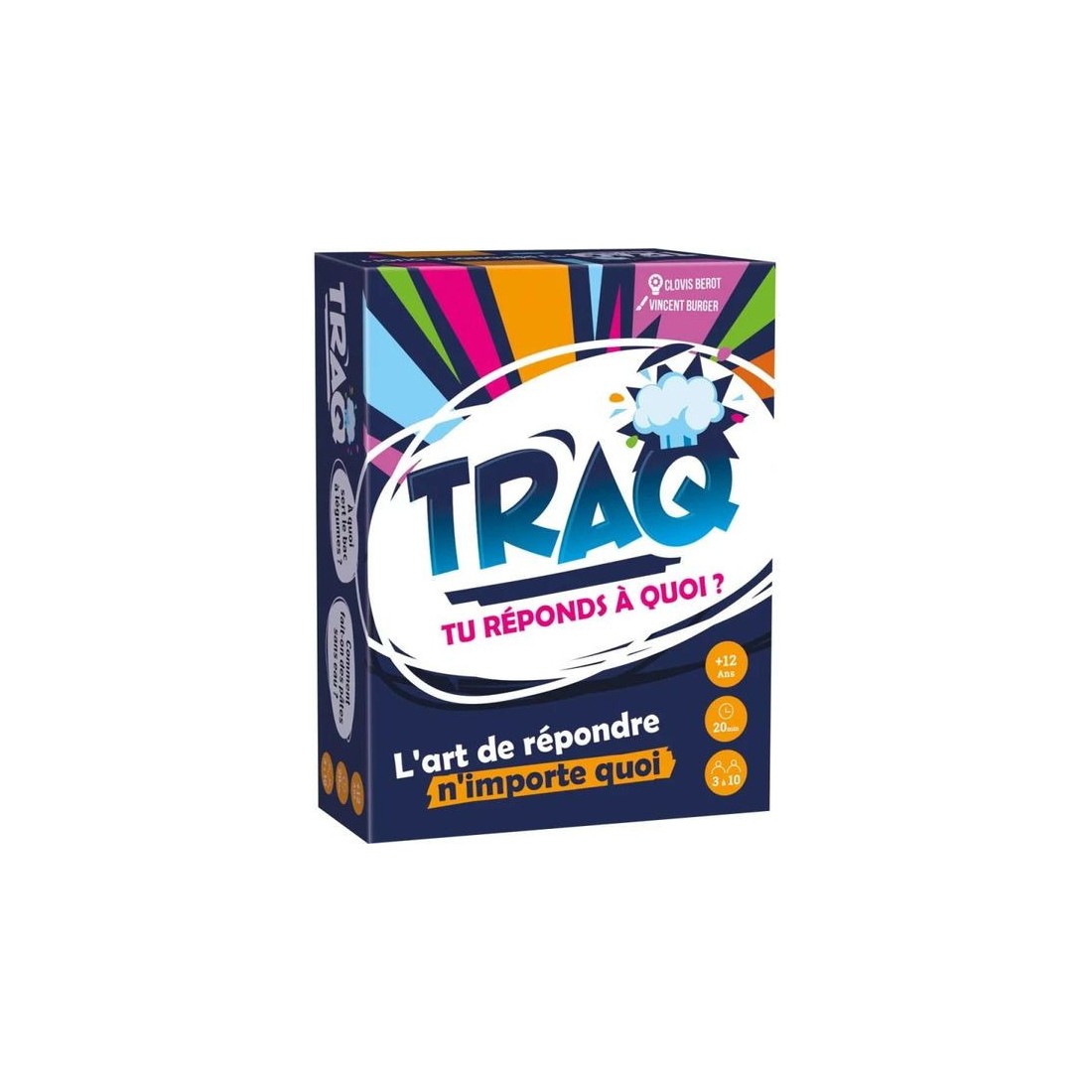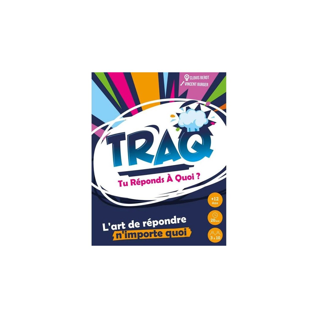 Traq - Tu réponds à quoi ? est un jeu de société d'ambiance jouable de 3 à 10 joueurs, dès 12 ans pour des parties de 20 minutes, édité par Ludilight. Traq - Tu réponds à quoi ? est un jeu de questions dans lequel il n'y a besoin d'aucune connaissance. Vous savez dire votre prénom et donner la couleur du cheval blanc d'Henri Iv ?