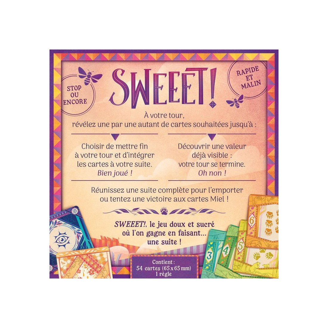 Avec ses règles simples et son format rapide, Sweeet ! est un jeu de stop ou encore aussi addictif qu’astucieux. Son design coloré, ses mécaniques tendues et ses retournements de situation en font un jeu parfait pour l’apéro ou une soirée en famille. Que vous misiez tout sur la prise de risque ou sur la stratégie, une chose est sûre : impossible de s’arrêter à une seule partie !