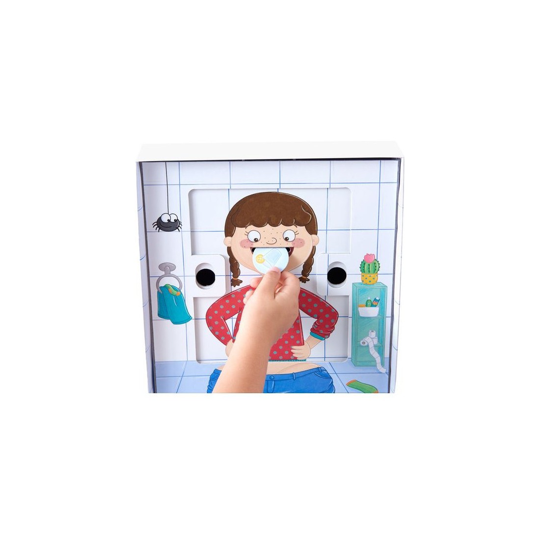- 1 décor de jeu (4 parties à emboîter en croix, 1 planche cartonnée double face « haut du corps », 1 planche cartonnée « bas du corps », 1 planche cartonnée « sol de salle de bain »),
