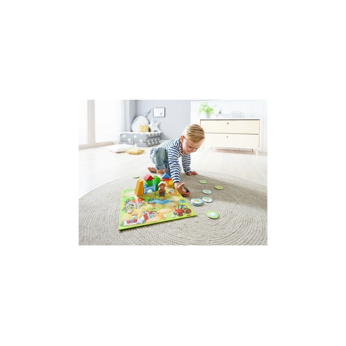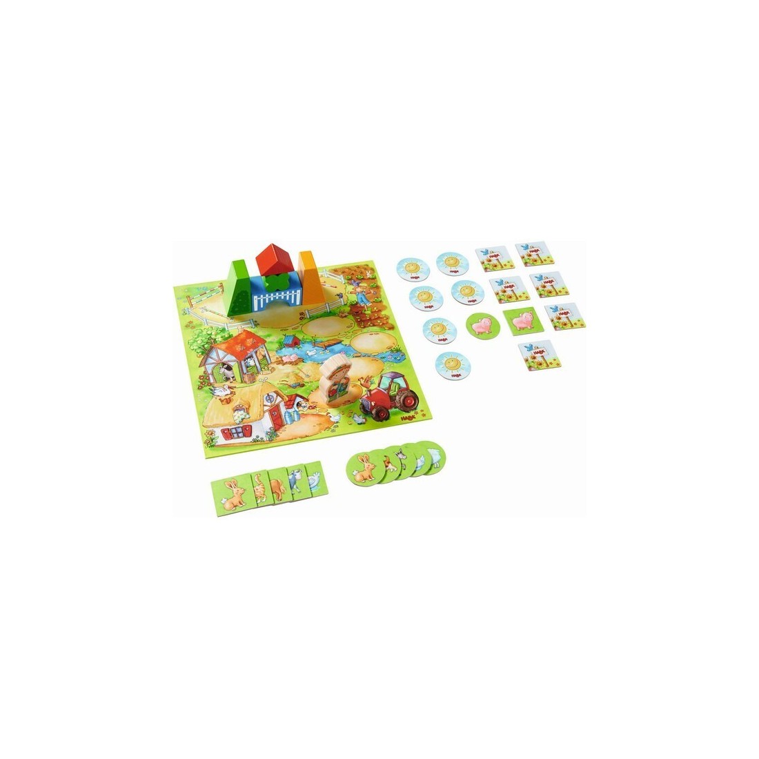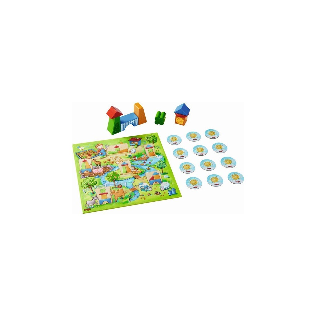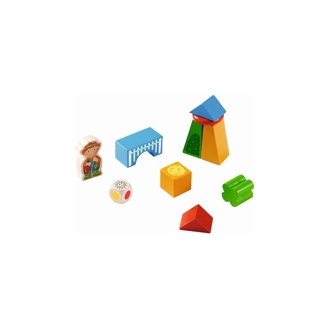 CaractéristiquesContenu : 1 plateau de jeu (imprimé des deux côtés), 1 figurine en bois « Fermier Nils », 1 dé multicolore à symboles, 8 blocs de construction (1 pont, 1 dé, 2 parallélépipèdes inclinés, 1 trèfle, 2 toits, 1 disque), 15 plaquettes-dominos, 12 plaquettes-soleil rondes, 12 plaquettes mémo carrées, 1 règle du jeu