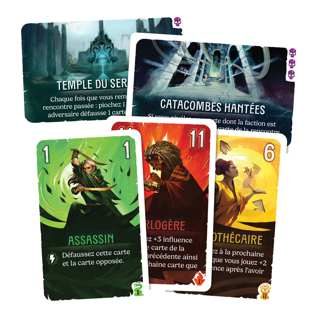La Rebellion (vert) appauvrit le jeu de votre adversaire en lui faisant défausser des cartes de sa main ou de son deck. La Dynastie (bleu) vous donne (ou vous rend) l'avantage en manipulant l'issue des combats. L'Académie (jaune) use de magie pour transformer les éléments en présence, mais aussi ceux des duels passés et futurs.
