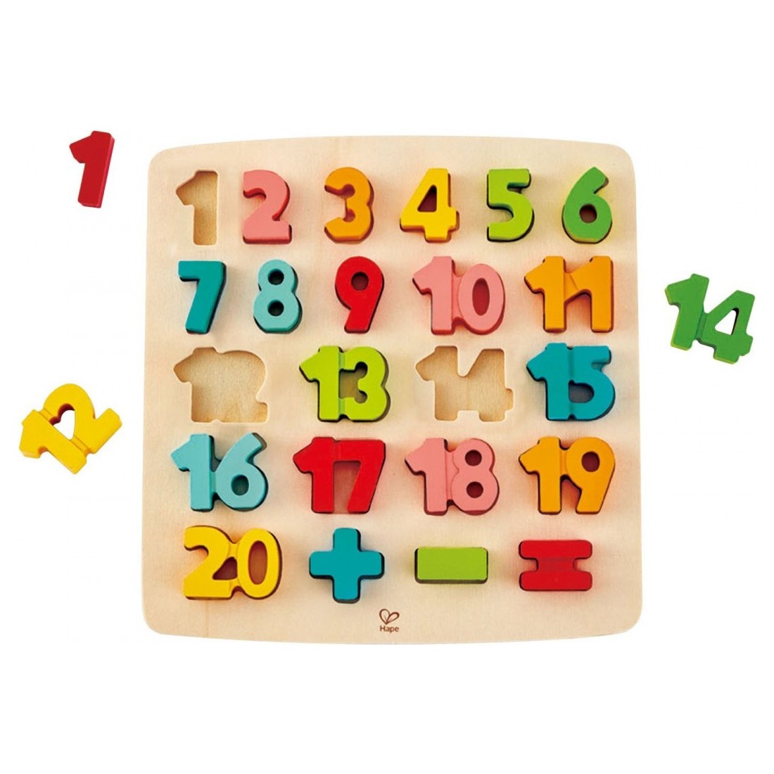 Un puzzle d'encastrement en bois pour les enfants à partir de 3 ans qui apprendront les chiffres et les nombres en s'amusant. Un puzzle éducatif de 1 à 20 ainsi que les signes "+", "-" et "=" pour aborder les premières notions de mathématiques. Votre enfant va s'amuser à découvrir les chiffres et les nombres, à les aligner, à les classer par couleurs..