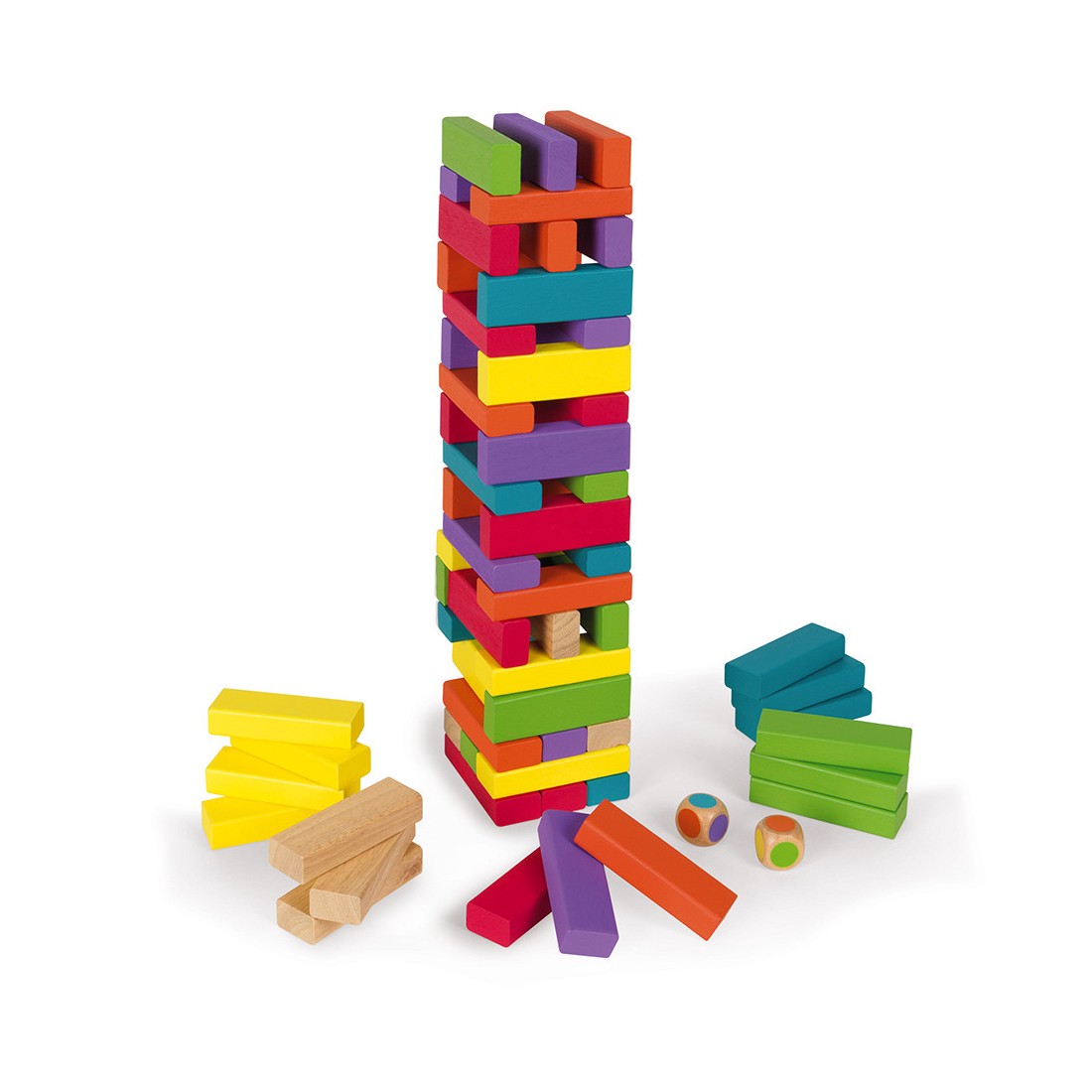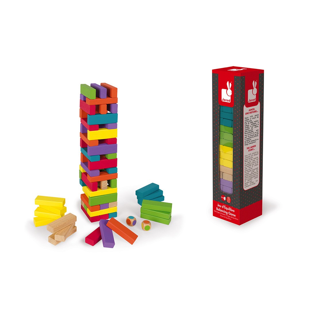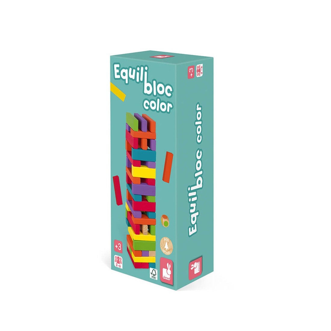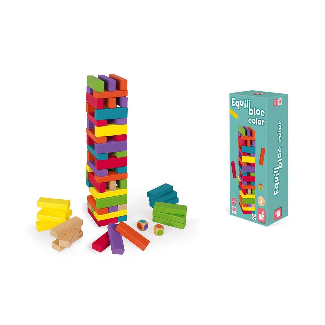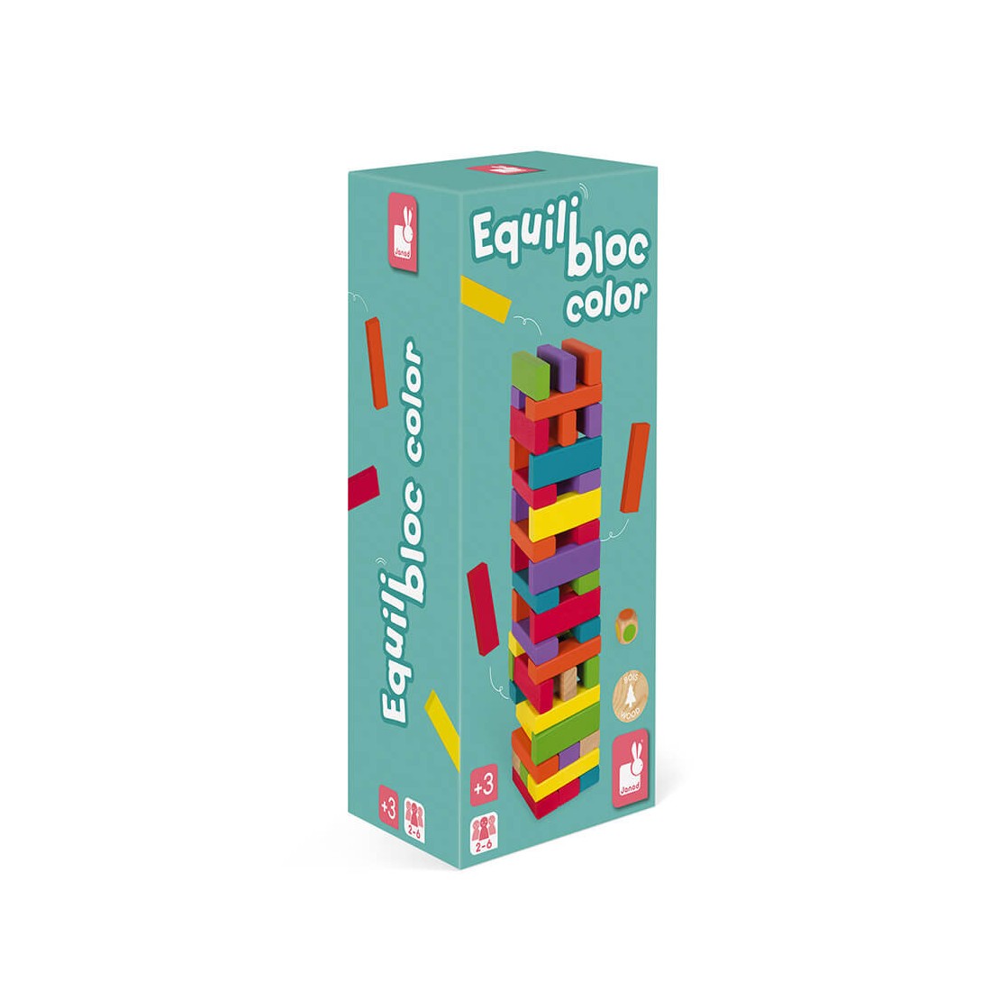 Equilibloc Color est un redoutable jeu d'adresse, pour les petits et les moins petits qui ont le coeur bien accroché. Le principe : retirer un à un les éléments de la tour (en fonction de la couleur donnée par le dé) en évitant à tout prix que celle-ci s'écroule. Plus facile à dire qu'à faire ...