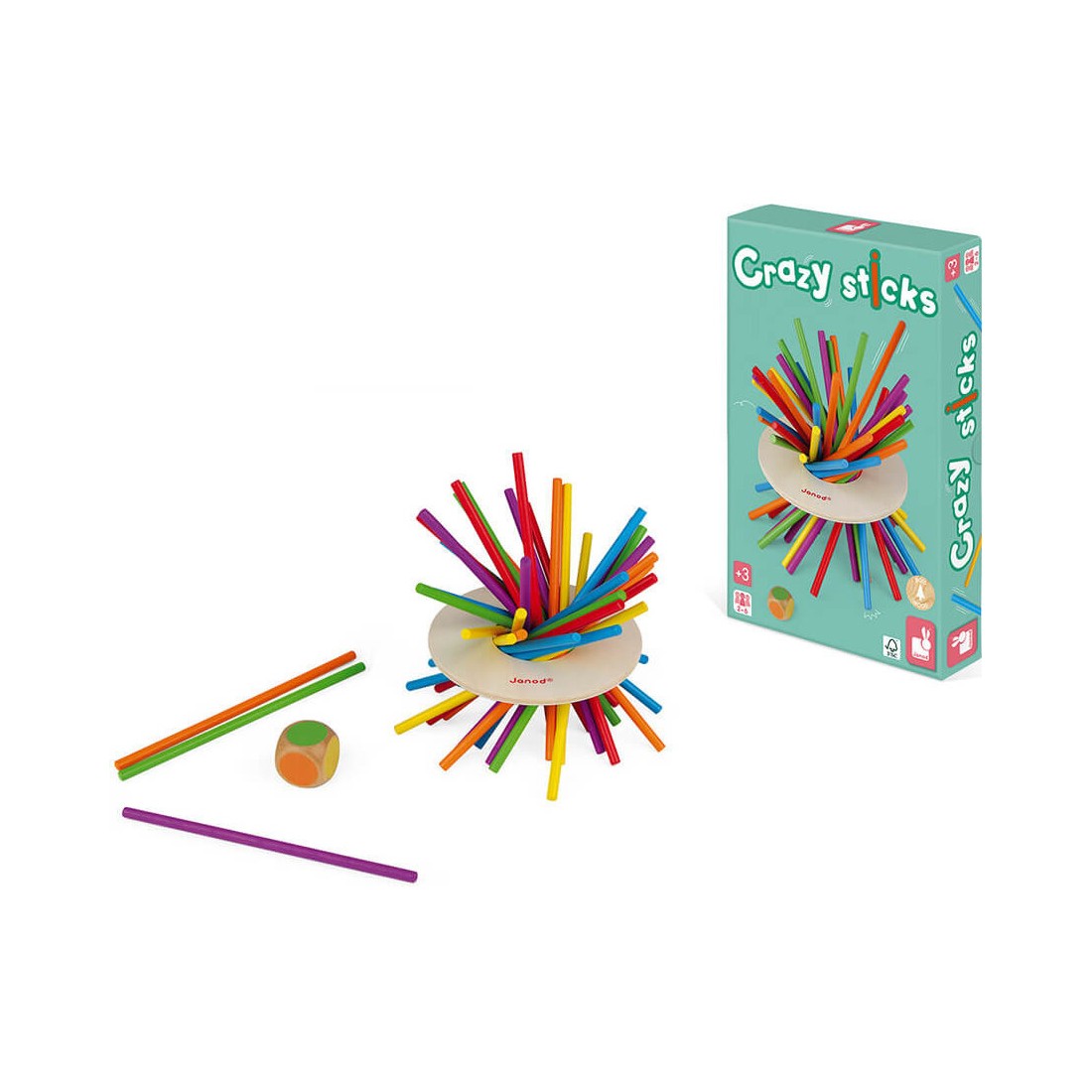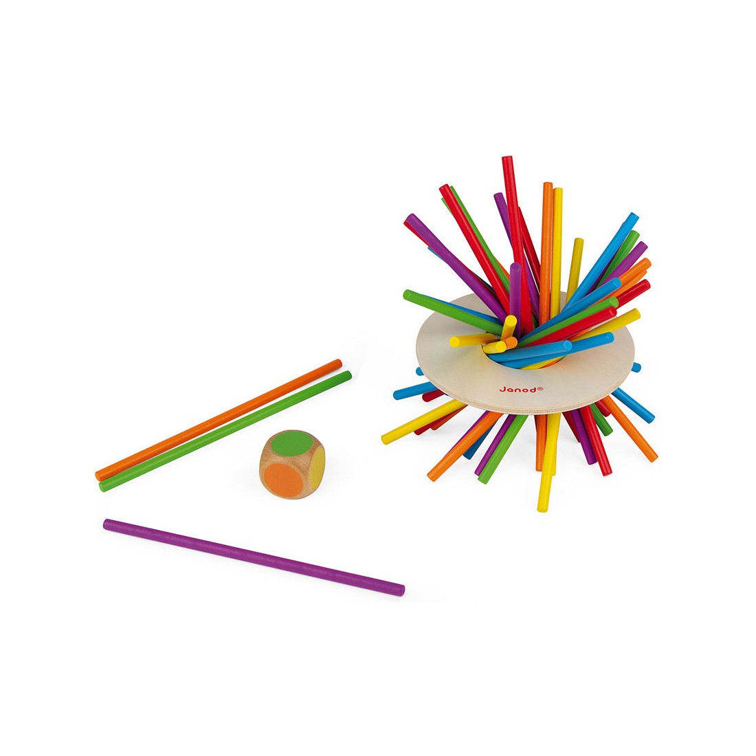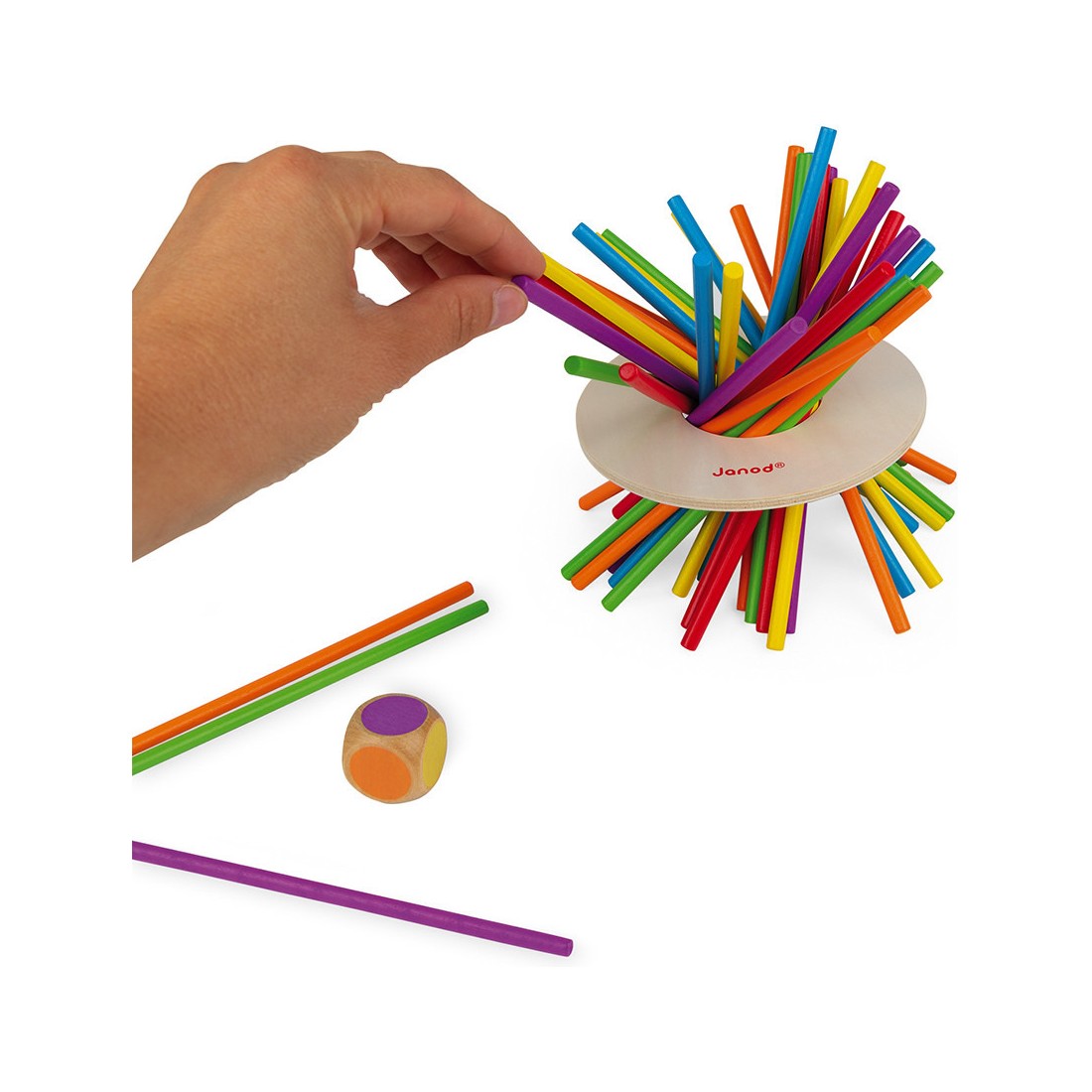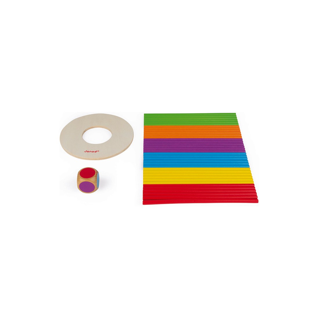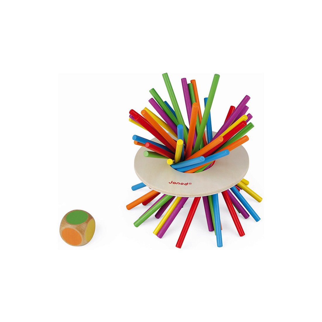 Si le disque touche la table, c’est perdu ! Ce jeu développe la motricité fine et la stratégie. Il sera idéal lors des journées pluvieuses en famille ou pour occuper les enfants avant le repas ! Ce jeu inclus 36 bâtons, un disque et un dé en bois.