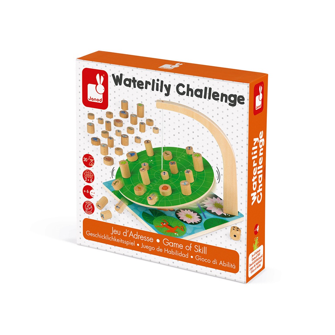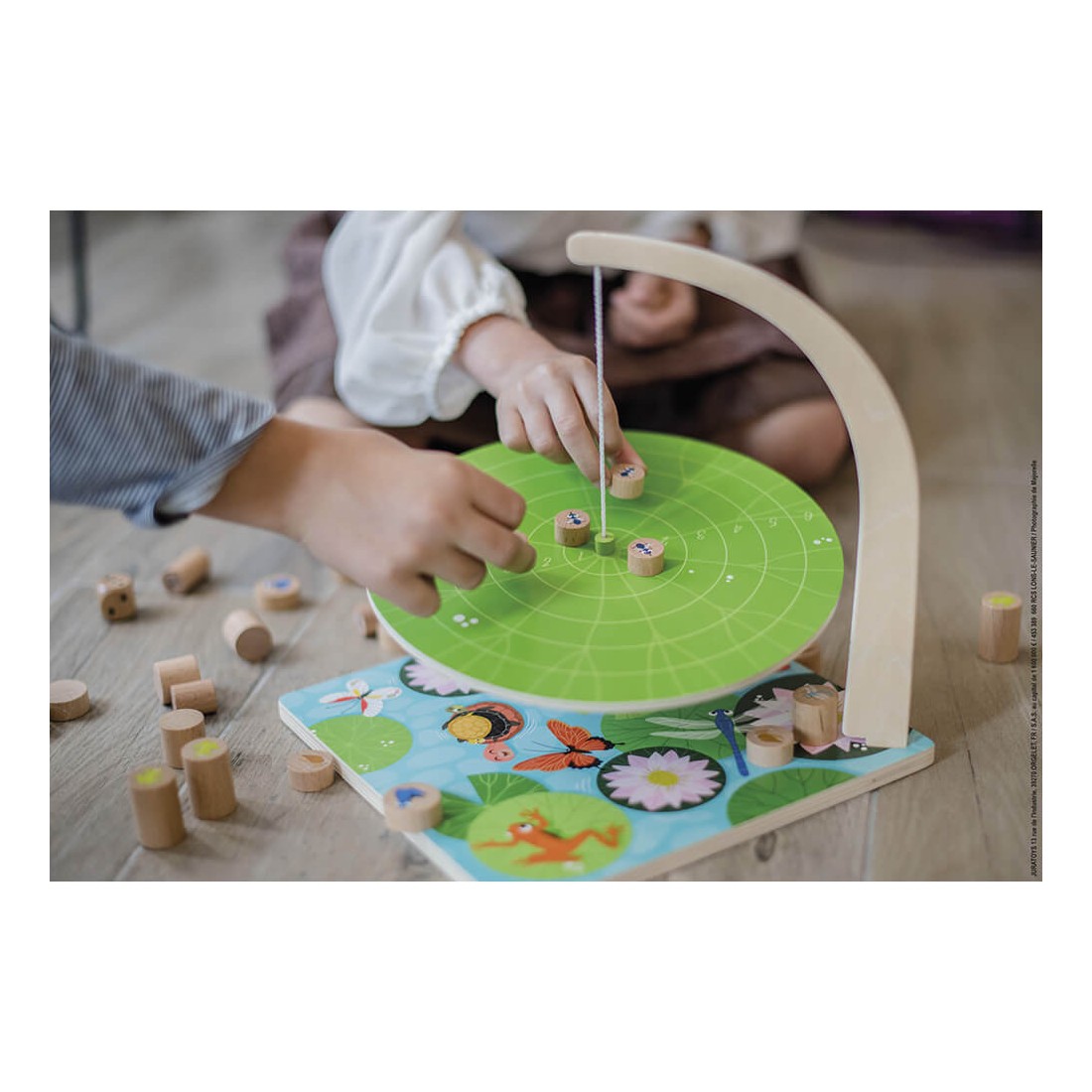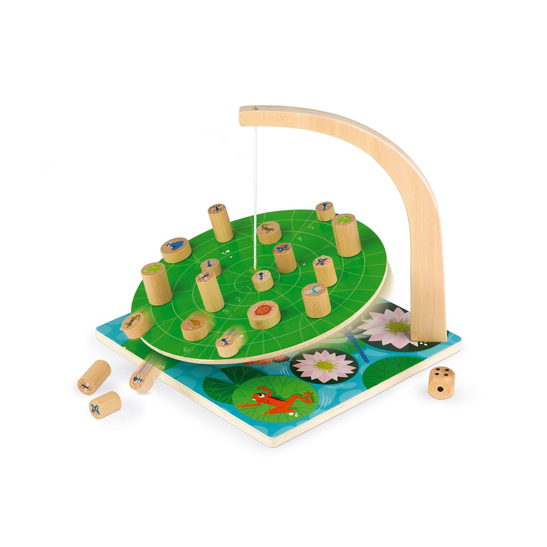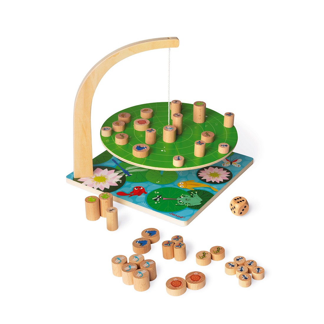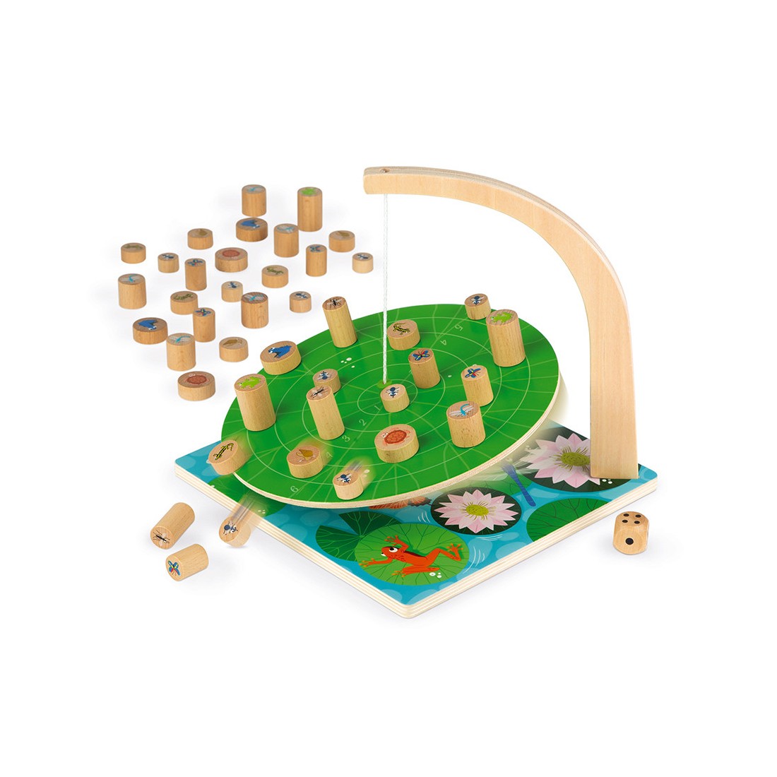 Qui sera le dernier dans la mare ? En suivant les indications du dé, chaque jouer doit choisir un animal ou un insecte et le placer sur le nénuphar sans le faire basculer, sinon Plouf c'est perdu !