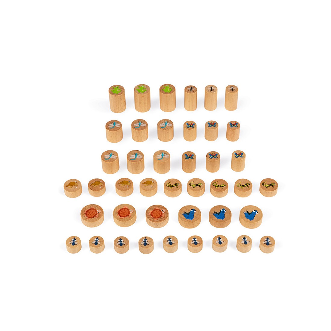 42 pions insecte/animal en bois de tailles différentes sont inclus, les règles du jeu sont disponibles en plusieurs langues.