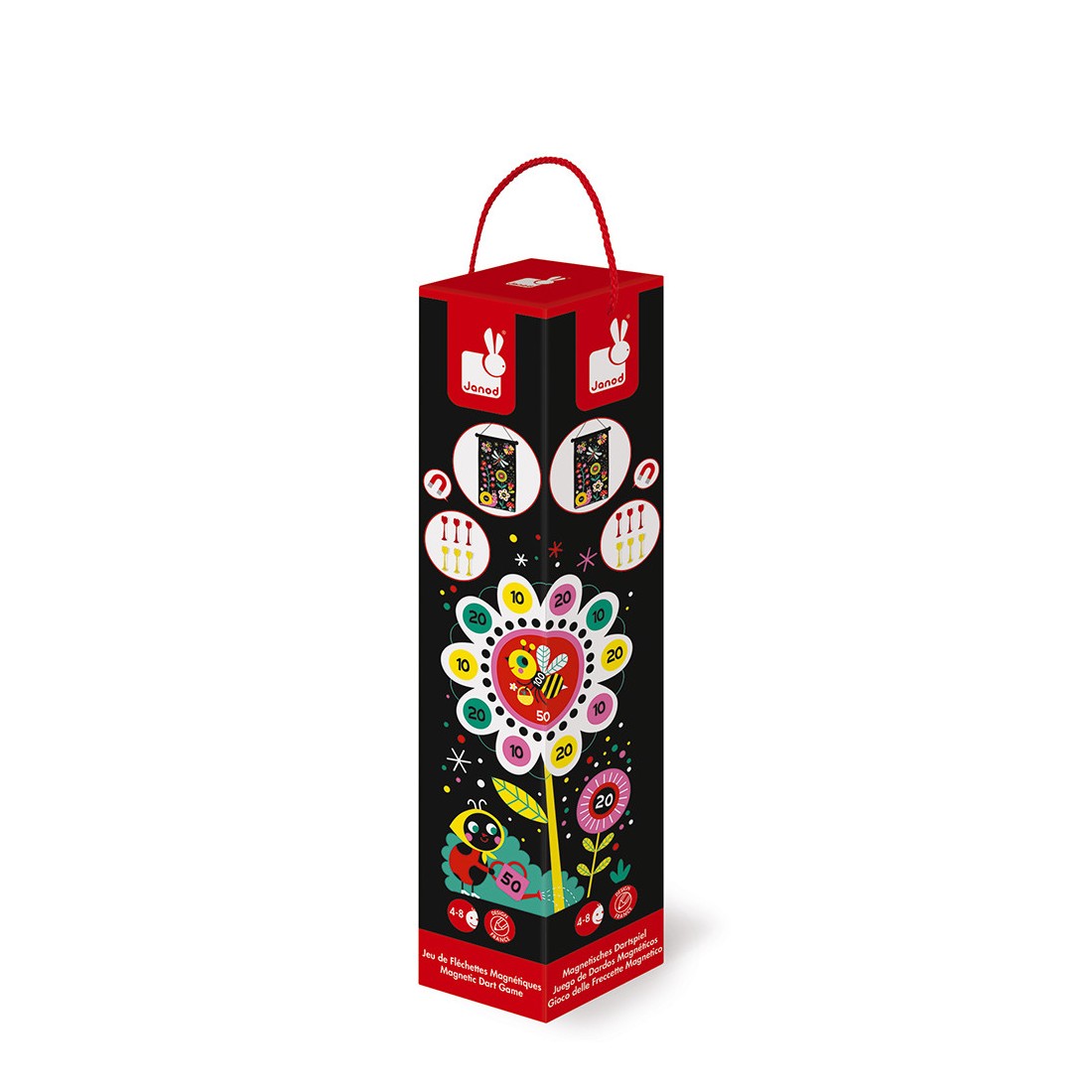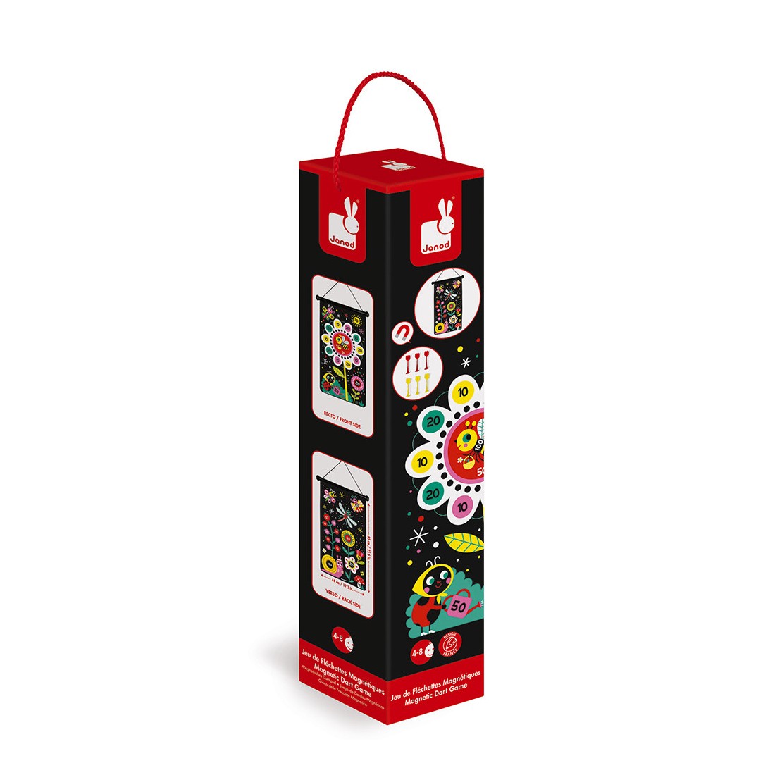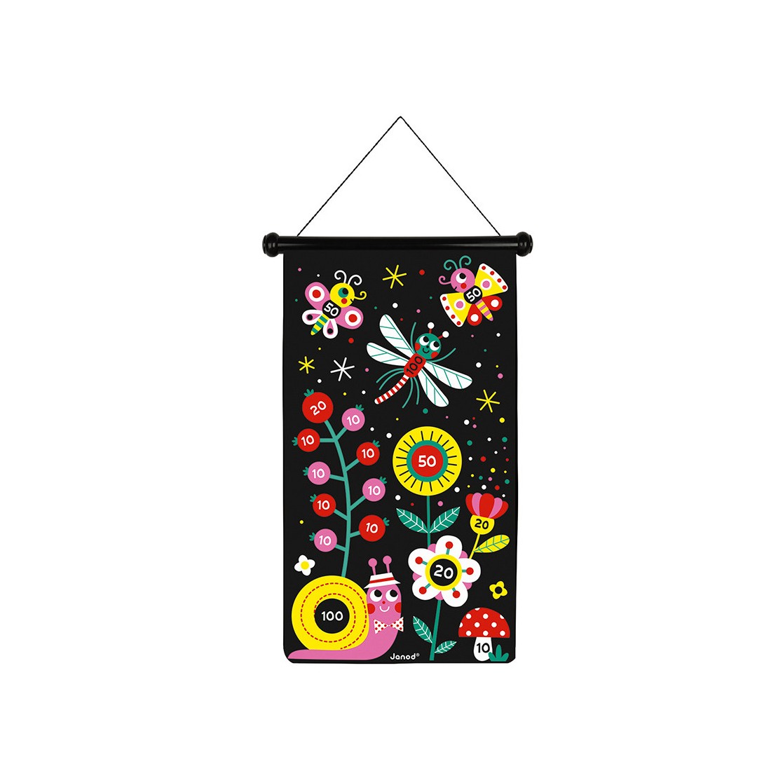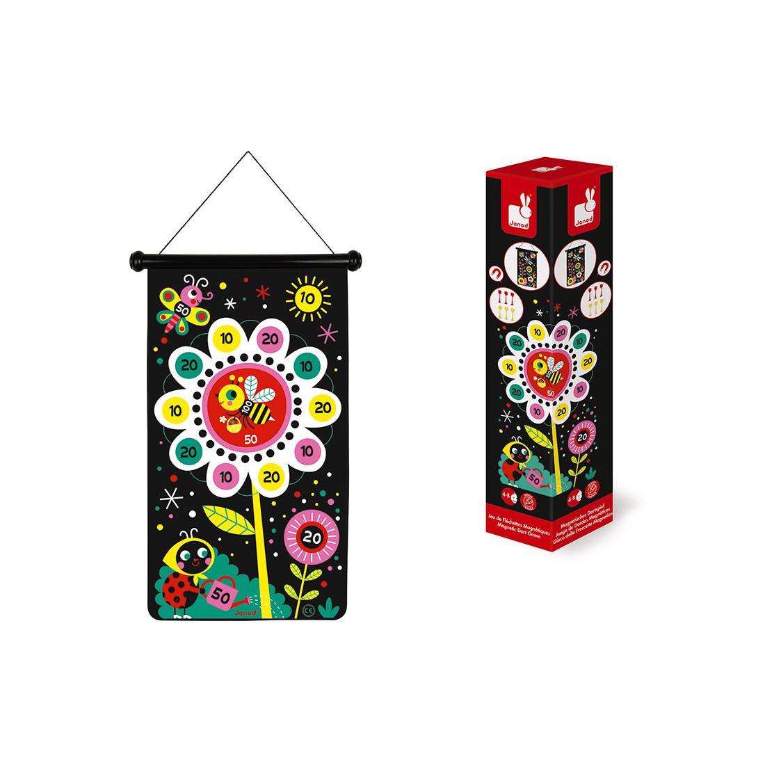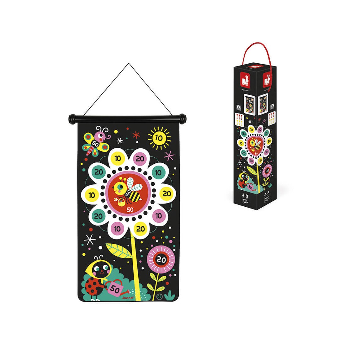 Découvrez le jeu de fléchette magnétique jardin de Janod, un jeu réversible sur le the? me du jardin et des fleurs, livre? avec 6 fle? chettes en plastique (3 rouges et 3 jaunes) et e? quipe? d'une ficelle en coton pour le suspendre. Le tissu magnétique est imprimé de chaque côté pour un double niveau de jeu afin d'amuser les plus grands et les plus petits.