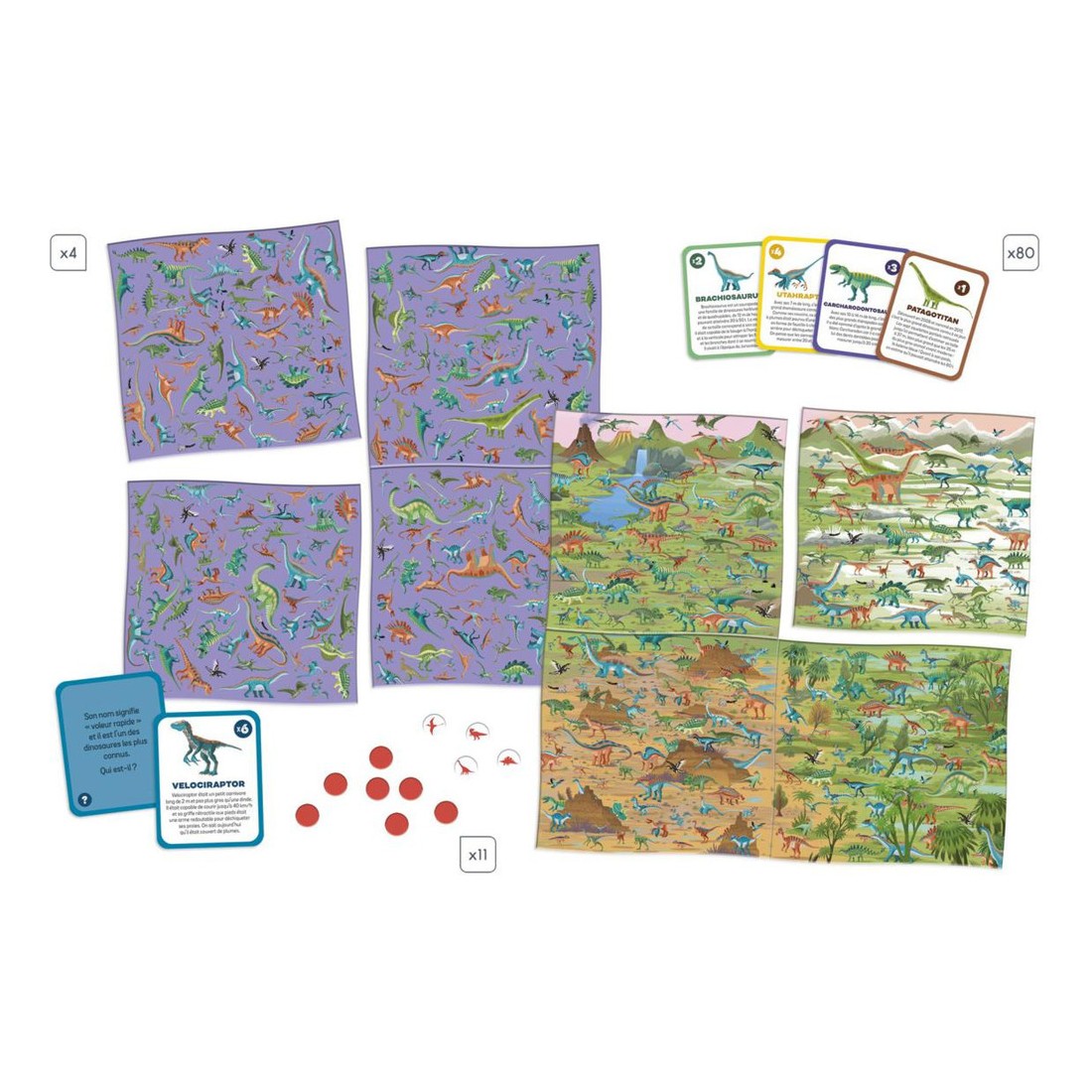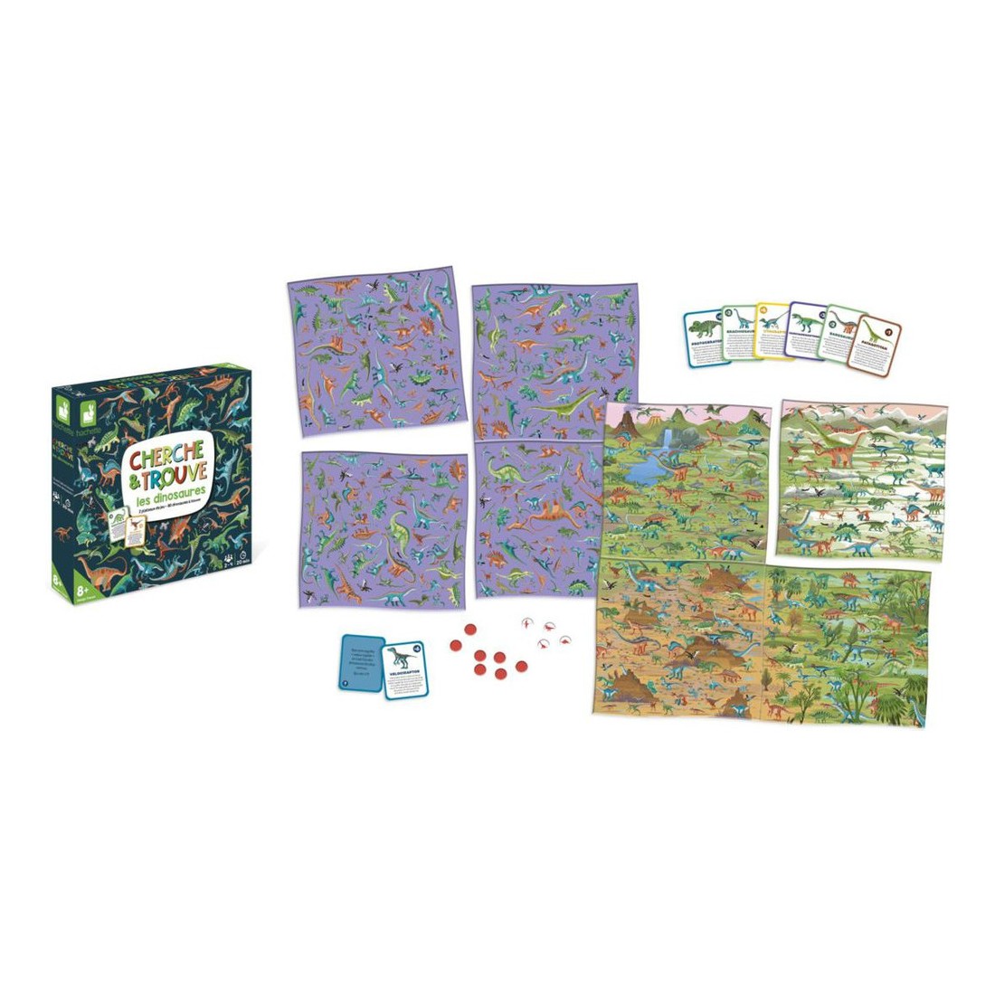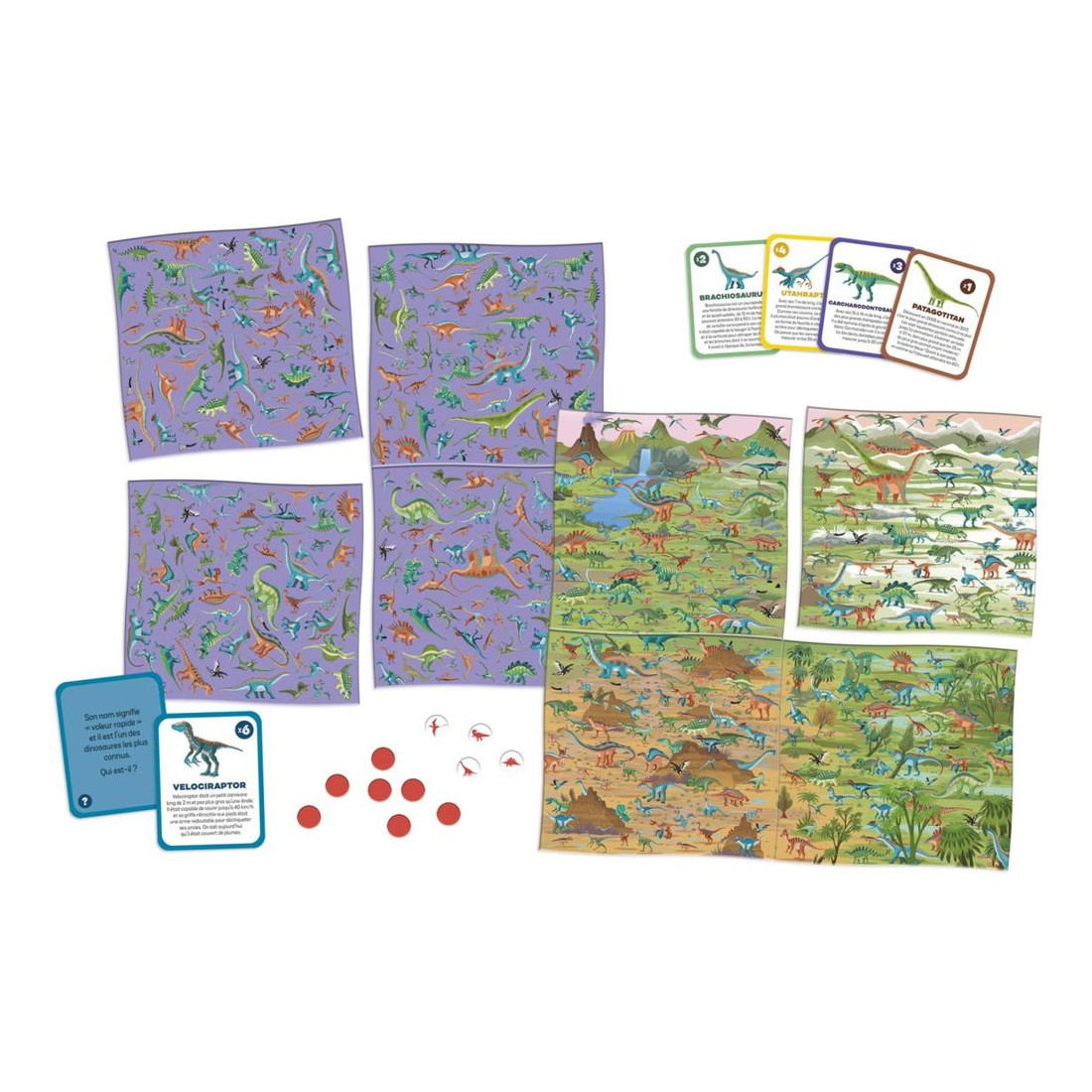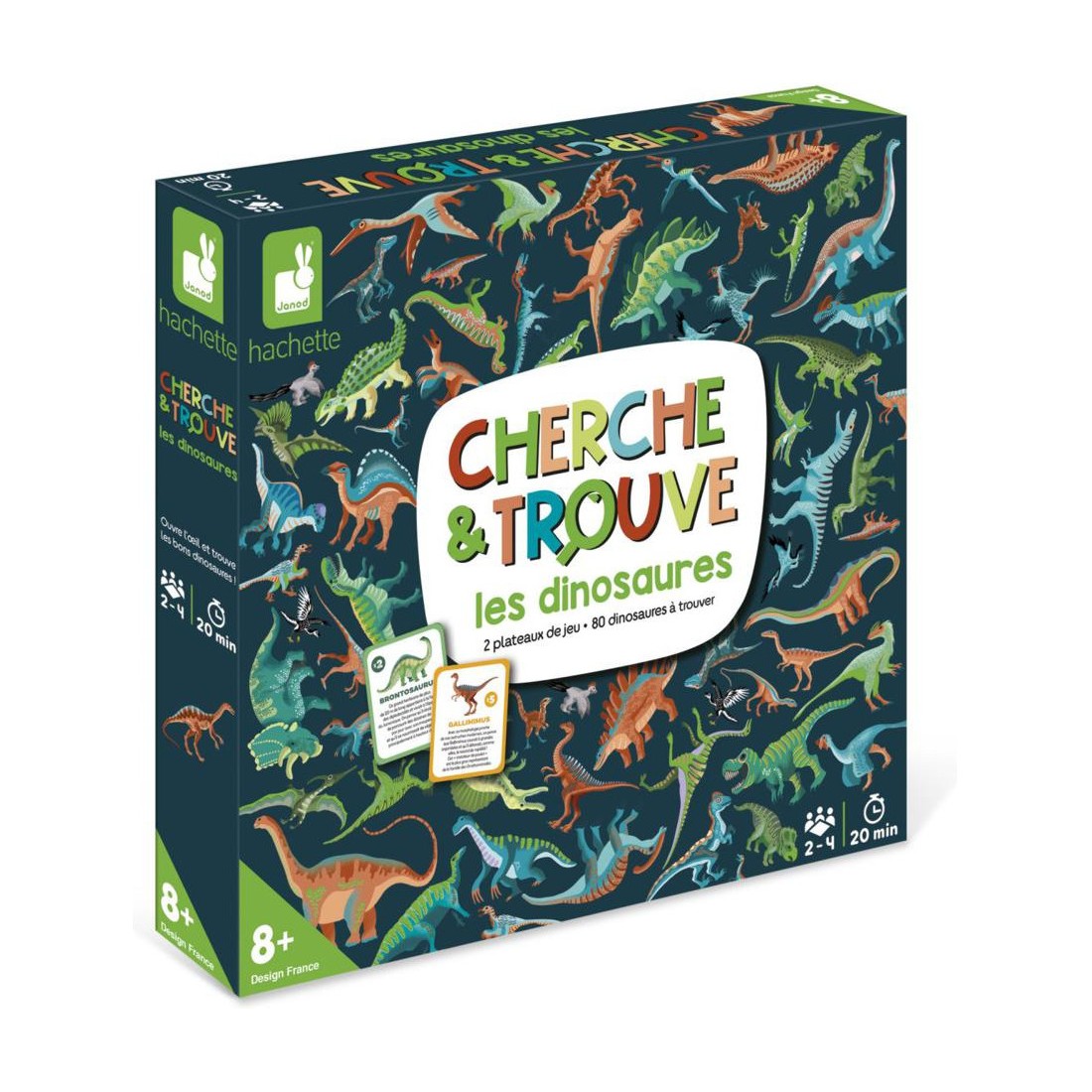 Voici le jeu idéal pour les petits fans de dinosaures dès 8 ans ! Partons à la recherche des plus beaux spécimens avec ce magnifique jeu de société Cherche et Trouve dinosaures. On commence par en apprendre plus sur les 60 différents dinosaures de ce jeu familial en répondant à une question, puis on part à la recherche de la réponse sur le plateau composé de 4 cartes en carton épais réversibles. Des fiches d'identité permettent d'apprendre beaucoup d'informations intéressantes sur les dinosaures avant de partir à leur recherche sur les plateaux de jeu. Amusez-vous avec 80 cartes devinettes ! La règle de ce jeu d'observation dinosaure est uniquement en français. Une partie dure environ 20 minutes et peut se jouer de 2 à 4 joueurs.