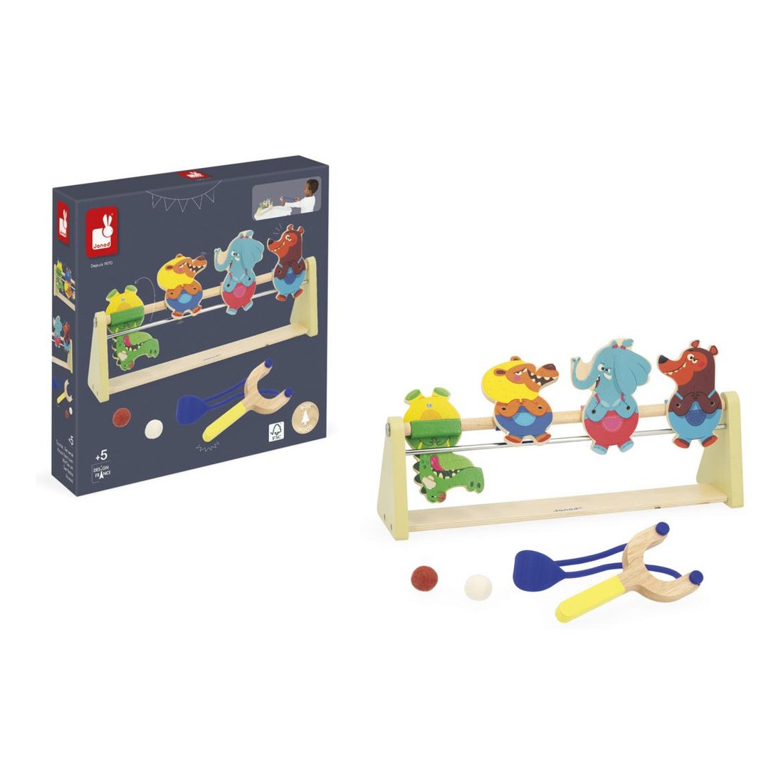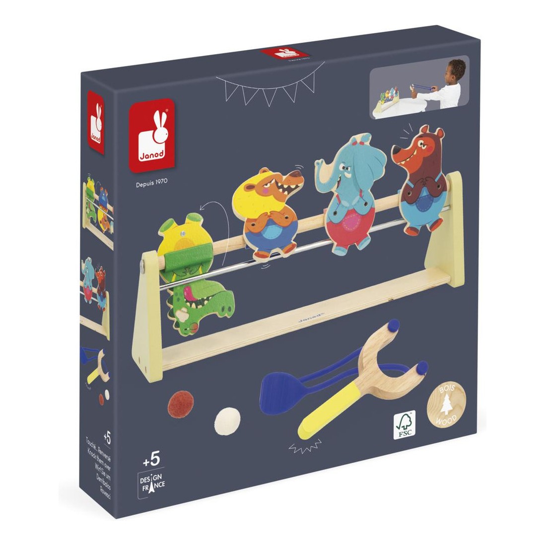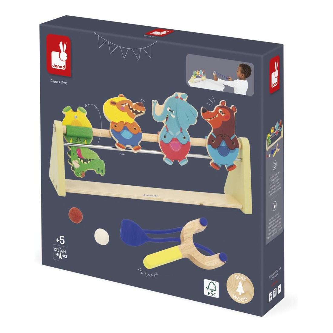 Un jeu renversant ! Idéal pour les enfants à partir de 5 ans, ce jeu d’adresse promet fou-rires et tirs de précisions en famille. Si vous êtes lassés des jeux de tir ou de lancer classiques, optez pour cette option beaucoup plus originale dont le principe est simple : munis de leur lanceur et d’une balle en feutrine, les enfants visent les animaux et tirent pour tenter de les renverser. Crocodile, lion, éléphant et ours ont plutôt l’air confiant : ils ne savent pas ce qui les attend ! Une fois la tête à l’envers, on fait moins les fiers ! Voilà un jeu type kermesse parfait pour développer la concentration, l’adresse, mais aussi la coordination. À vous d’adapter la distance entre le lanceur et les cibles pour différents niveaux de difficulté. Le lanceur en forme de lance-pierre et les animaux dingos qui composent ce jeu invitent au challenge ! Les personnages tiennent debout grâce à un système d’aimants et mesurent 11 cm de haut. Ce jeu d’adresse en bois est livré avec 2 balles. C’est l’occasion parfaite de réunir la famille ou les copains pour se lancer des défis tour à tour ! Animez vos soirées jeux en relevant le défi ! Ce jeu de kermesse est composé de bois issu de forêts gérées durablement, certifié Fsc™. Il fait partie de la grande collection Applepop, une collection de jeux funs et décalés inspirée de l’univers de la fête foraine. Touché … Renversé !