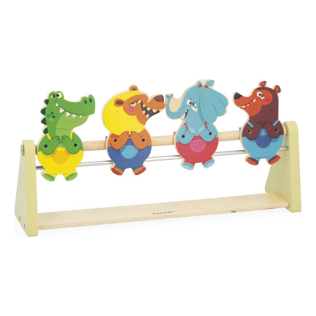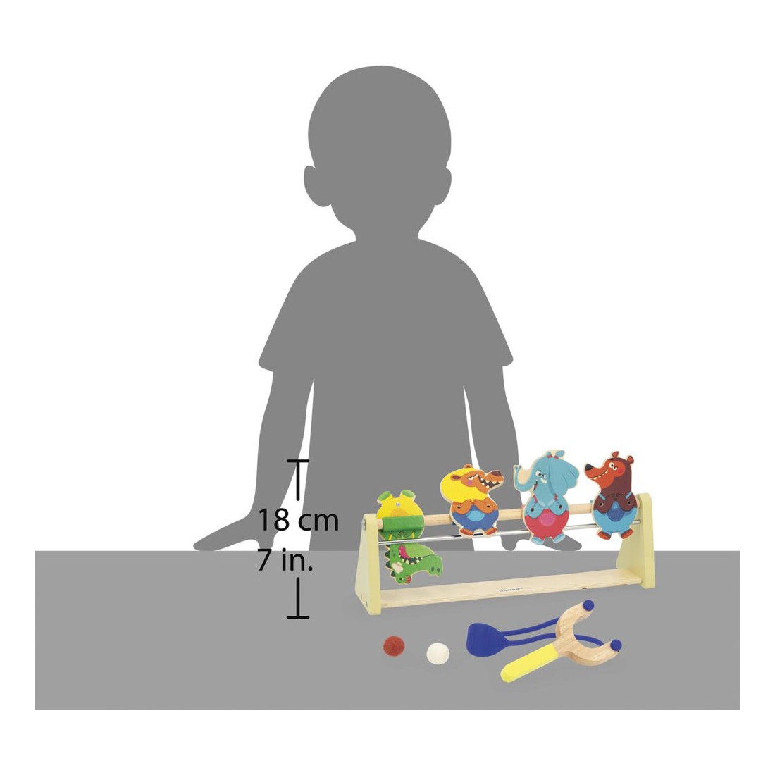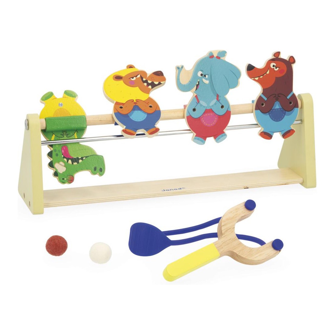 Un jeu renversant ! Idéal pour les enfants à partir de 5 ans, ce jeu d’adresse promet fou-rires et tirs de précisions en famille. Si vous êtes lassés des jeux de tir ou de lancer classiques, optez pour cette option beaucoup plus originale dont le principe est simple : munis de leur lanceur et d’une balle en feutrine, les enfants visent les animaux et tirent pour tenter de les renverser. Crocodile, lion, éléphant et ours ont plutôt l’air confiant : ils ne savent pas ce qui les attend ! Une fois la tête à l’envers, on fait moins les fiers ! Voilà un jeu type kermesse parfait pour développer la concentration, l’adresse, mais aussi la coordination. À vous d’adapter la distance entre le lanceur et les cibles pour différents niveaux de difficulté. Le lanceur en forme de lance-pierre et les animaux dingos qui composent ce jeu invitent au challenge ! Les personnages tiennent debout grâce à un système d’aimants et mesurent 11 cm de haut. Ce jeu d’adresse en bois est livré avec 2 balles. C’est l’occasion parfaite de réunir la famille ou les copains pour se lancer des défis tour à tour ! Animez vos soirées jeux en relevant le défi ! Ce jeu de kermesse est composé de bois issu de forêts gérées durablement, certifié Fsc™. Il fait partie de la grande collection Applepop, une collection de jeux funs et décalés inspirée de l’univers de la fête foraine. Touché … Renversé !