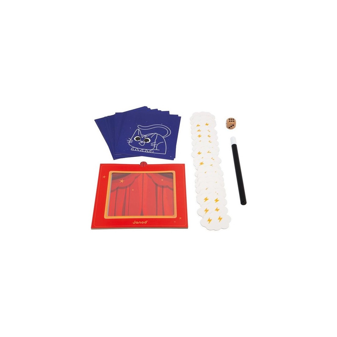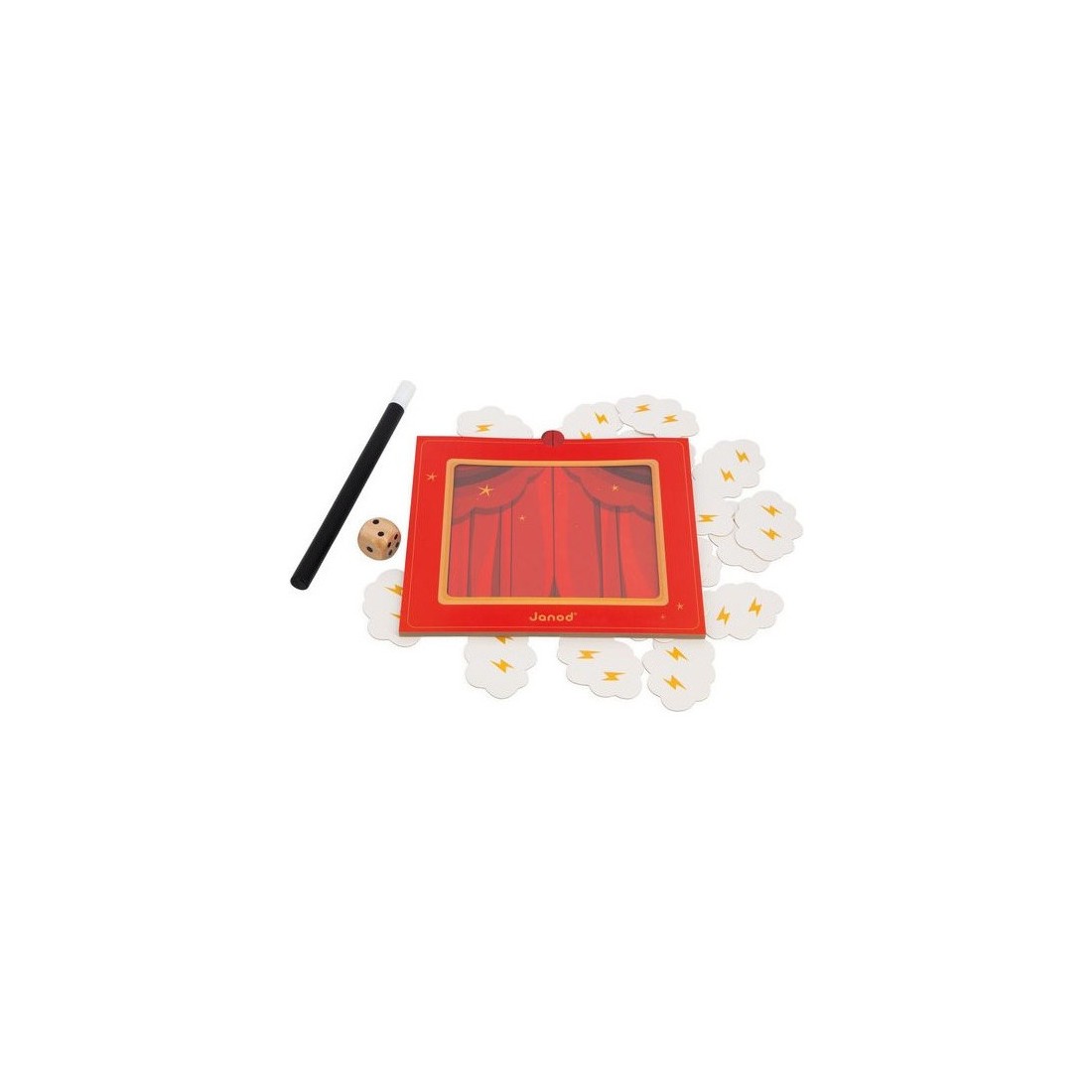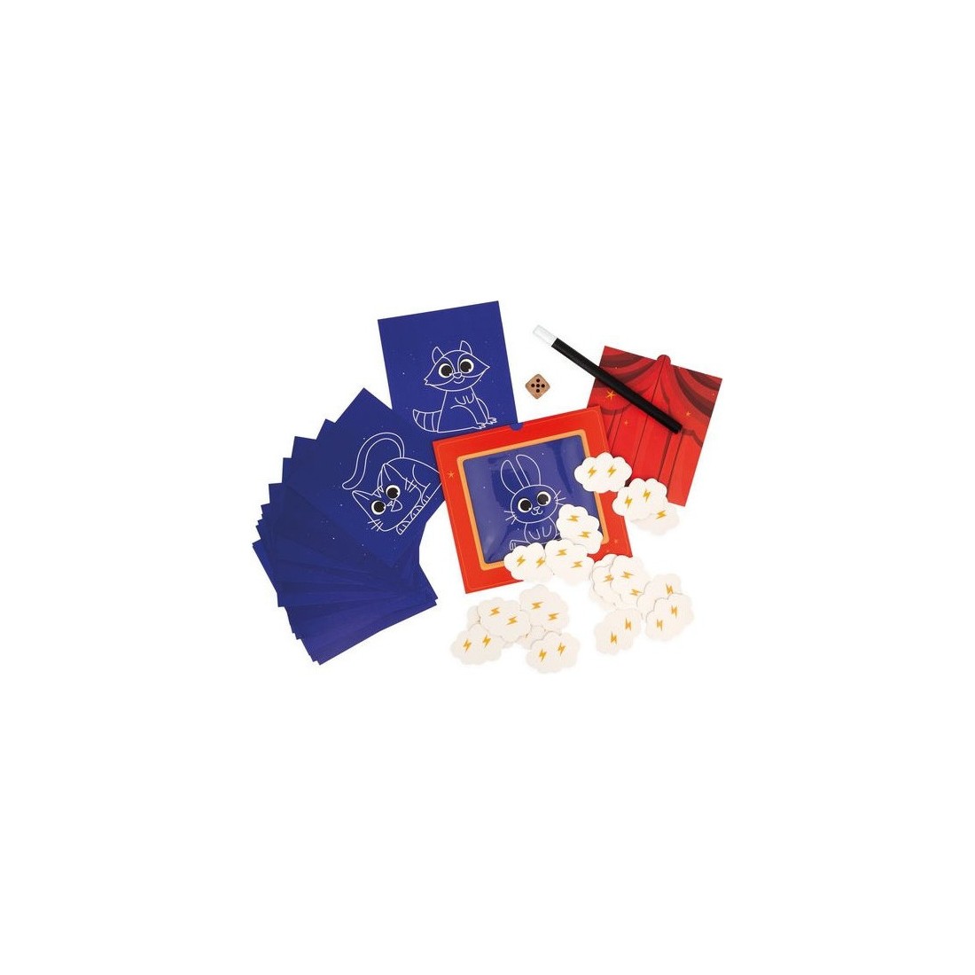 Abracadabra, petit lapin, es-tu là ? Découvrez un joli jeu de société inspiré de l'univers mystérieux de la magie ! Ce jeu d’observation et de déduction est conçu pour les enfants dès 3 ans. Ce jeu comprend un théâtre en carton avec son rideau, 20 illustrations à deviner, 18 nuages de fumée magnétiques, une baguette magique et un dé. Chaque élément du jeu est conçu avec soin pour captiver l’imagination des enfants et les immerger dans l’ambiance magique. Les nuages masquent une illustration qui a été préalablement glissée dans le théâtre. En lançant le dé et grâce à la baguette magique, les joueurs enlèvent les nuages petit à petit, chacun leur tour. L’illustration se découvre doucement … Le premier qui devine le bon animal a gagné la manche ! Ce jeu aux airs de théâtre magique, conçu pour deux joueurs ou plus, offre une expérience de jeu très originale. Les enfants apprennent à observer attentivement, à déduire à partir des indices visibles et à réagir rapidement. Ils développent ainsi leur capacité d’observation et de déduction, tout en s’amusant. Alors, êtes-vous prêt à lever le rideau et à découvrir l'animal caché derrière les nuages ? Avec ce jeu de société pour enfant, chaque partie est un nouveau spectacle. Alors, prenez votre baguette magique et à vous de jouer en famille ! Jeu de société en carton certifié Fsc™.