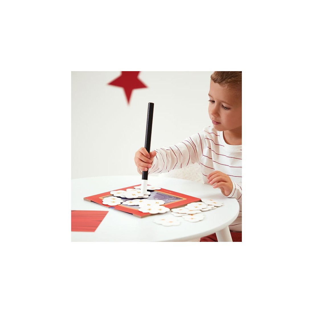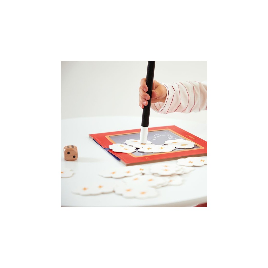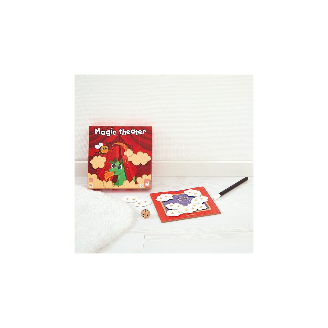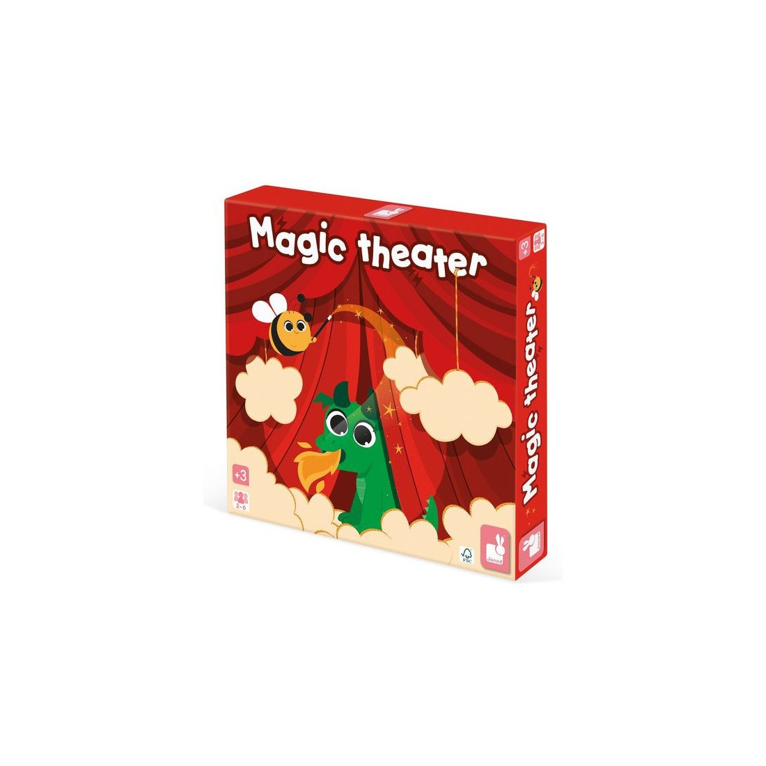 Abracadabra, petit lapin, es-tu là ? Découvrez un joli jeu de société inspiré de l'univers mystérieux de la magie ! Ce jeu d’observation et de déduction est conçu pour les enfants dès 3 ans. Ce jeu comprend un théâtre en carton avec son rideau, 20 illustrations à deviner, 18 nuages de fumée magnétiques, une baguette magique et un dé. Chaque élément du jeu est conçu avec soin pour captiver l’imagination des enfants et les immerger dans l’ambiance magique. Les nuages masquent une illustration qui a été préalablement glissée dans le théâtre. En lançant le dé et grâce à la baguette magique, les joueurs enlèvent les nuages petit à petit, chacun leur tour. L’illustration se découvre doucement … Le premier qui devine le bon animal a gagné la manche ! Ce jeu aux airs de théâtre magique, conçu pour deux joueurs ou plus, offre une expérience de jeu très originale. Les enfants apprennent à observer attentivement, à déduire à partir des indices visibles et à réagir rapidement. Ils développent ainsi leur capacité d’observation et de déduction, tout en s’amusant. Alors, êtes-vous prêt à lever le rideau et à découvrir l'animal caché derrière les nuages ? Avec ce jeu de société pour enfant, chaque partie est un nouveau spectacle. Alors, prenez votre baguette magique et à vous de jouer en famille ! Jeu de société en carton certifié Fsc™.