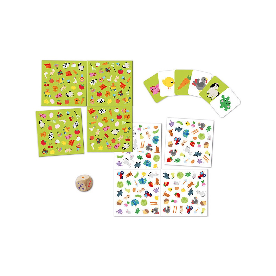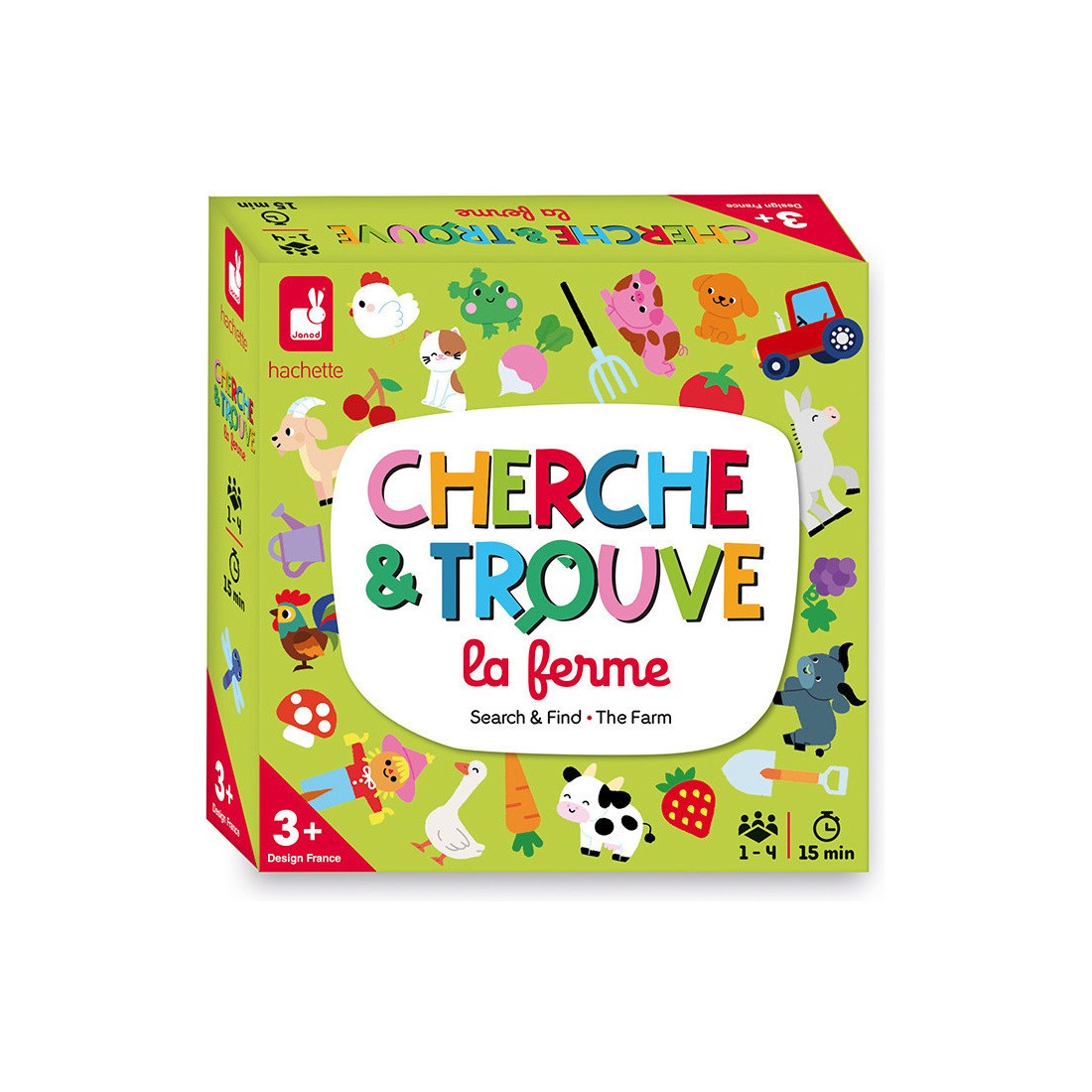 Un petit tour à la ferme, ça vous dit ? Ce jeu de Cherche et Trouve est destiné aux enfants à partir de 3 ans. L'objectif : retrouver l'élément de sa carte sur le plateau autant de fois que le nombre indiqué sur le dé. À la ferme, ce sont des animaux rigolos, des fruits et légumes et aussi des engins qu'il faudra retrouver !