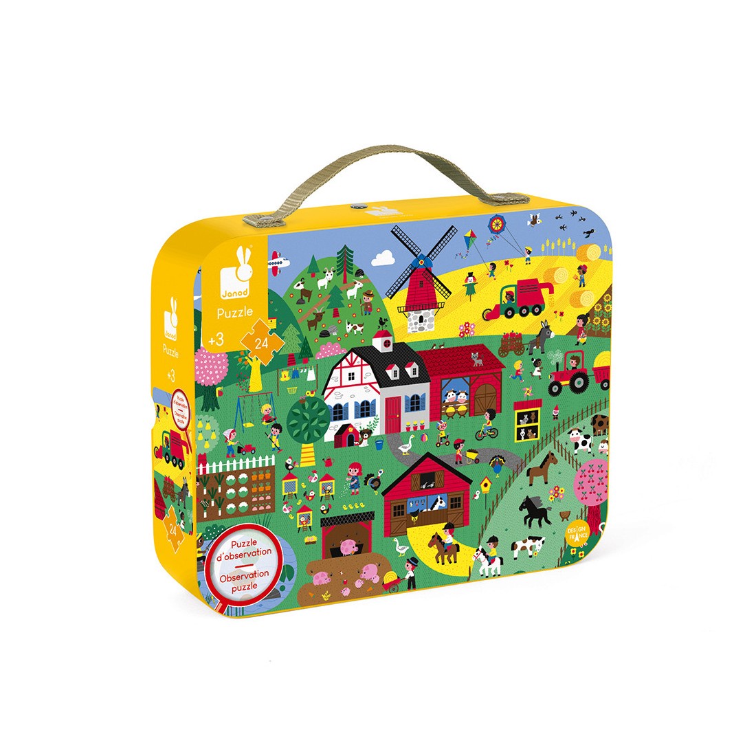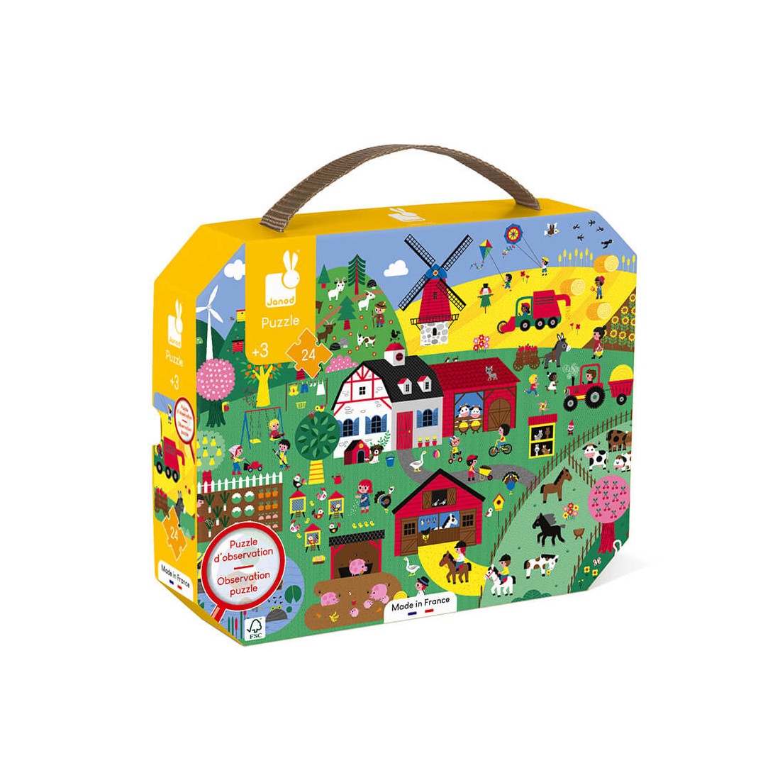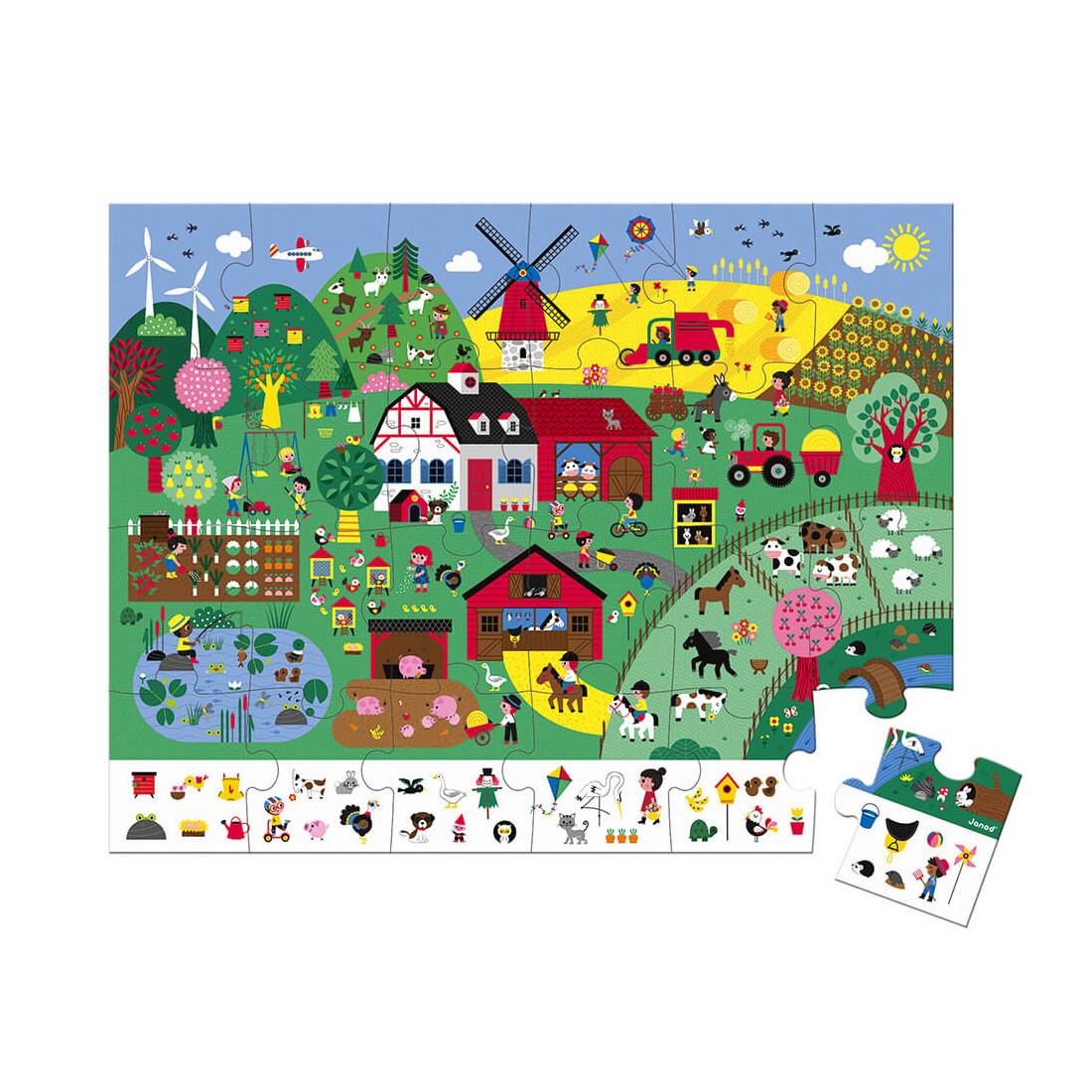 Puzzle enfant 2-1 adapté dès 3 ans. Ce puzzle de 24 pièces (54 x 41 cm) sur le thème de la vie à la ferme se transforme en jeu d'observation une fois qu'il est reconstitué : l'enfant doit retrouver les 35 éléments (animaux, personnages, objets.. ) indiqués directement dans la frise en-dessous.. Il devra faire preuve de patience et de concentration pour retrouver tous les éléments au sein du décor richement illustré et très coloré !