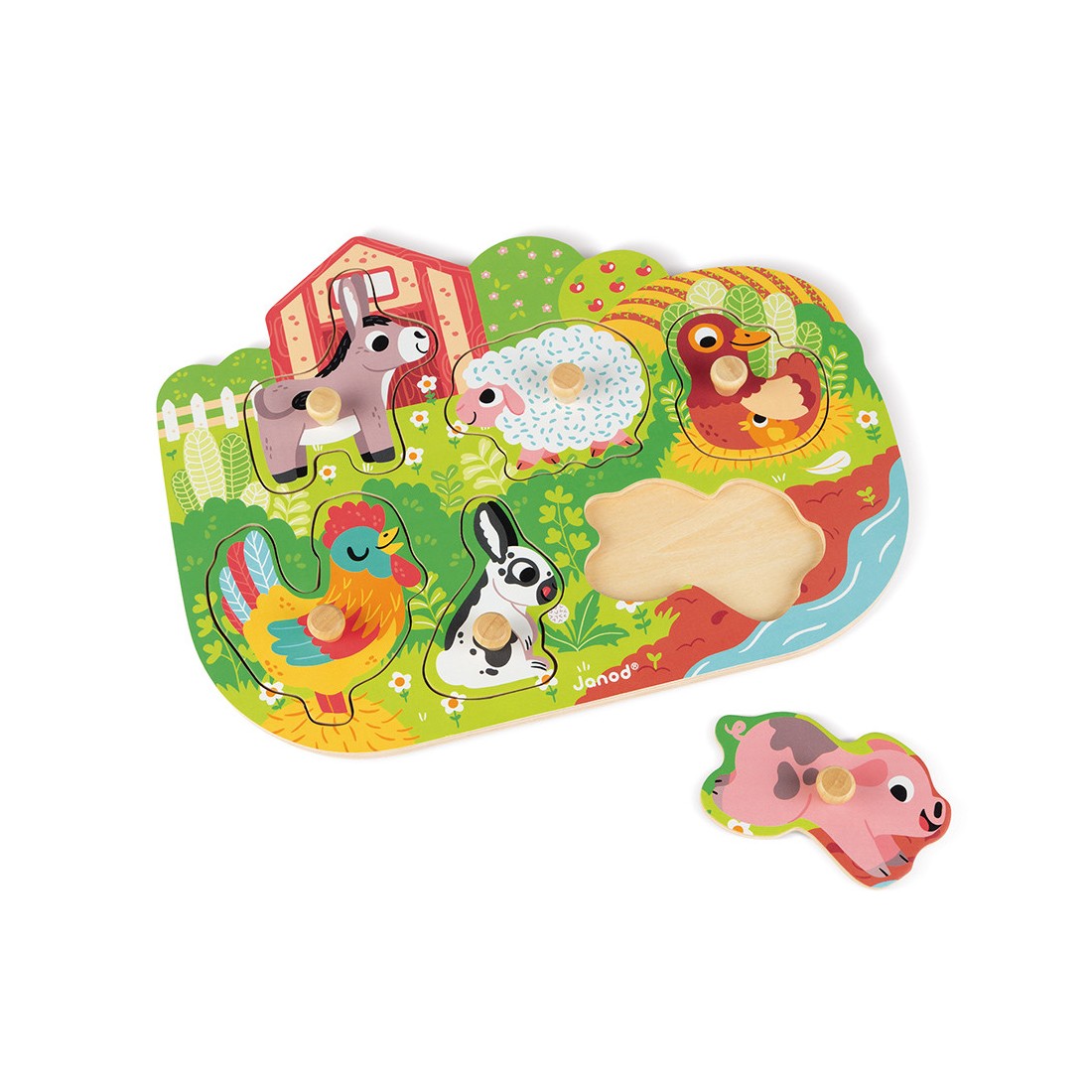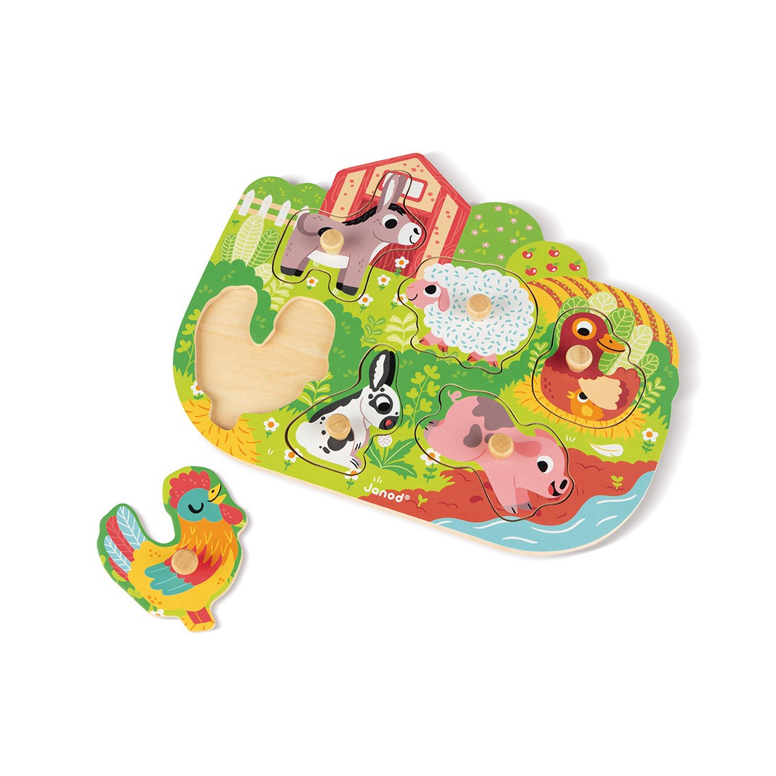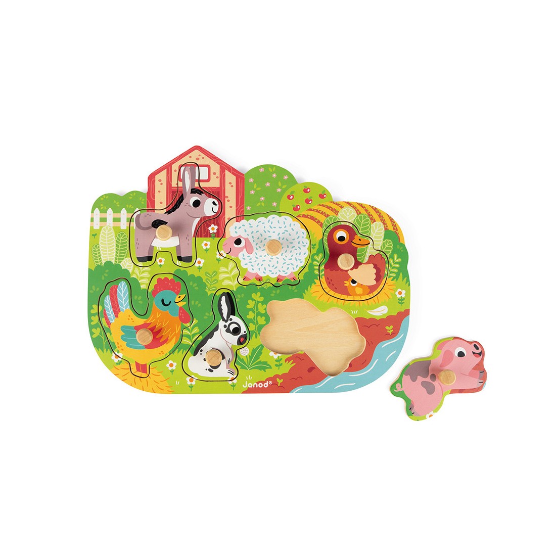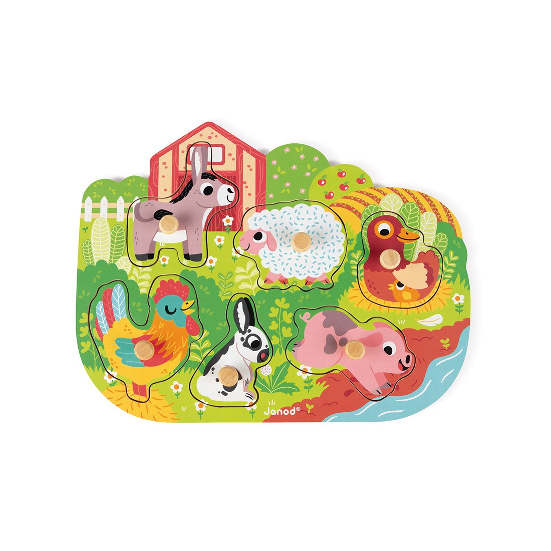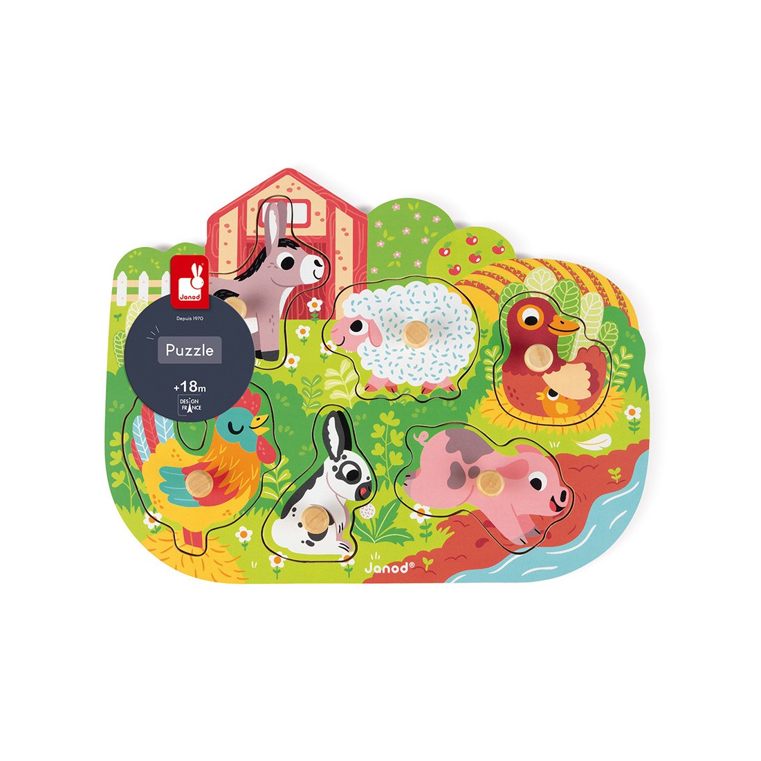 Avec ce puzzle encastrement votre enfant à partir de 18 mois apprend à replacer les petits animaux de la ferme au bon endroit. Une manière de découvrir ou redécouvrir les animaux de la ferme (le mouton, la poule, l'âne, le cochon, le canard et le lapin) tout en exerçant sa motricité fine.