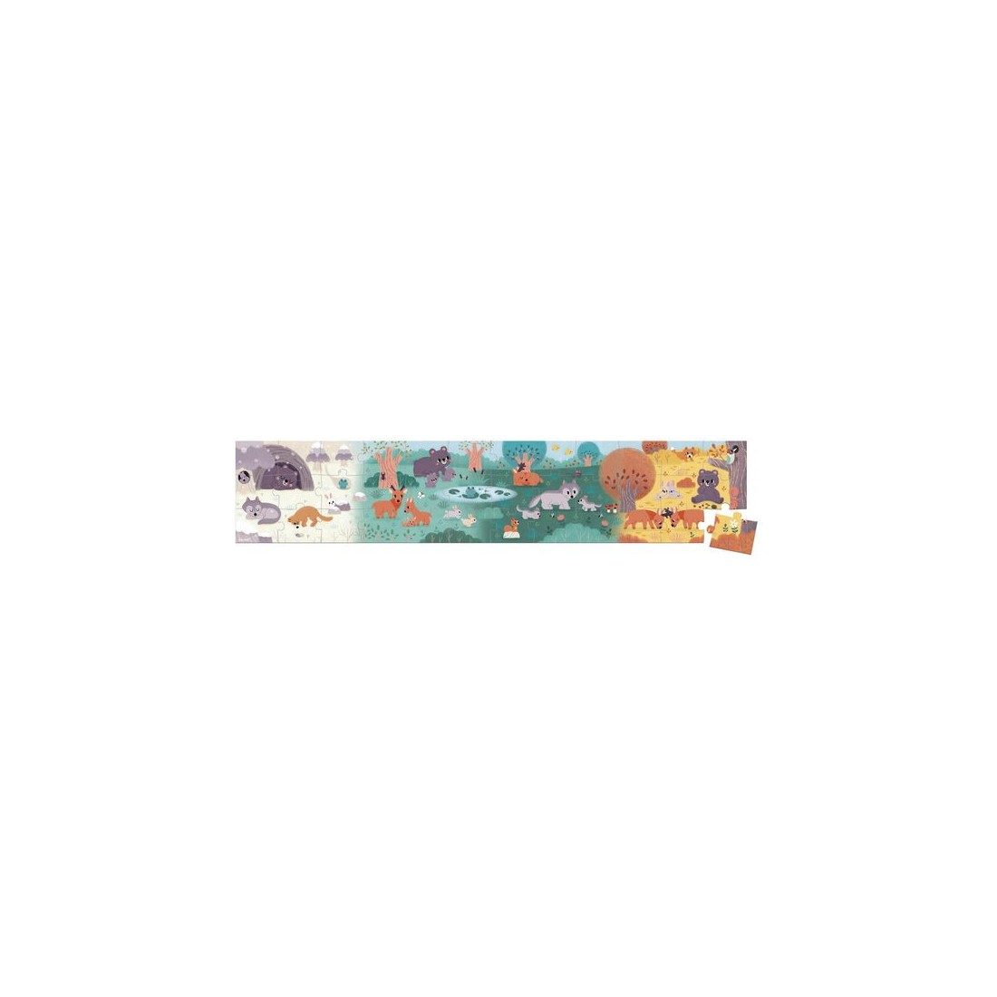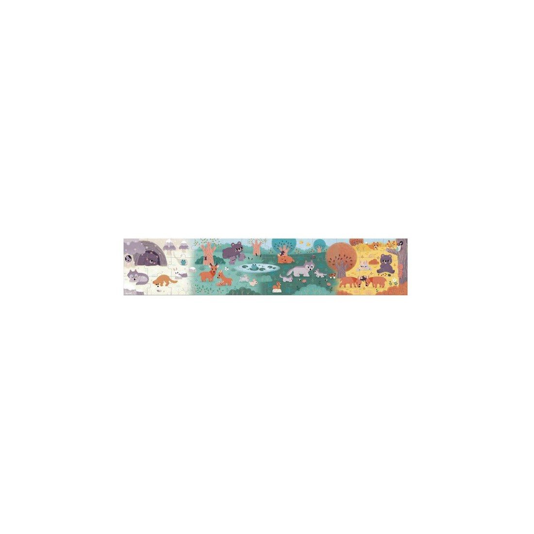 C'est parti pour la découverte de la vie de nos animaux sauvages préférés au fil des saisons ! Laissez les enfants découvrir pas à pas un univers de douceur grâce à ce joli puzzle panoramique de 36 pièces ! Une fois terminé, ce jeu de concentration en carton certifié Fsc® mixte (bois issu de forêts gérées durablement) et fabriqué en France avec des encres végétales, mesure 1 mètre de long et permet de se plonger dans la vie de la forêt en hiver, printemps, été et enfin automne !