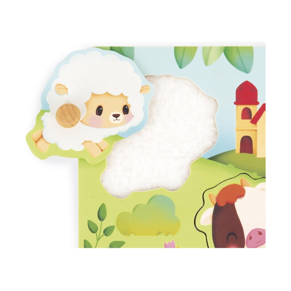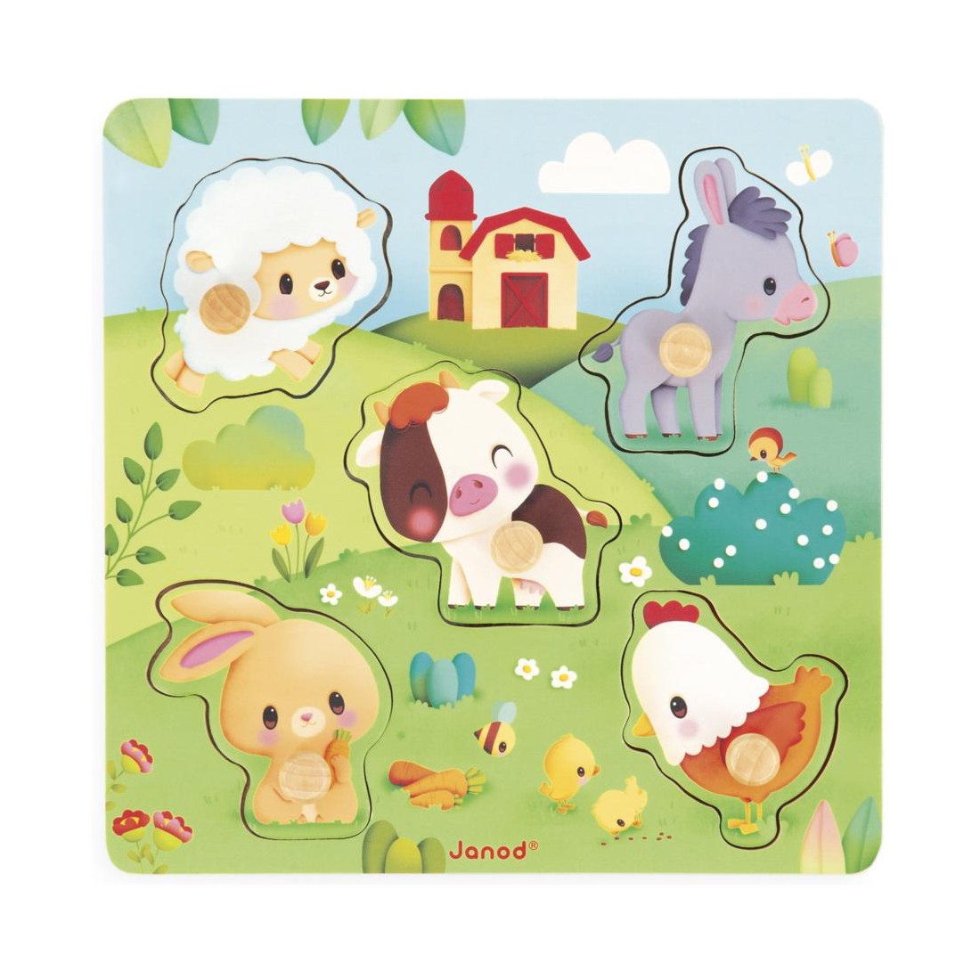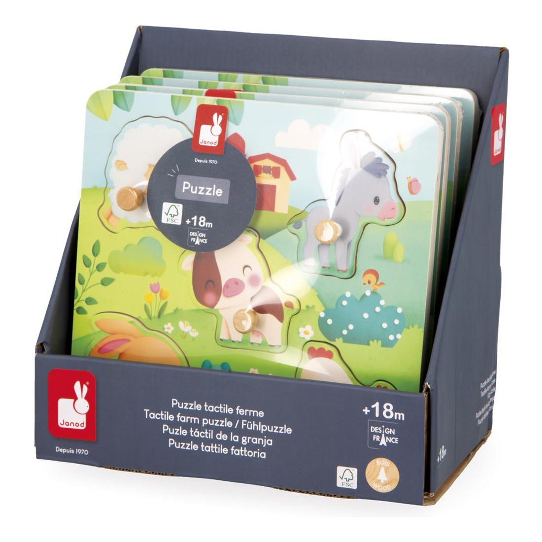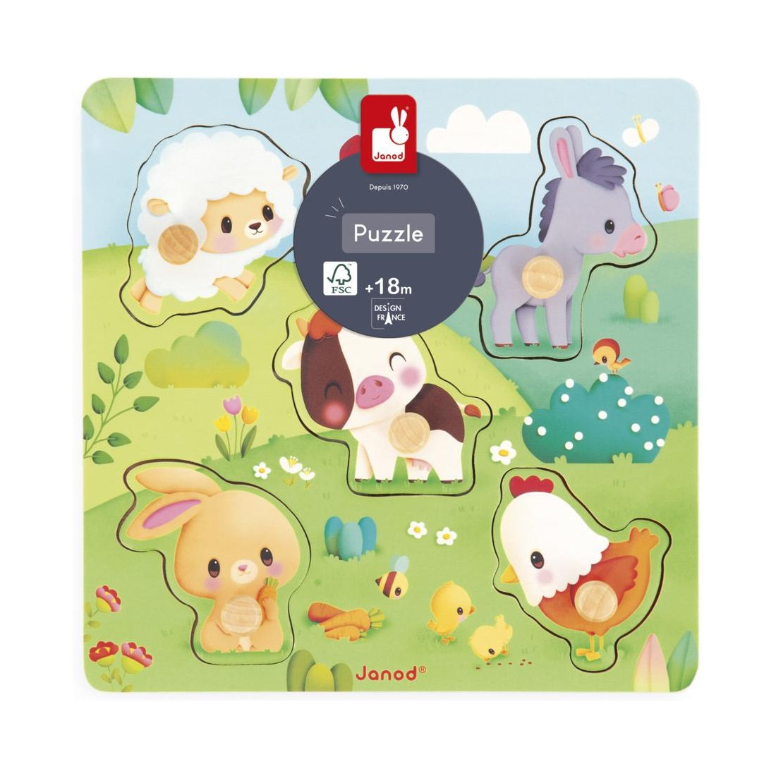 Un puzzle, oui, mais tactile ! Sur le thème de la ferme, ce puzzle en bois convient aux bébés dès l’âge de 18 mois. Composé de 5 pièces, ce puzzle à tenons a été pensé spécialement pour les petites mains curieuses. Les pièces ont des bords arrondis et des tenons en bois pour faciliter leur préhension.