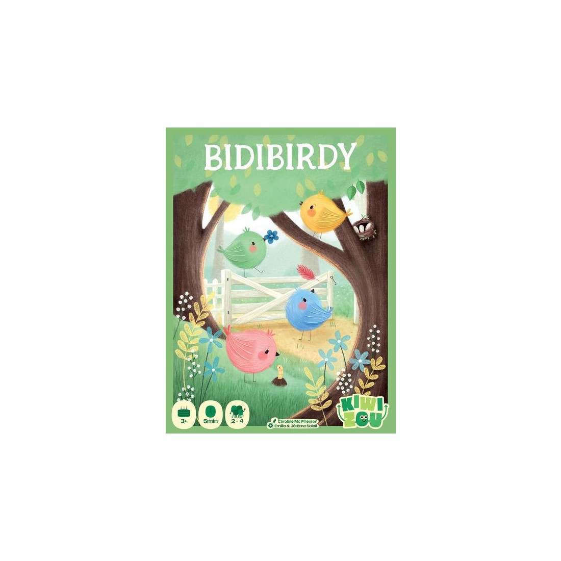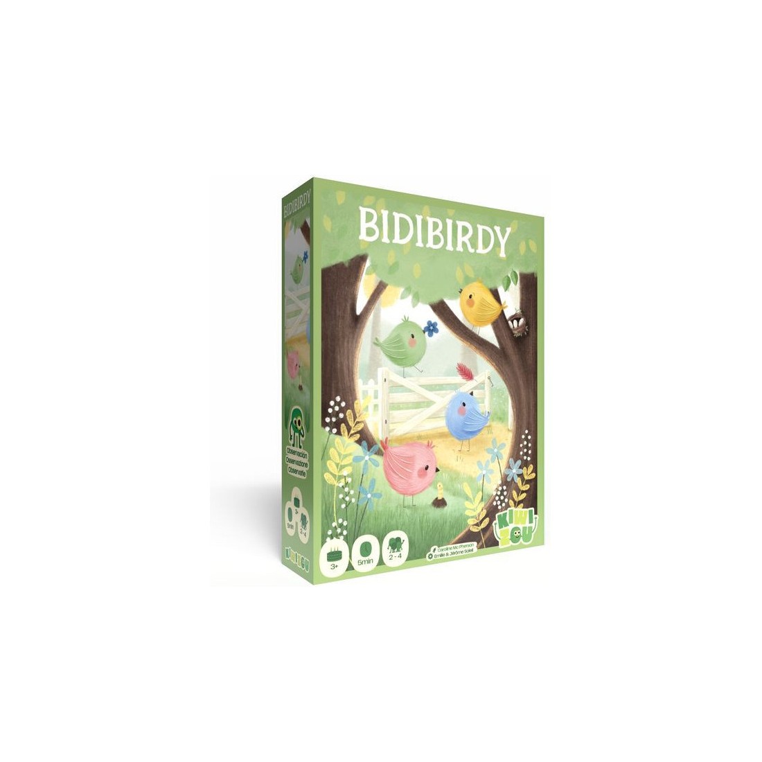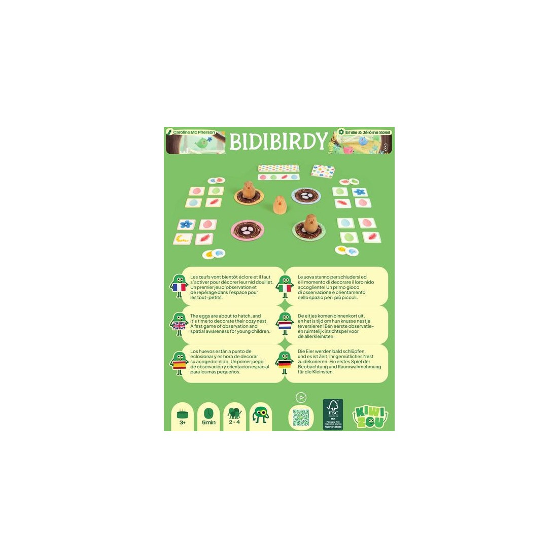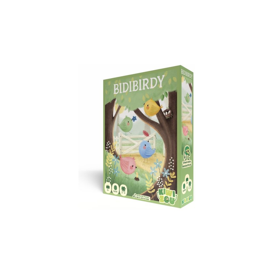 Chaque joueur a un nid et 4 tuiles Déco. Les Déco sont recto-verso avec un œuf sur une face et une décoration sur l’autre. Les oiseaux sont posés sur la table accessibles à tous. À chaque tour de jeu, une carte Défi est retournée qui indique 4 éléments. Tous en même temps, les joueurs cherchent parmi leurs tuiles Déco, les 4 faces de la carte défi. Pour cela, il faut manipuler les tuiles, les retourner pour retrouver les 4 bonnes faces. Dès qu’un joueur a retrouvé les 4 faces, il attrape un des oiseaux et le pose sur son nid. Puis on vérifie les tuiles : Si c’est correct, le joueur gagne un jeton bébé oiseau. Si les tuiles ne correspondent pas à la carte défi, le joueur ne gagne rien. Le joueur qui n’a pas attrapé d’oiseau ne gagne rien non plus. Afin de prolonger l’expérience de jeu et pour évoluer avec l’enfant, Bidibirdy propose un 2ème niveau de difficulté : il faut retrouver les 4 bons éléments, Et positionner ses 4 tuiles en carré à l’identique de la carte. Contenu :- 4 plateaux nids