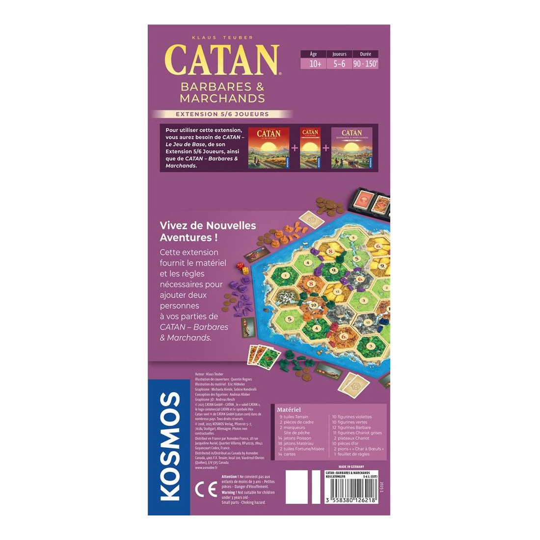 L’île de Catan est désormais couverte de villes et de colonies. Le moment est venu de partir à l’aventure et de vous enrichir ! Jouez à 5 ou 6 joueurs à l'extension Barbares et Marchands de Catan. Exploitez des rivières aurifères, marchandez des poissons fraîchement pêchés et commercez avec les nomades du désert.