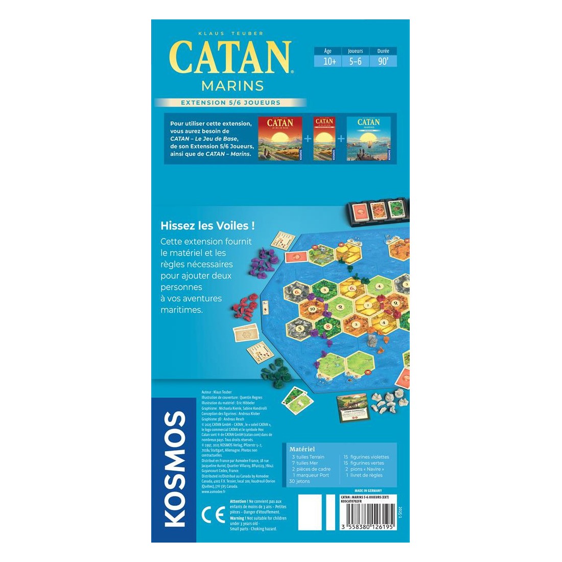 La boîte de base du jeu de plateau Catan est nécessaire, son extension 5-6 joueurs ainsi que l'extension Marins. Contenu :