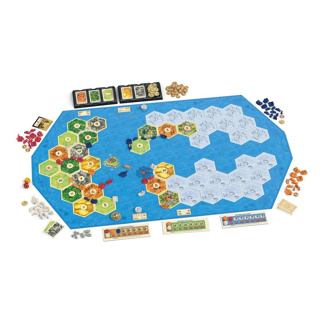 Avec Catan – Pirates & Découvreurs, prenez le large ! Dans cette extension, vos expéditions prennent une nouvelle dimension : navigateurs, vous partez explorer des mers inconnues, découvrir des terres riches en ressources et affronter de redoutables repaires de pirates.À bord de vos bateaux, déplacez vos unités, fondez des colonies portuaires, chargez poissons et épices pour remplir vos cales et amasser gloire et fortune.