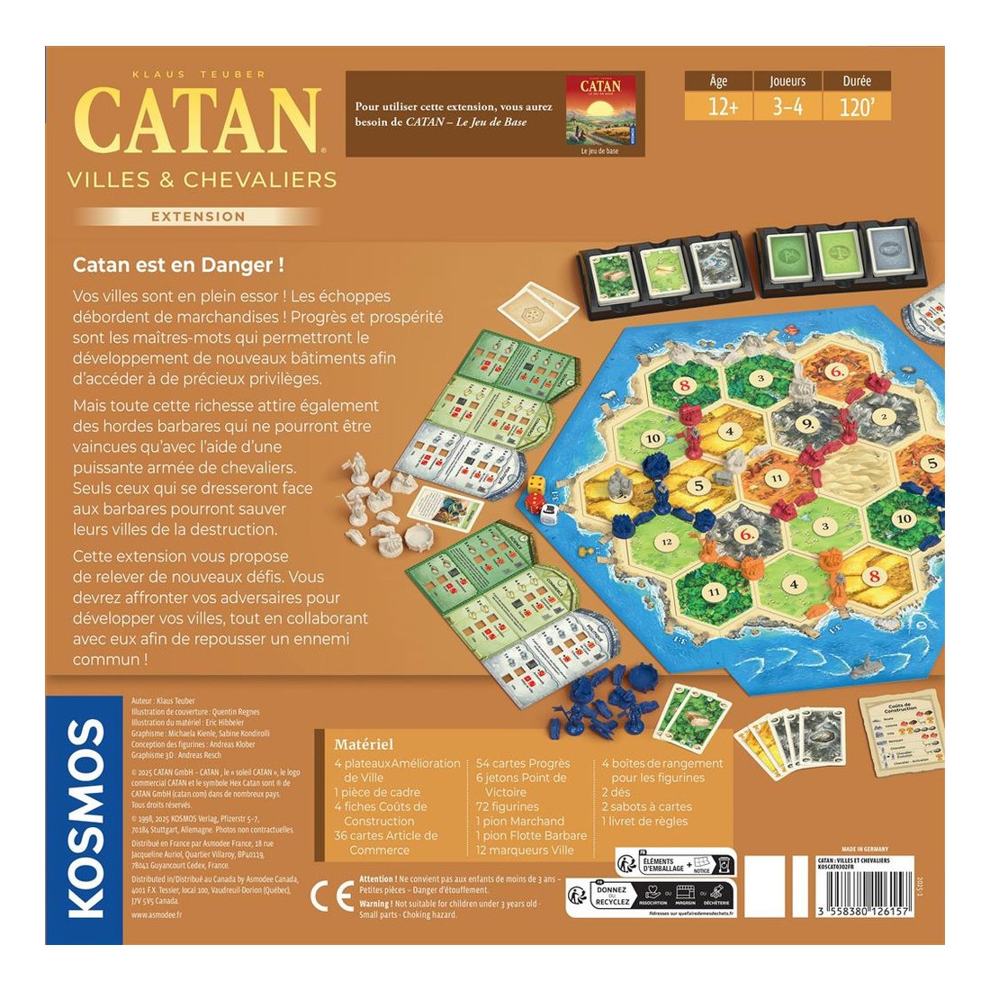 Recrutez une puissante armée de chevaliers et coopérez pour repousser ces envahisseurs. Seuls les plus courageux pourront sauver leurs villes de la destruction. Cette extension apporte une nouvelle dimension au jeu de base Catan. En plus de rivaliser entre vous pour développer vos villes, vous devrez vous allier et joindre vos forces afin de repousser un ennemi commun.